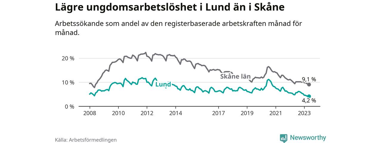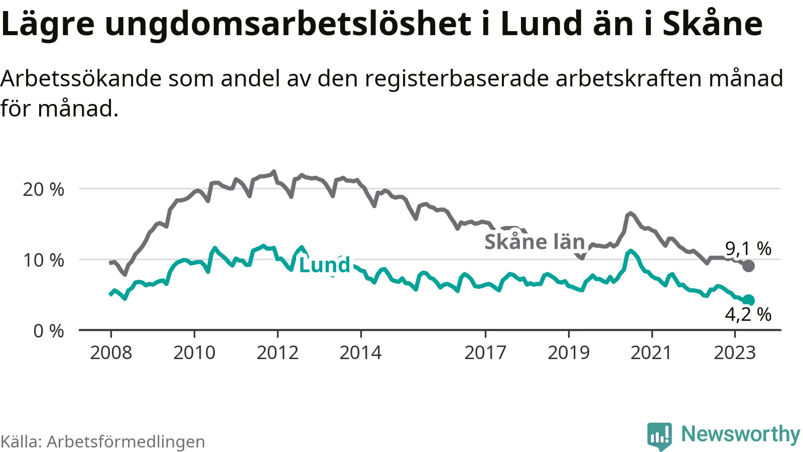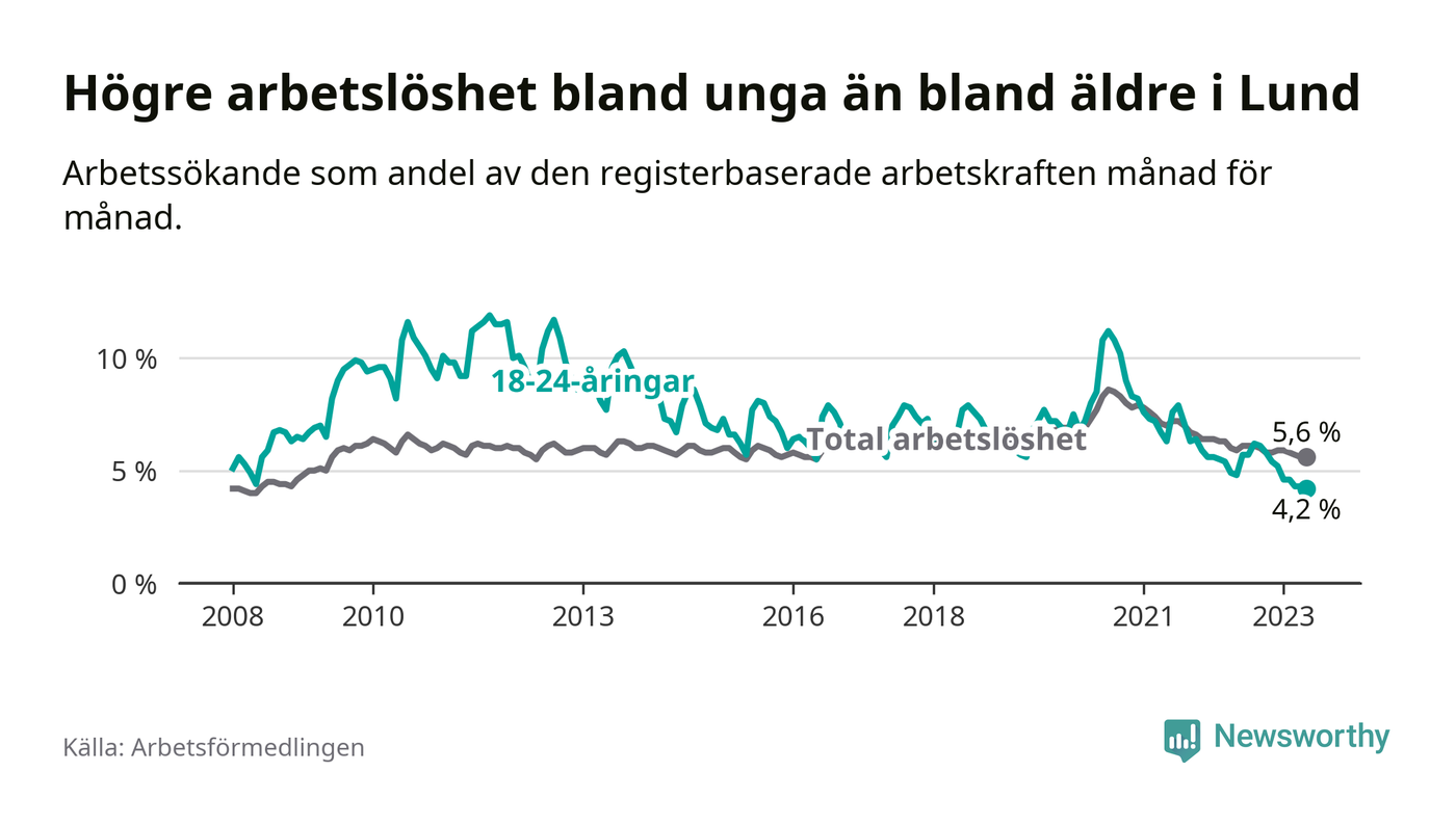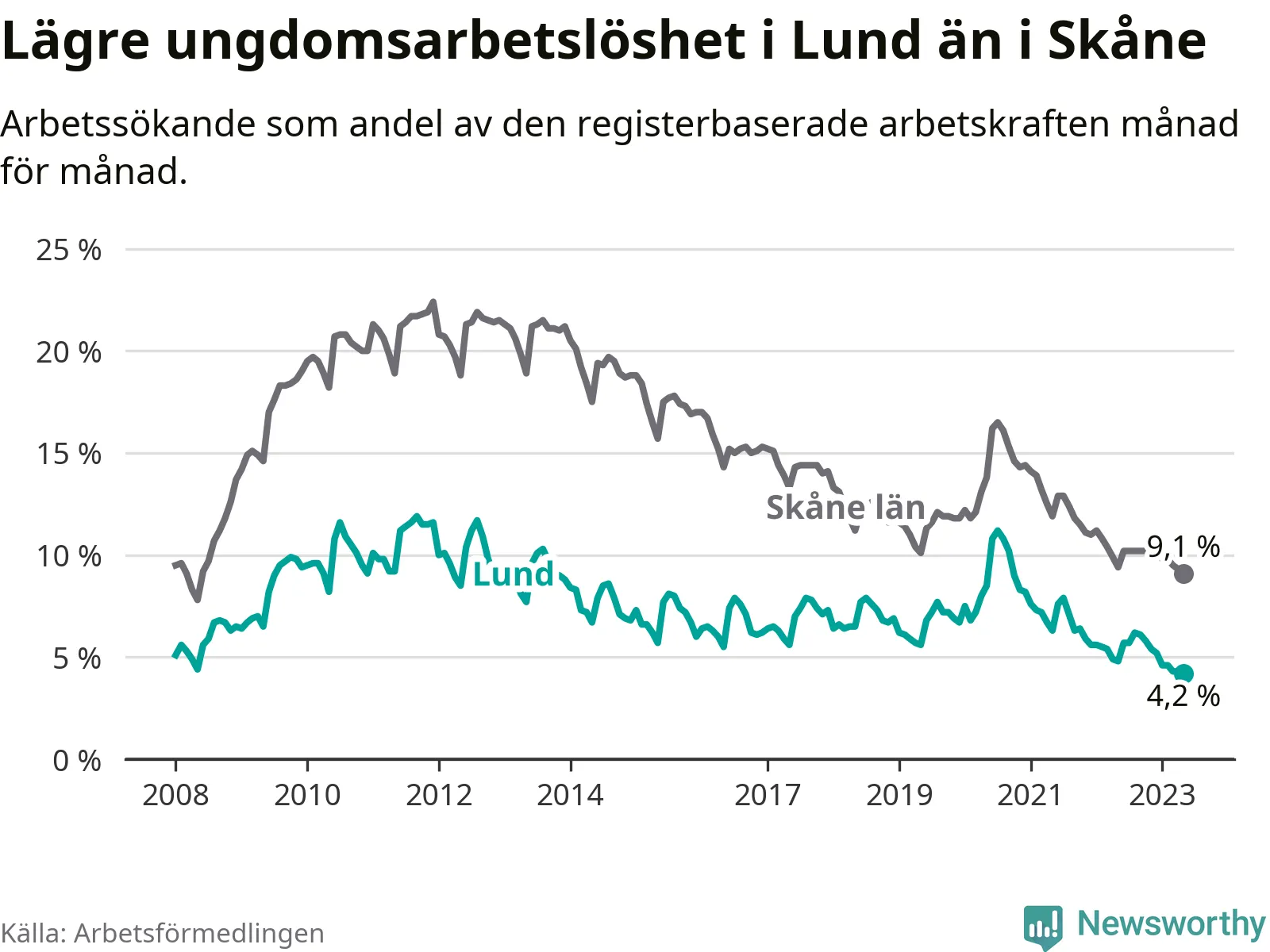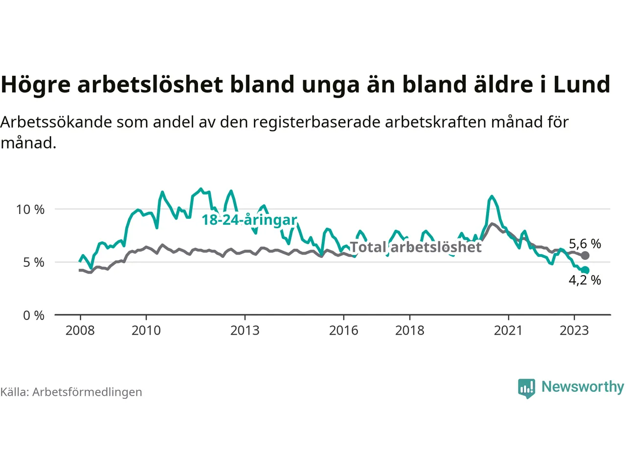 I och med den senaste månadens nedgång har de ungas arbetslöshet i Lund sjunkit över två år i sträck (ner från 7,2 procent i mars 2021 till 4,2 procent nu). Den nuvarande arbetslöshetsnivån är den lägsta sedan januari 2008.