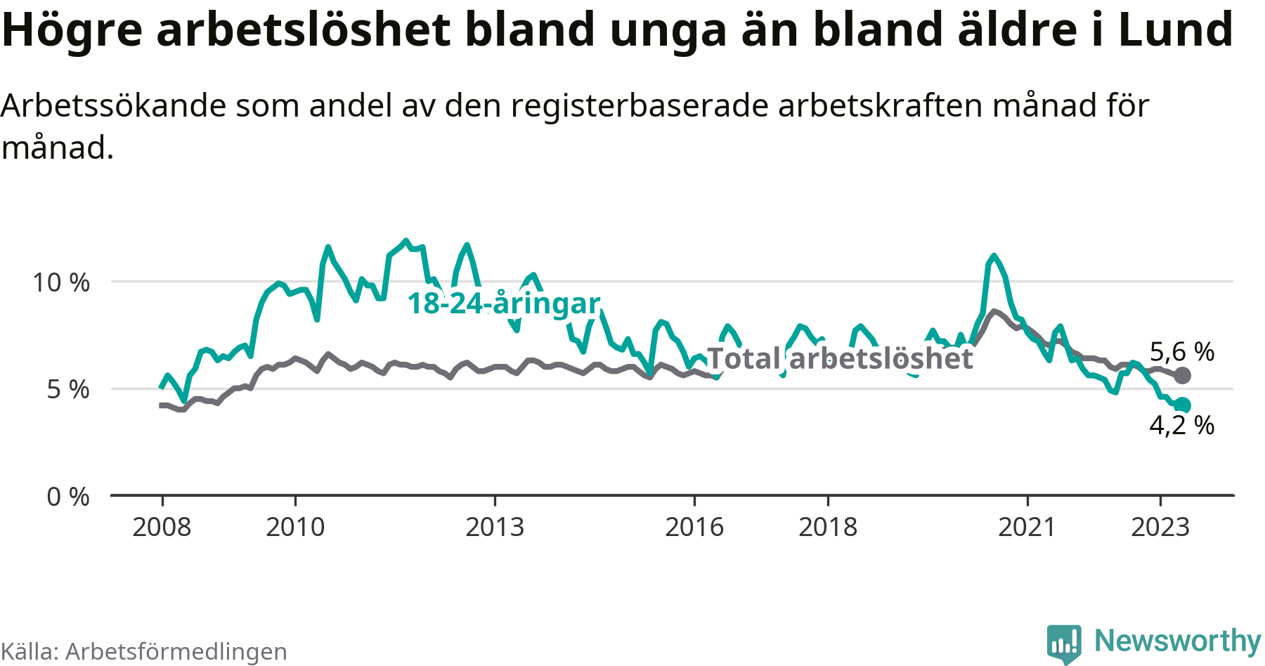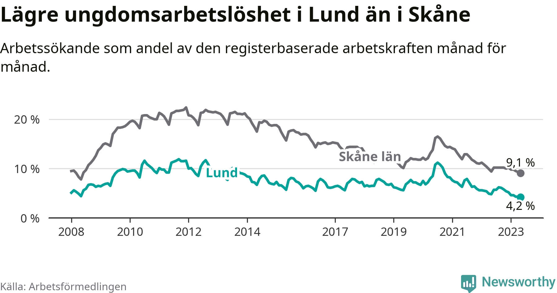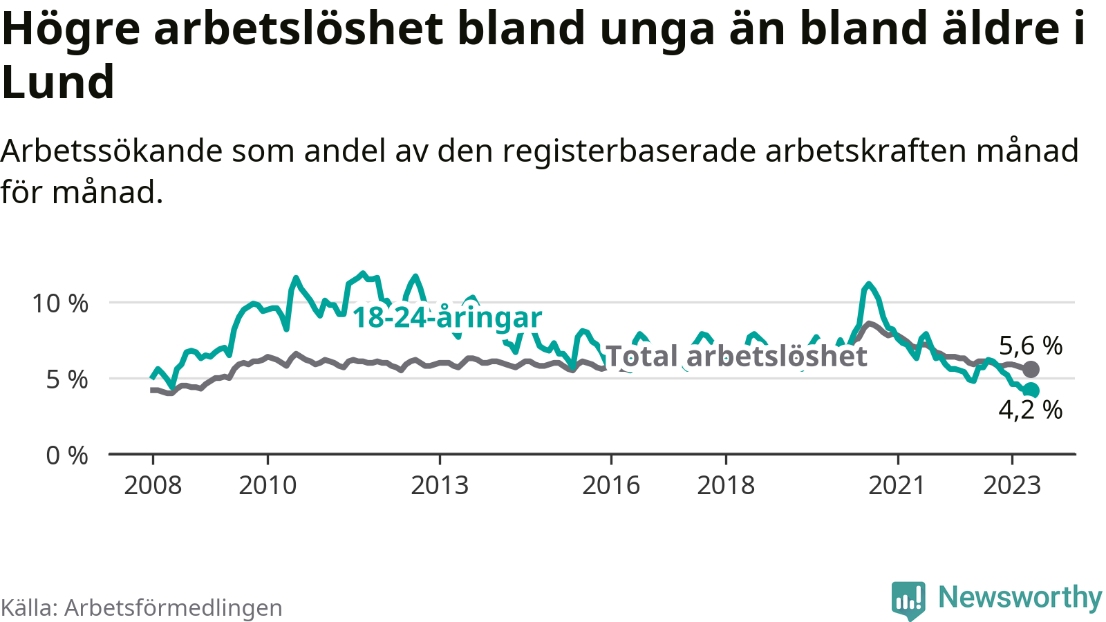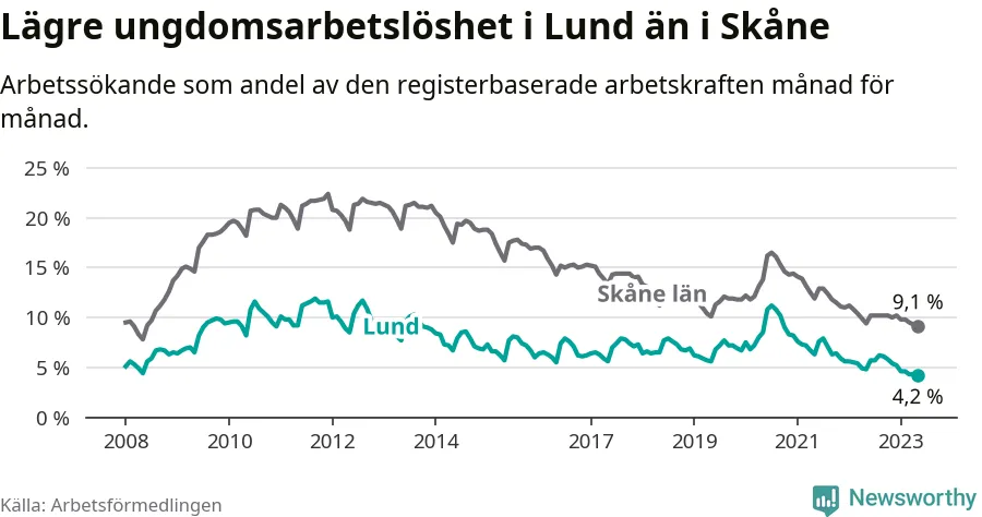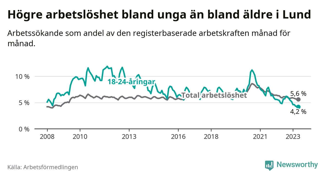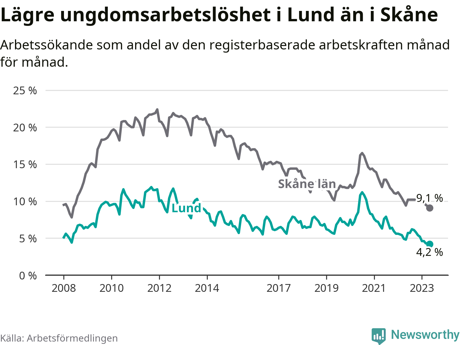 I och med den senaste månadens nedgång har de ungas arbetslöshet i Lund sjunkit över två år i sträck (ner från 7,2 procent i mars 2021 till 4,2 procent nu). Den nuvarande arbetslöshetsnivån är den lägsta sedan januari 2008.