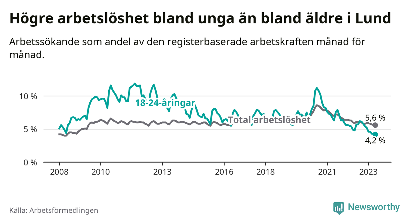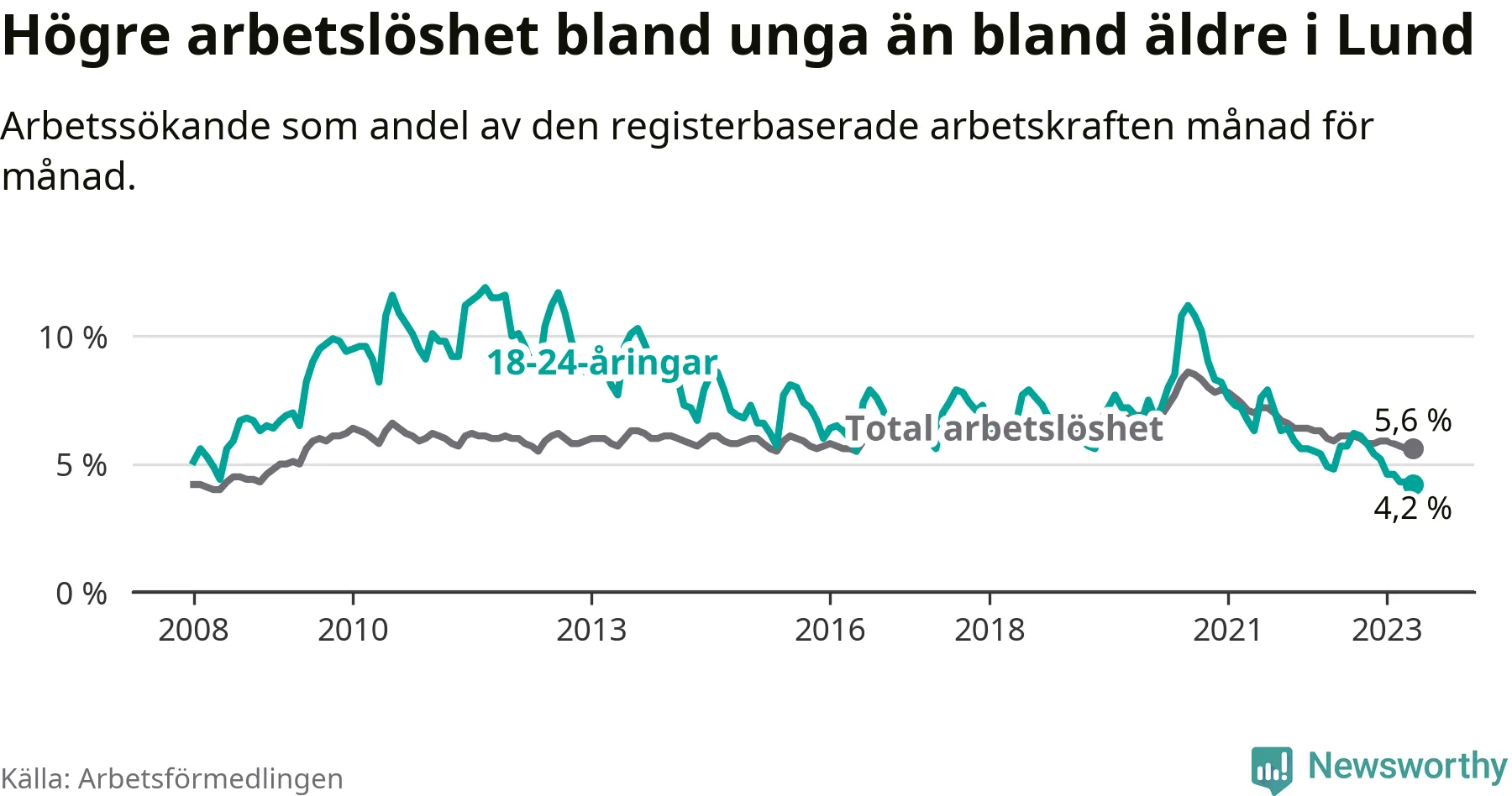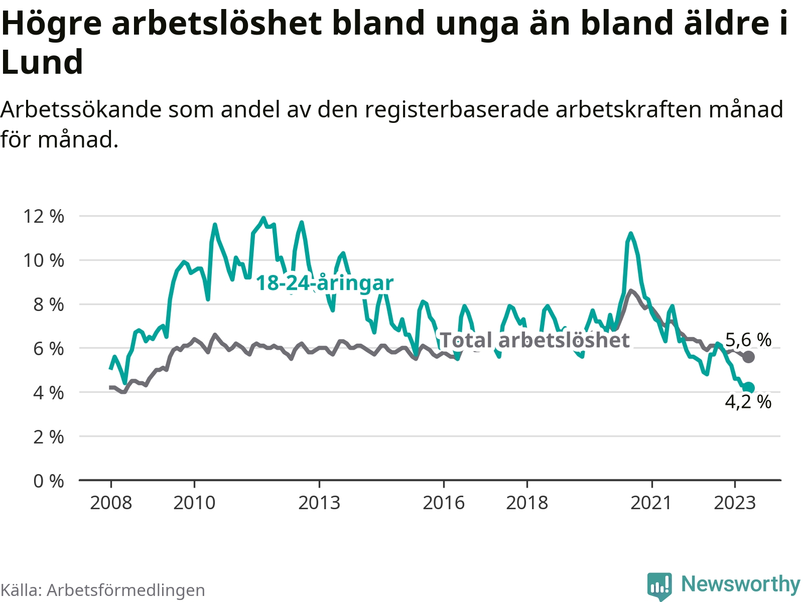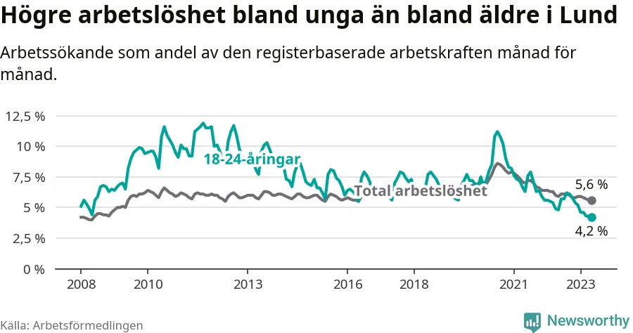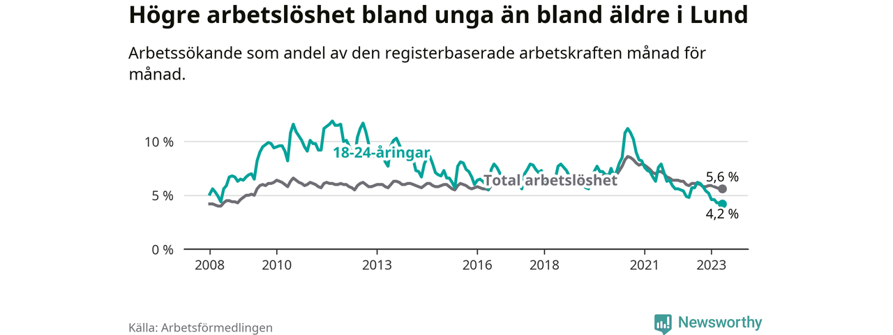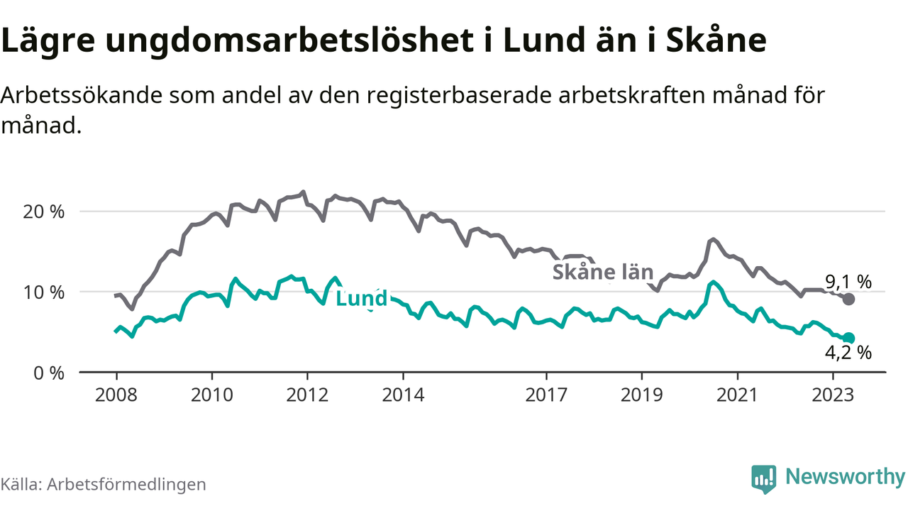 I och med den senaste månadens nedgång har de ungas arbetslöshet i Lund sjunkit över två år i sträck (ner från 7,2 procent i mars 2021 till 4,2 procent nu). Den nuvarande arbetslöshetsnivån är den lägsta sedan januari 2008.