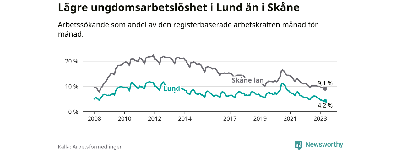 Precis som den totala arbetslösheten ligger ungdomsarbetslösheten i Lund lägre än i Skåne som helhet. Skillnaden mellan kommunen och länet är 4,9 procentenheter.
