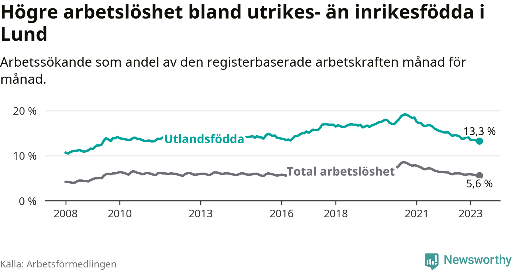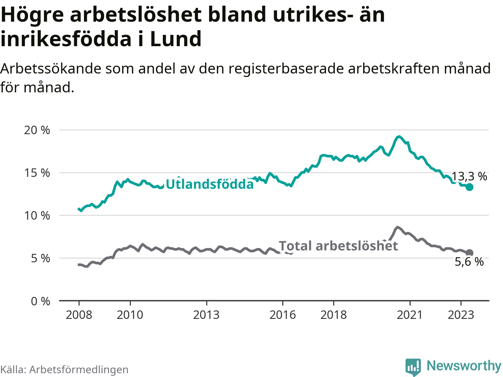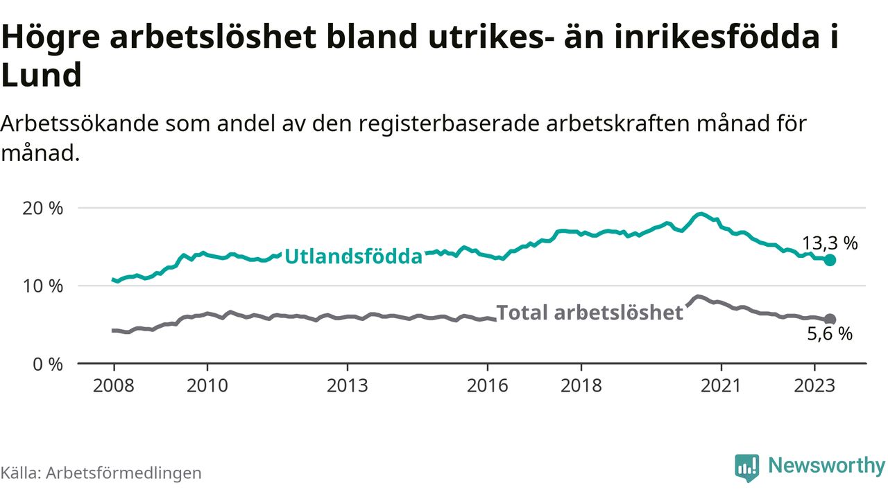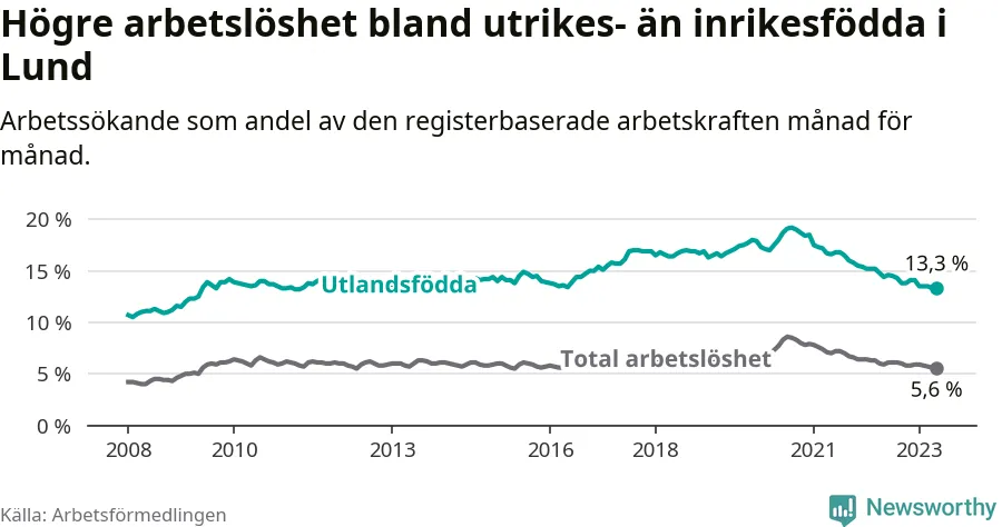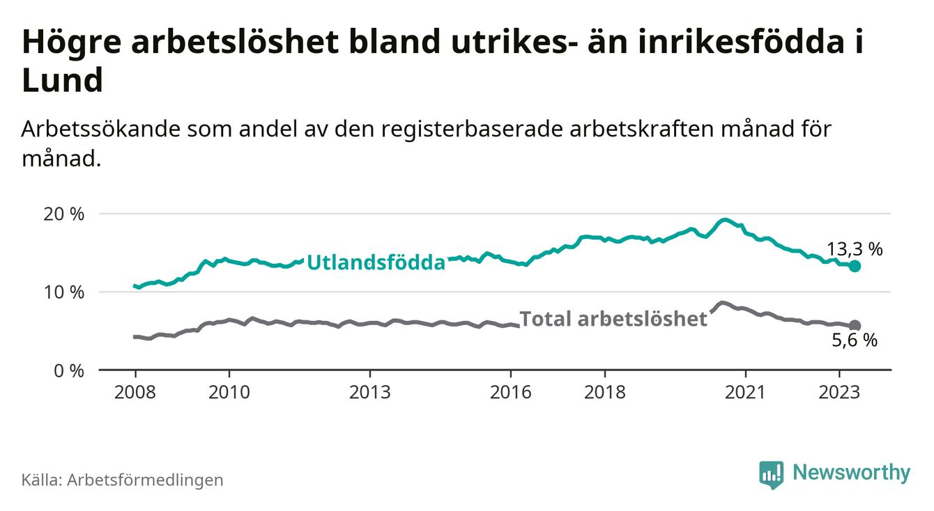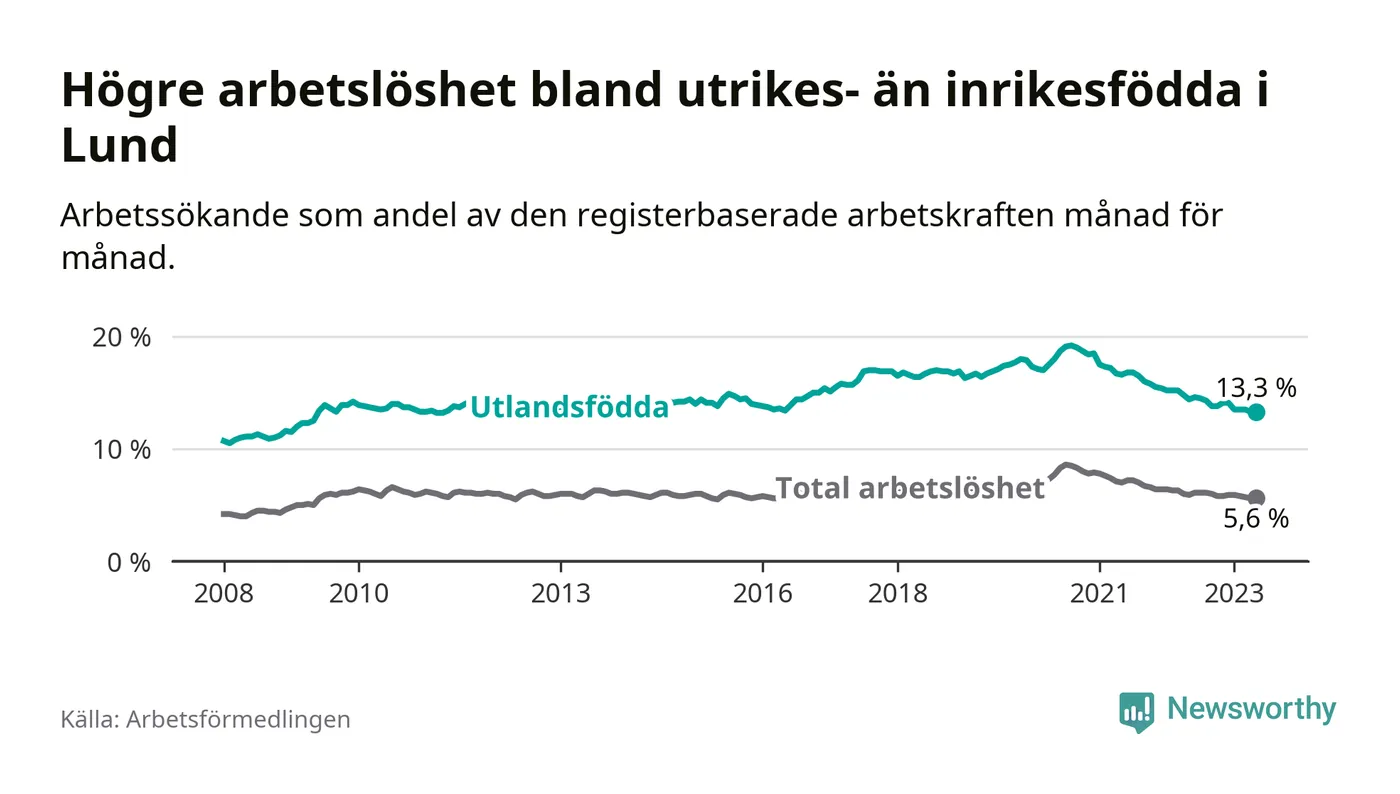Arbetslösheten bland utlandsfödda var 13,3 procent i Lund under maj månad, motsvarande 1 977 av 14 865 personer. Det är 1,1 procentenheter färre än vid samma tidpunkt i fjol (−42 om man räknar personer). Därmed har de utlandsföddas arbetslöshet varit lägre än vid samma tidpunkt i fjol i över två år i sträck. Sedan mars 2021 har arbetslösheten bland utlandsfödda minskat från 17,2 till 13,3 procent.