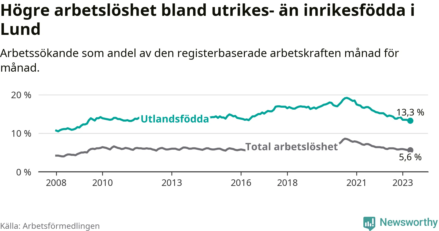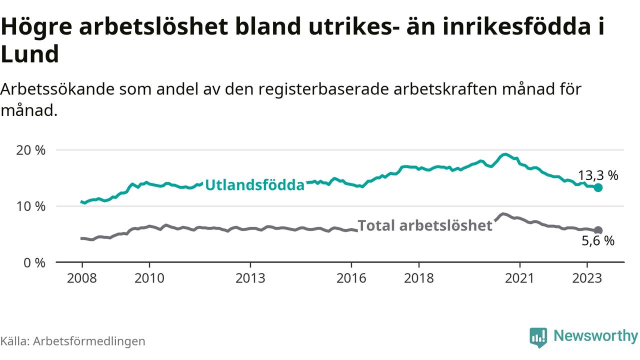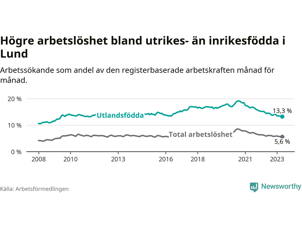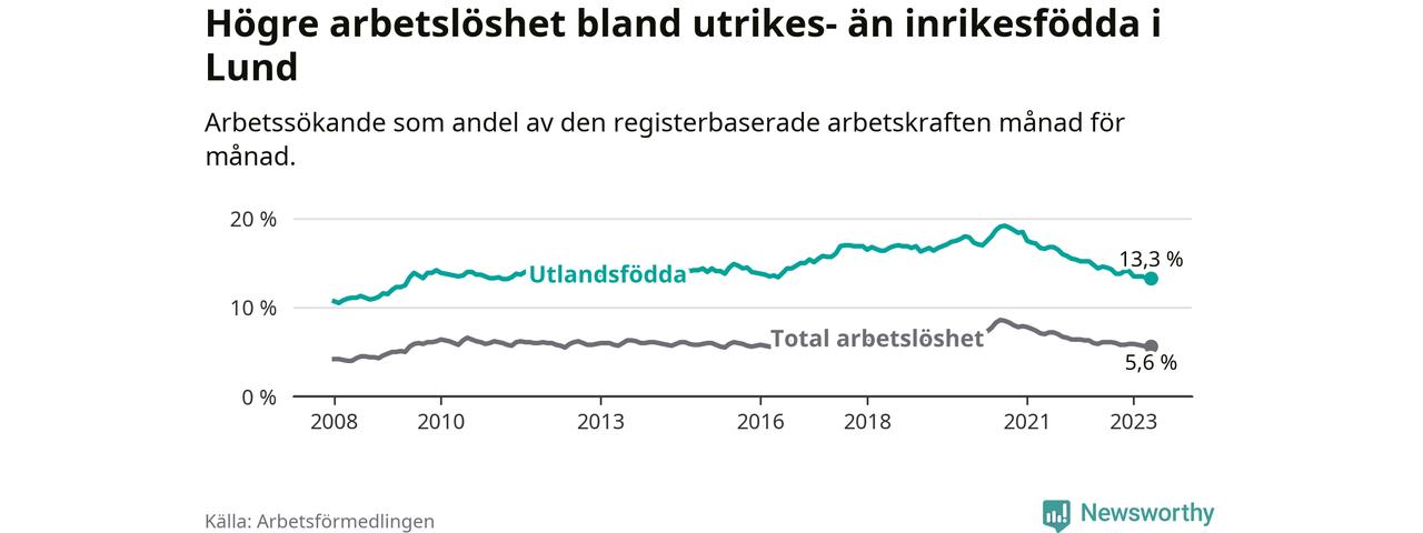 Skillnaden i arbetslöshet mellan utrikesfödda och hela befolkningen är 7,7 procentenheter i Lund. Det är en mindre skillnad än för ett år sedan (−0,8 procentenheter).