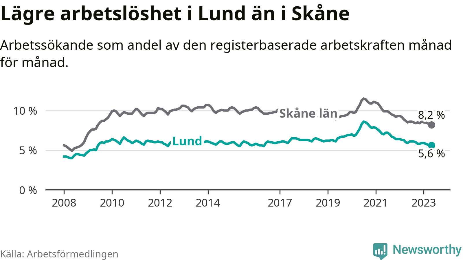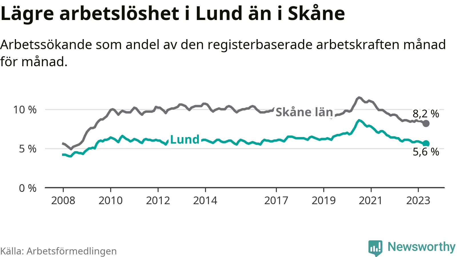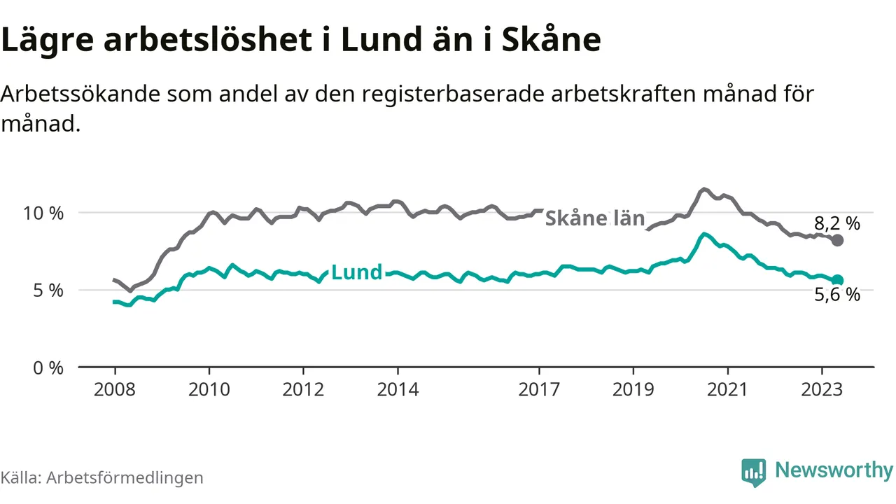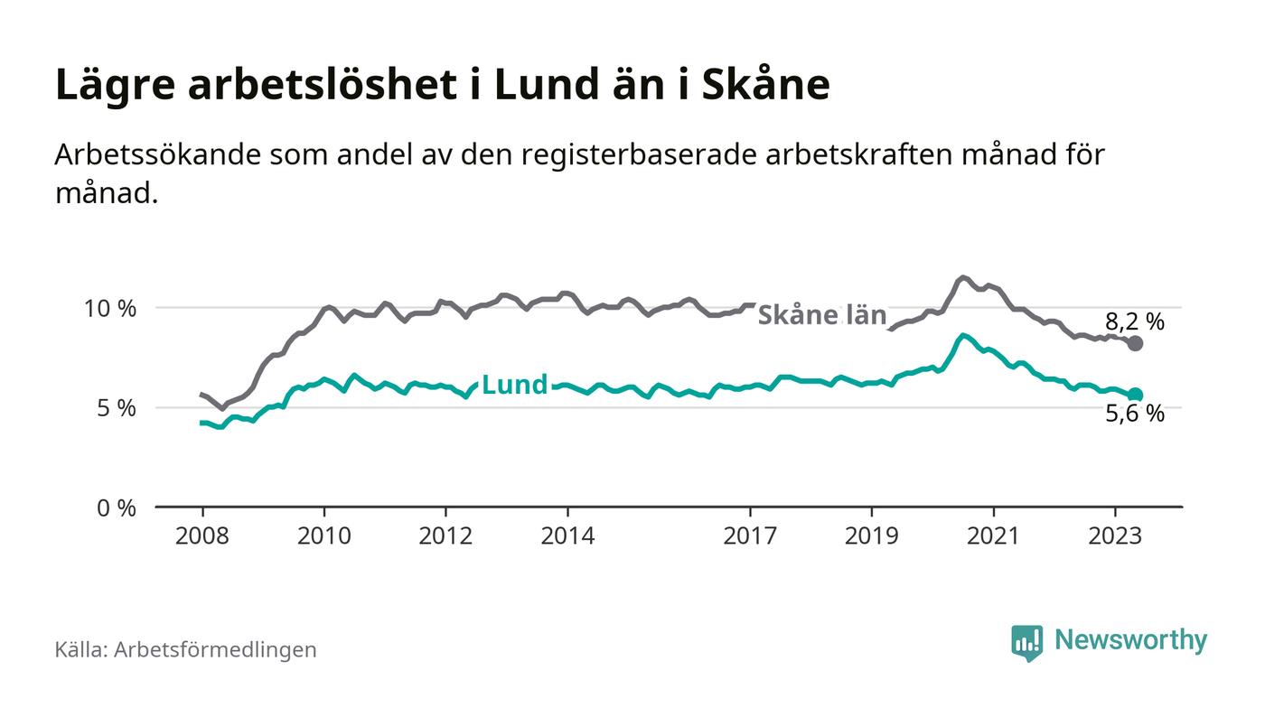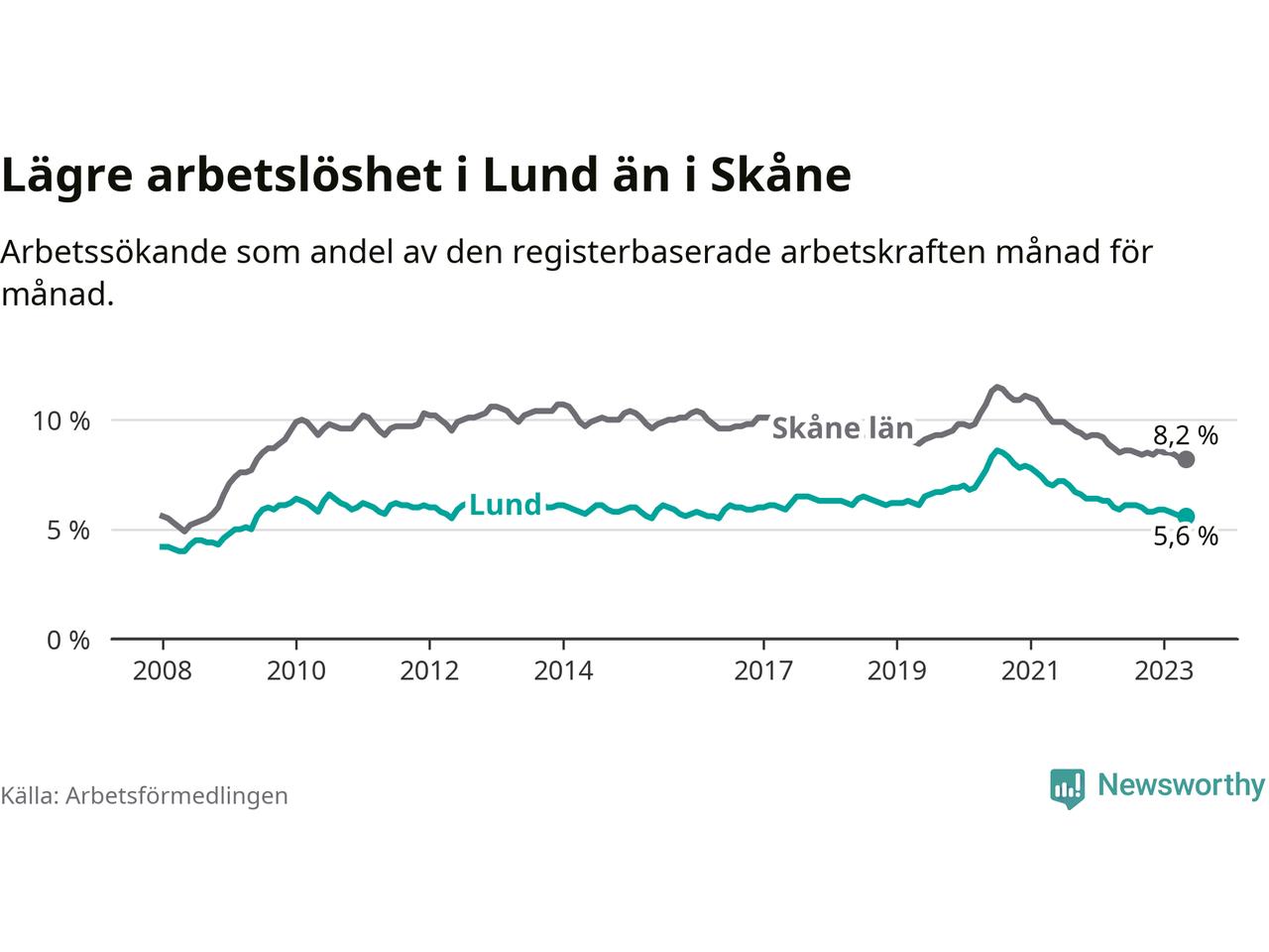 Under maj månad rapporterade Lunds kommun en total arbetslöshet på 5,6 procent. Det är en minskning jämfört med samma tidpunkt i fjol (−0,3 procentenheter). Även i Skåne län sjunker arbetslösheten .