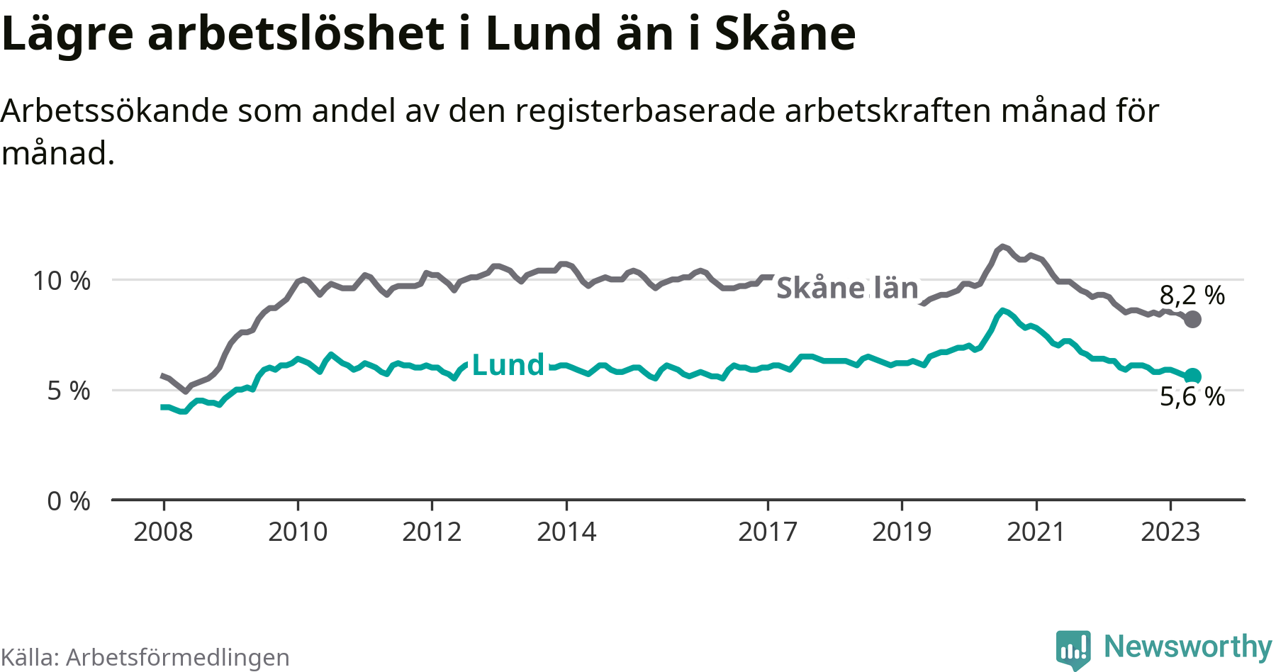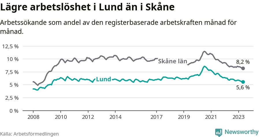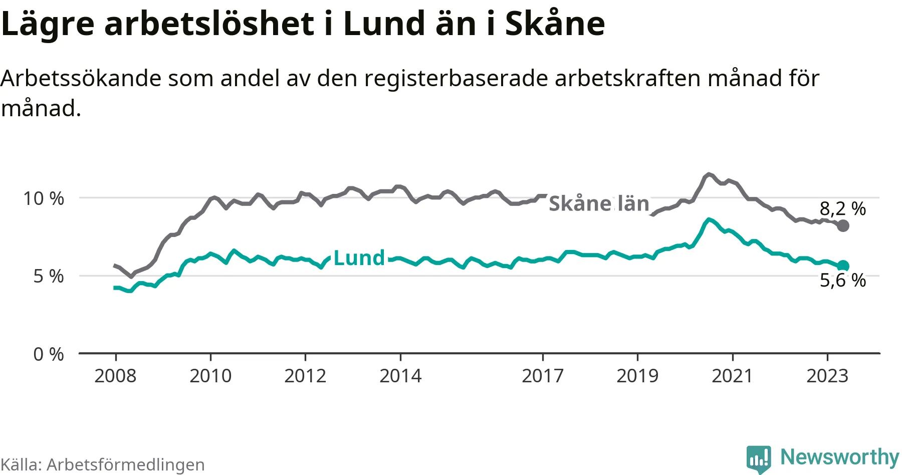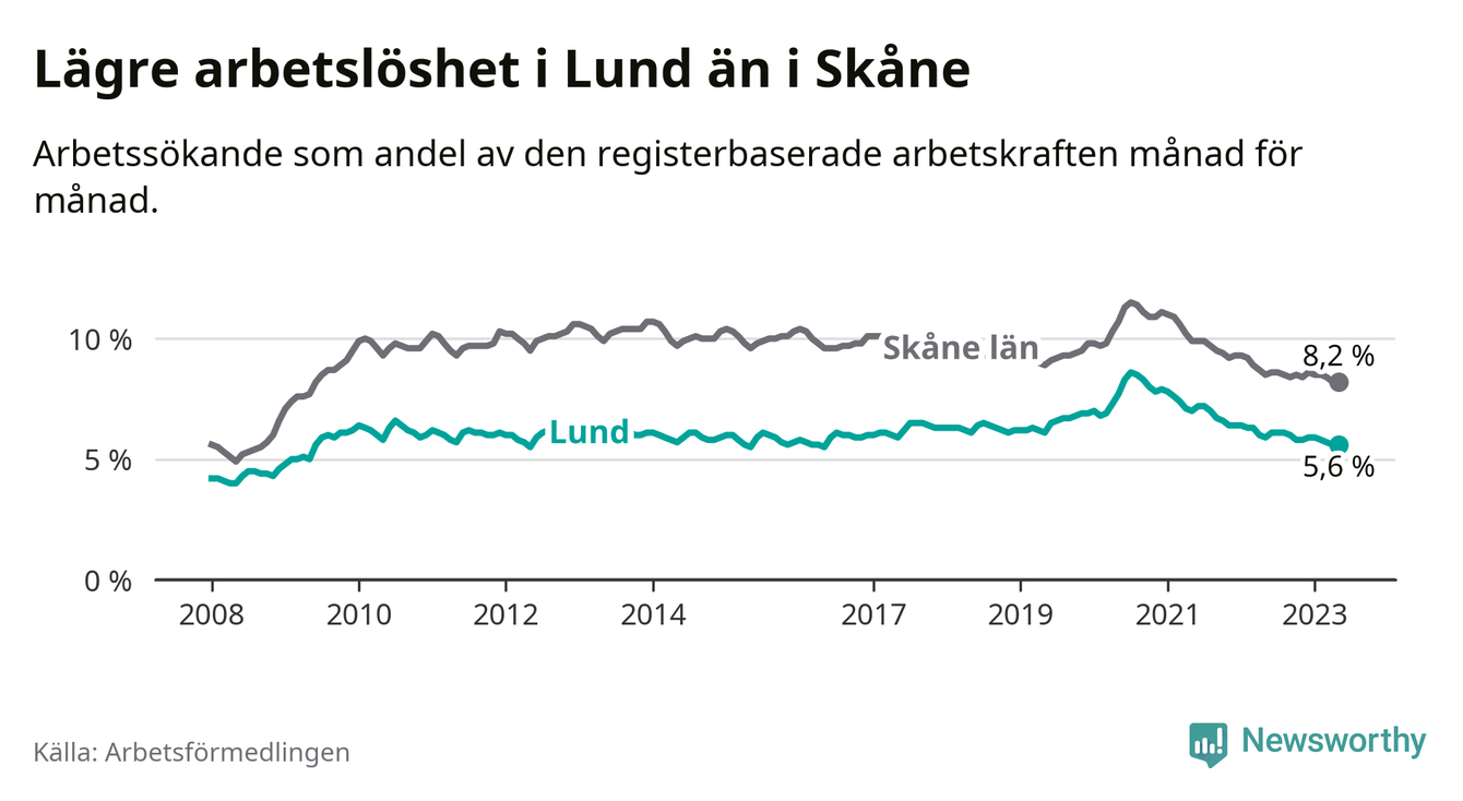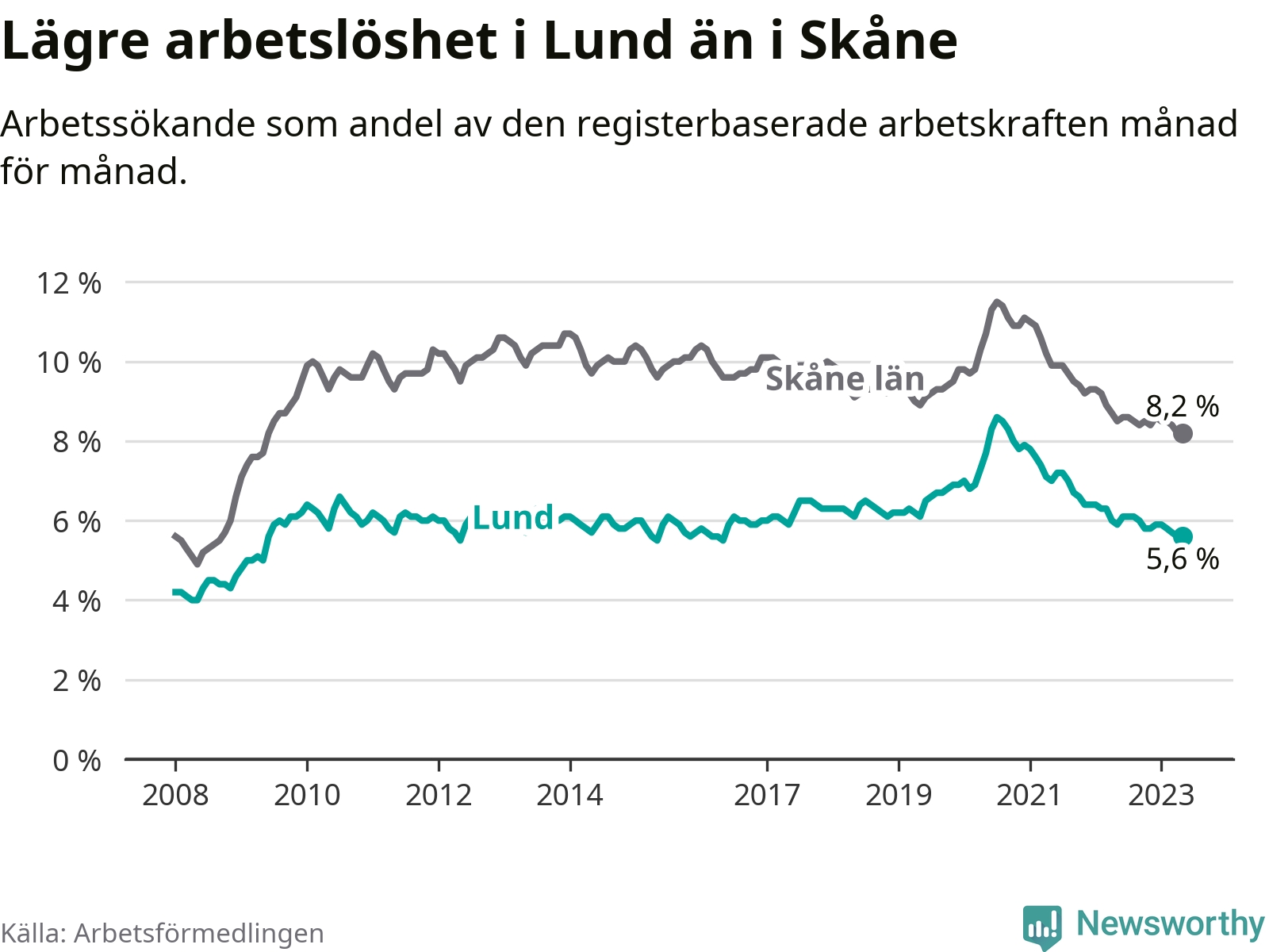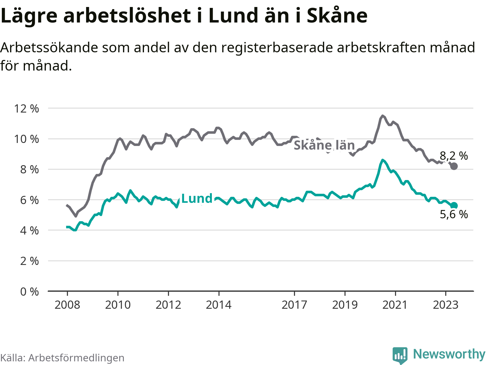 Under maj månad rapporterade Lunds kommun en total arbetslöshet på 5,6 procent. Det är en minskning jämfört med samma tidpunkt i fjol (−0,3 procentenheter). Även i Skåne län sjunker arbetslösheten .