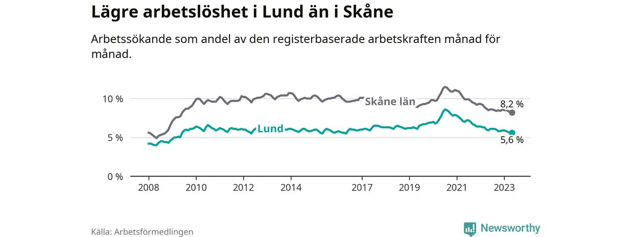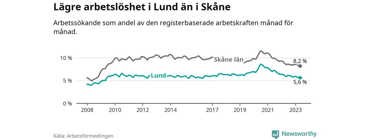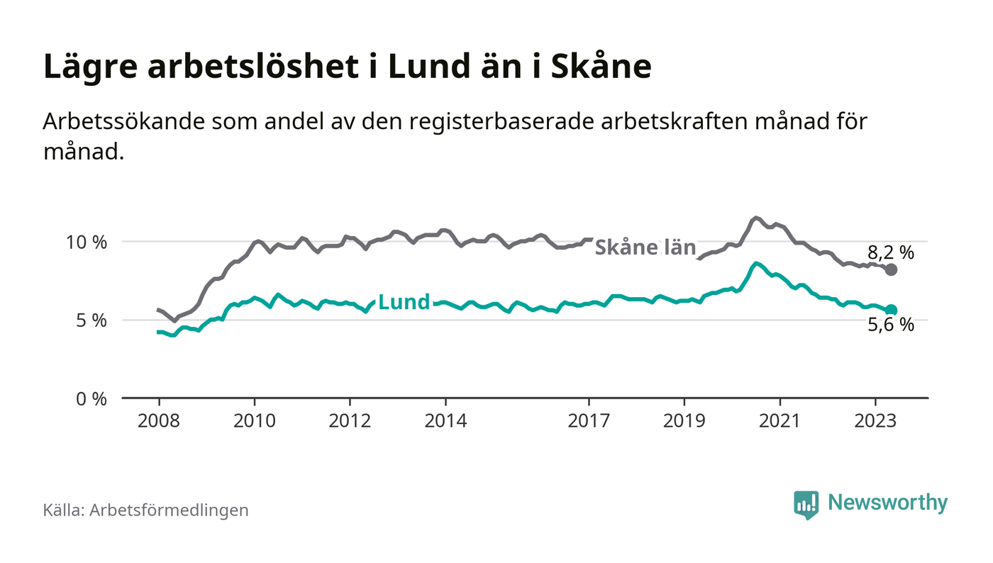 Det är 26:e månaden i följd som arbetslösheten i Lund är lägre än den var under samma tidpunkt året innan. Sedan mars 2021 har arbetslösheten gått ner från 7,4 till 5,6 procent.