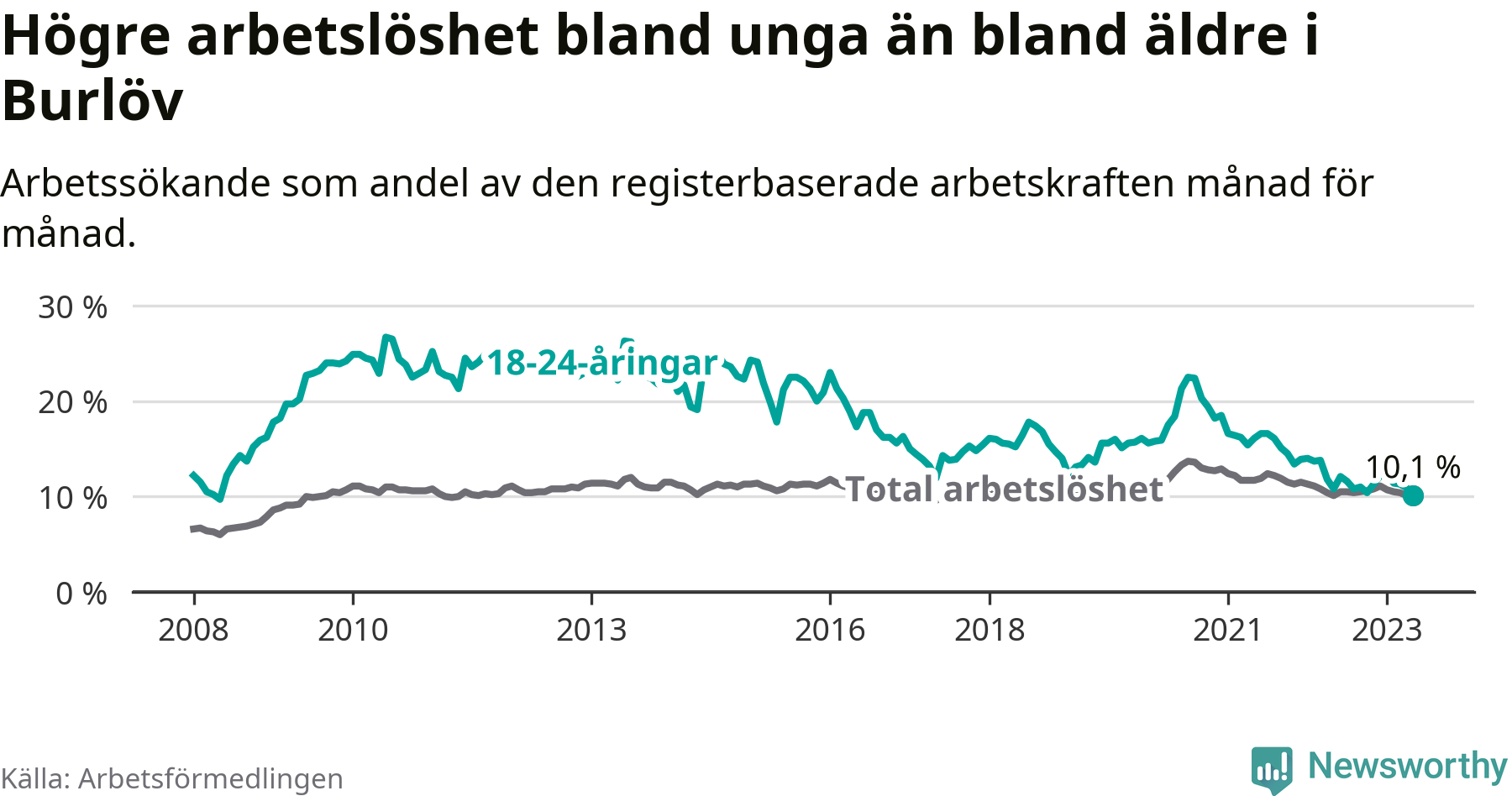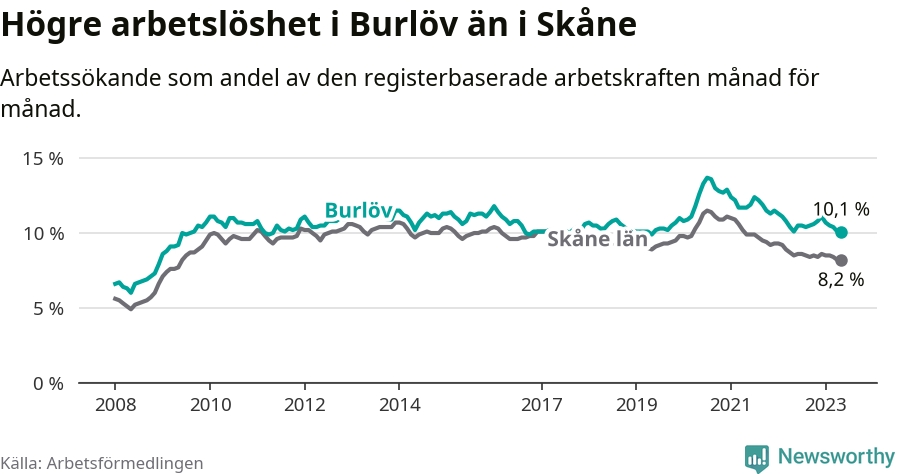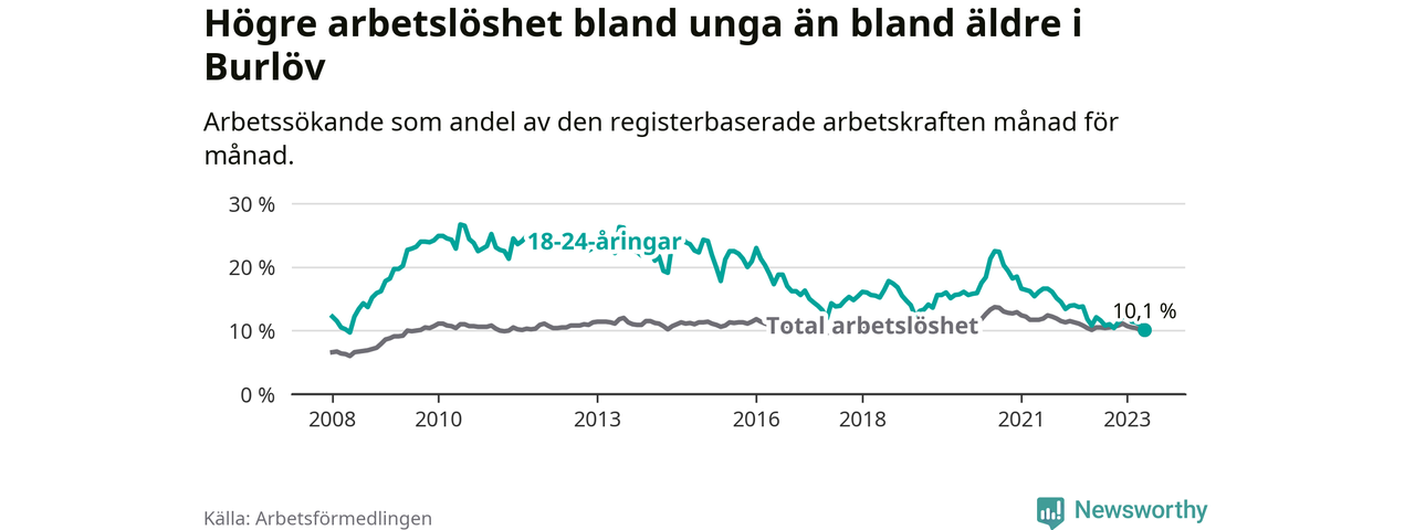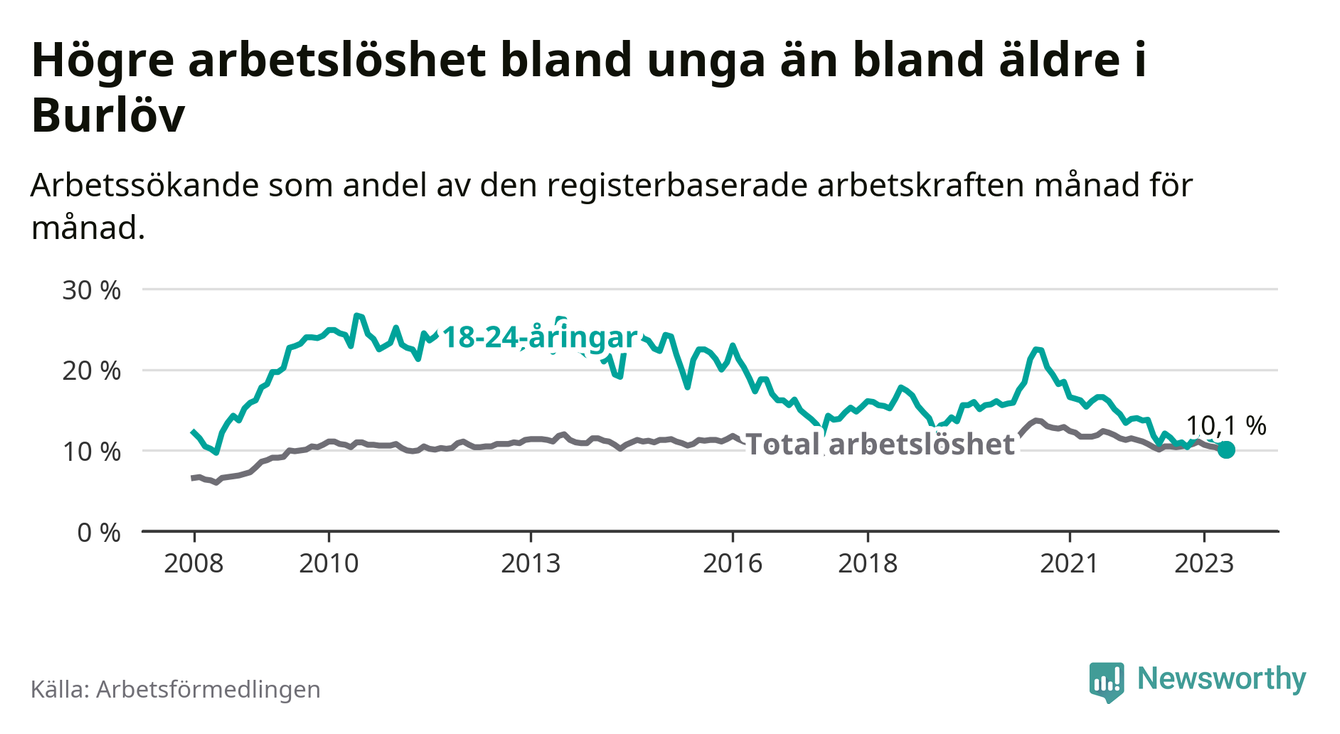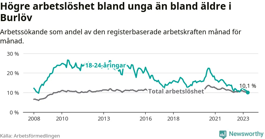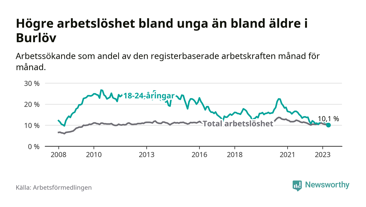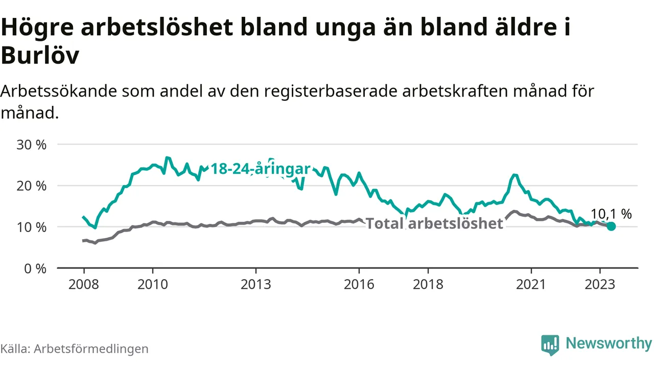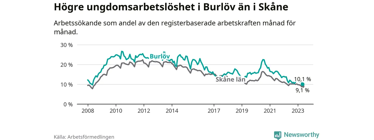 I och med den senaste månadens nedgång har de ungas arbetslöshet i Burlöv sjunkit över två år i sträck (ner från 16,2 procent i mars 2021 till 10,1 procent nu). Den nuvarande arbetslöshetsnivån är den lägsta sedan maj 2008.