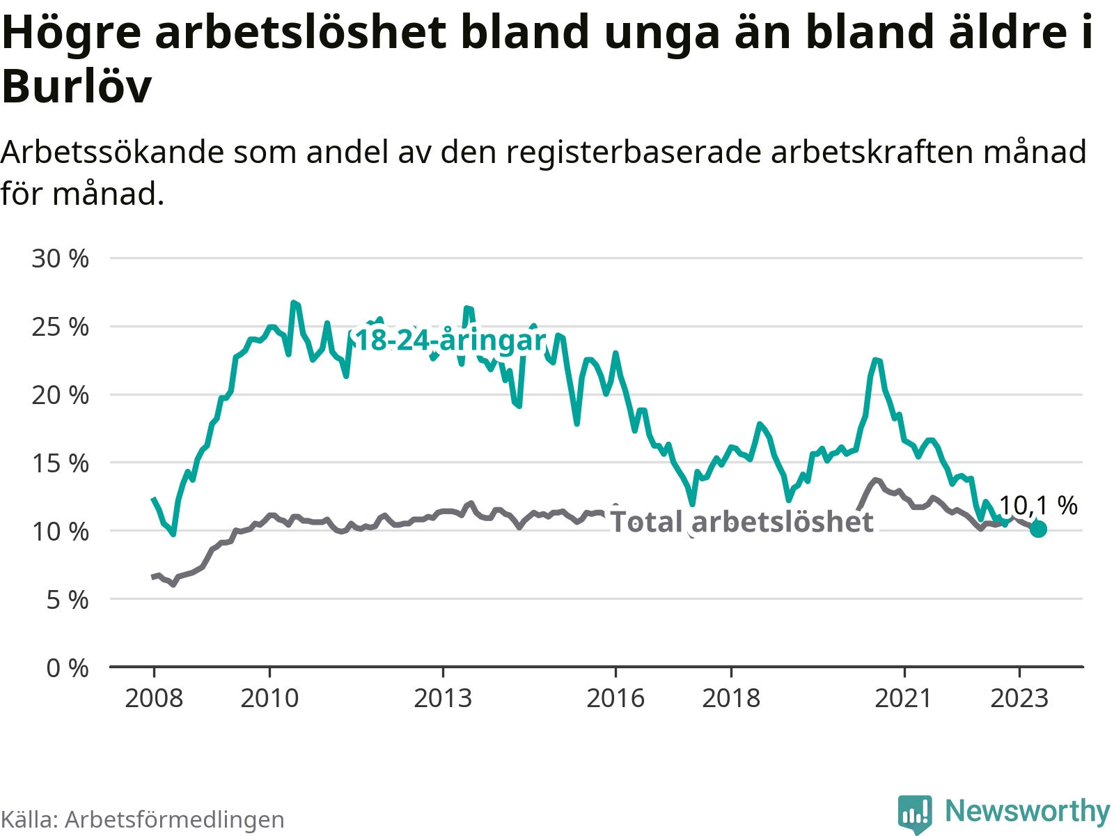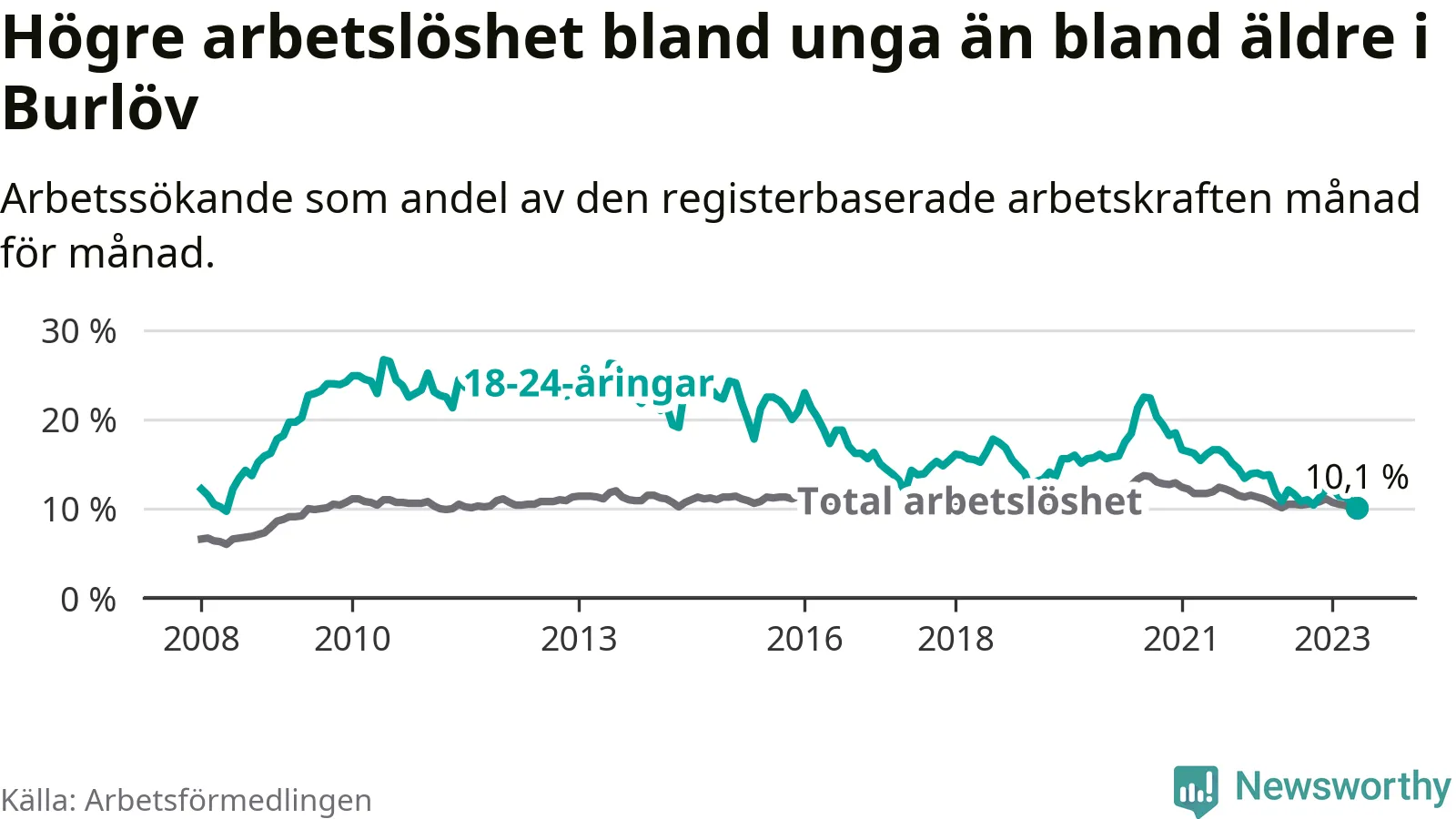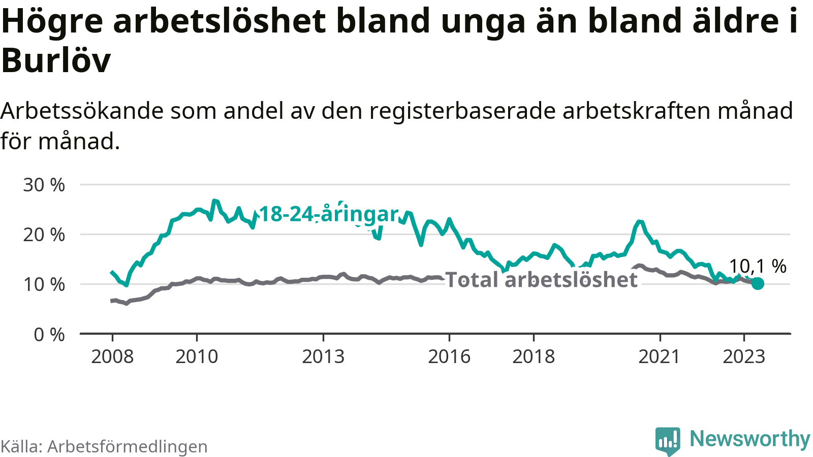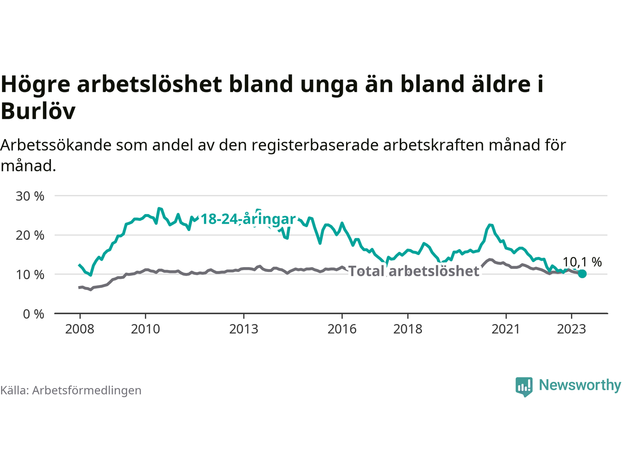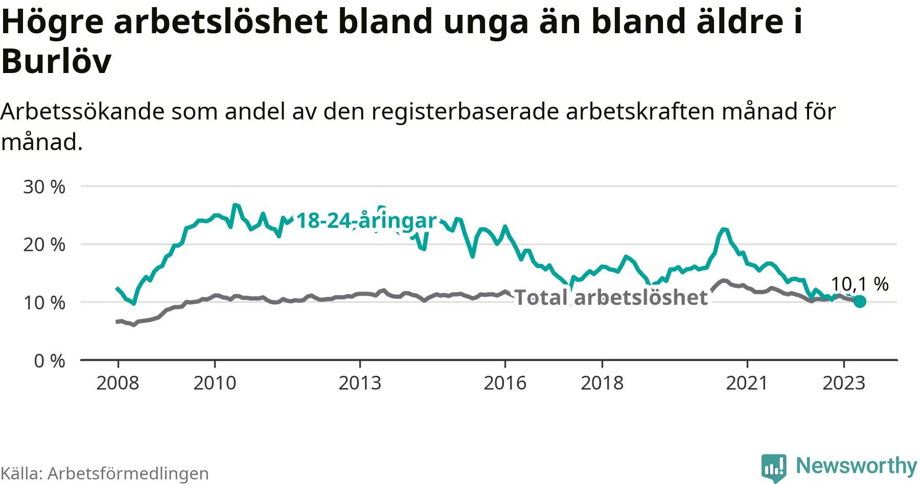 I och med den senaste månadens nedgång har de ungas arbetslöshet i Burlöv sjunkit över två år i sträck (ner från 16,2 procent i mars 2021 till 10,1 procent nu). Den nuvarande arbetslöshetsnivån är den lägsta sedan maj 2008.