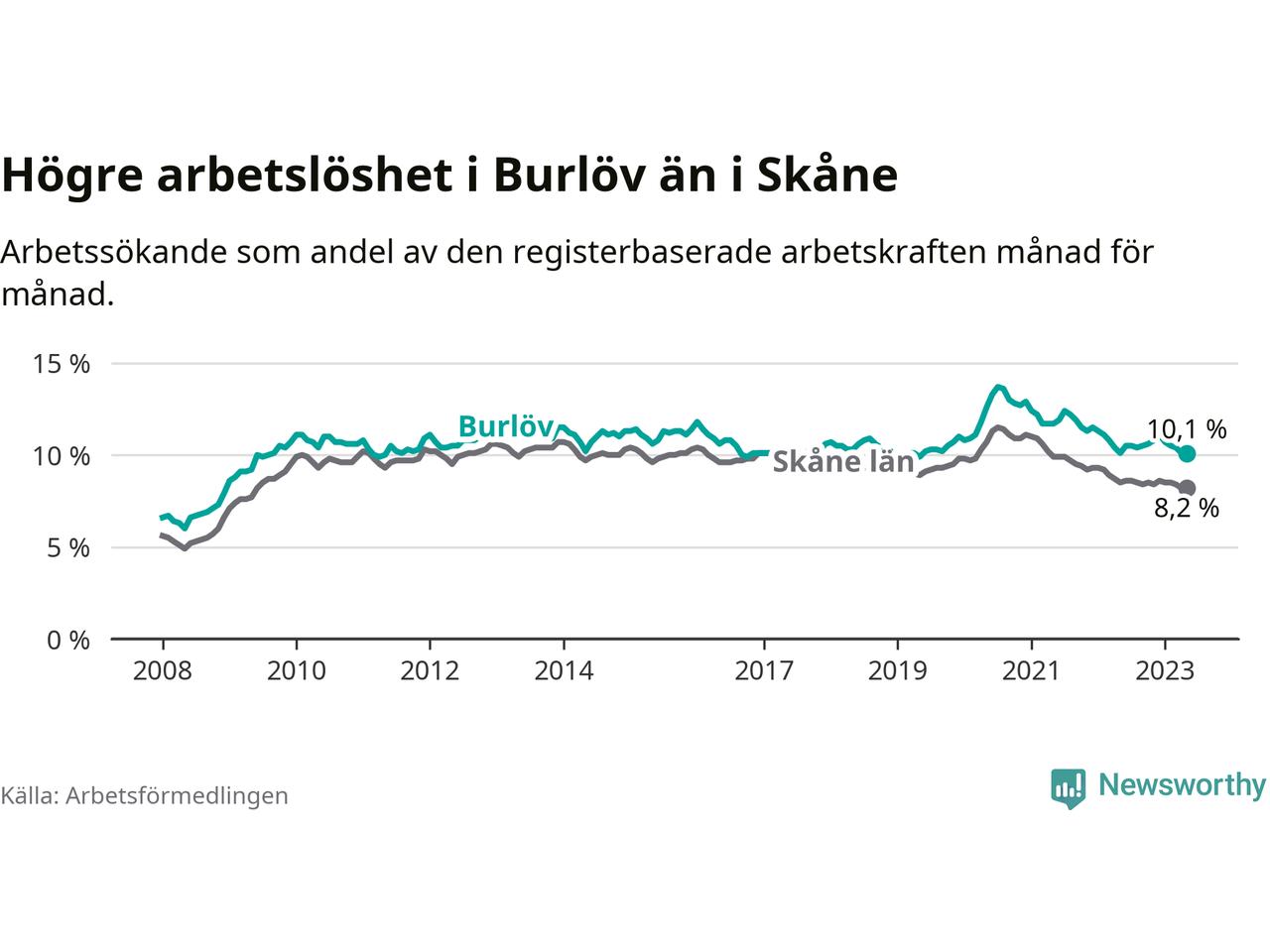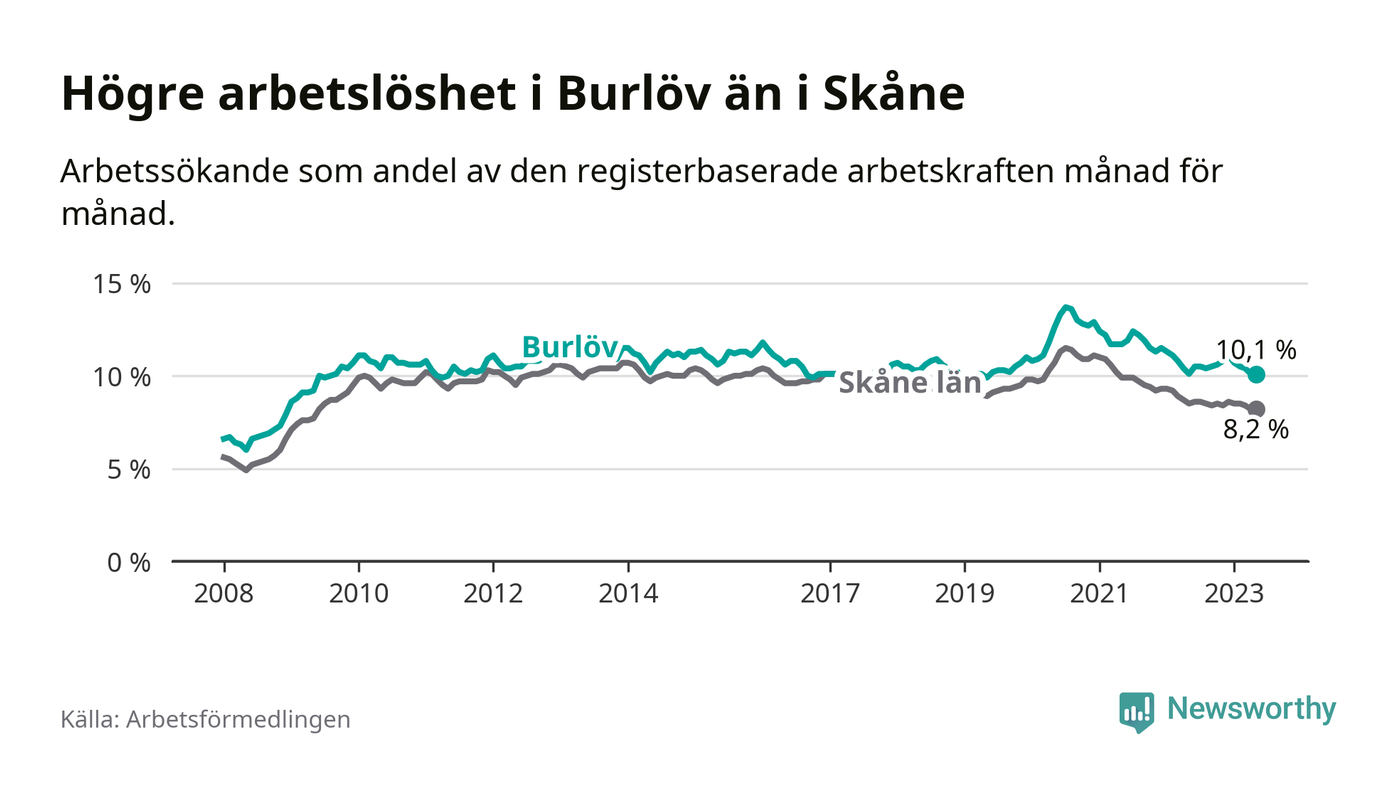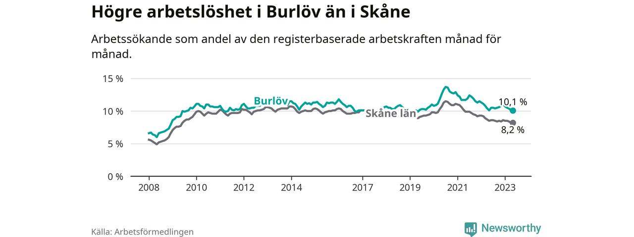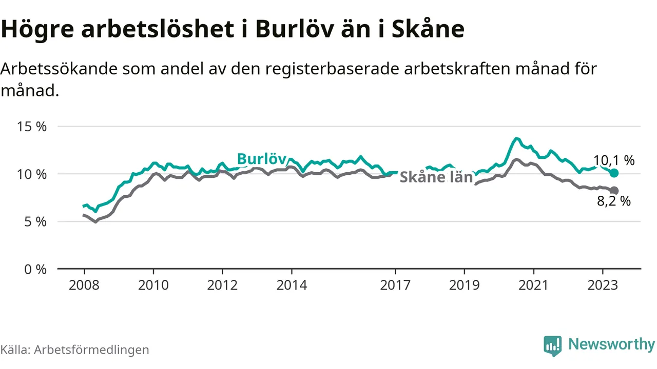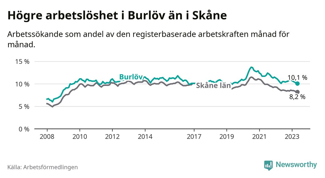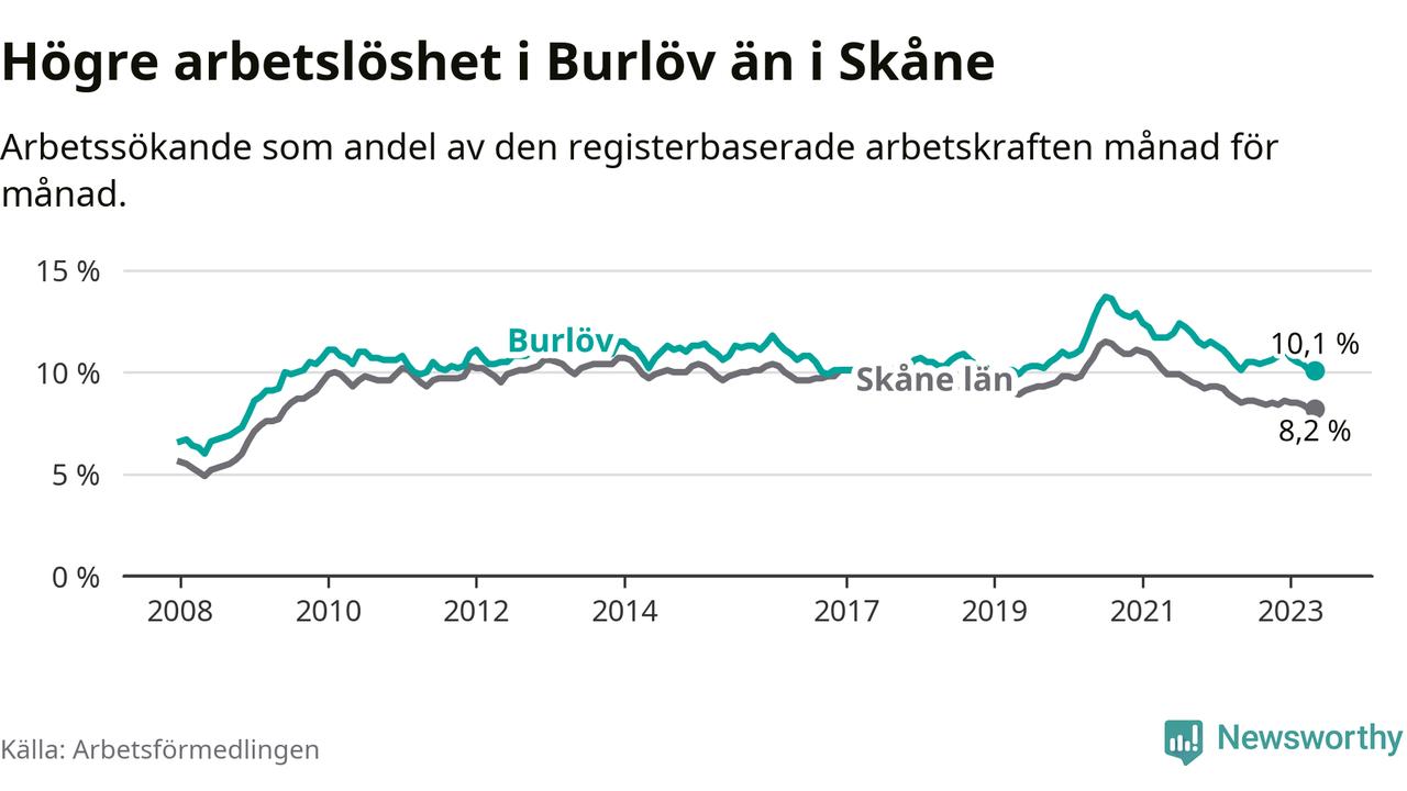 Under maj månad rapporterade Burlövs kommun en total arbetslöshet på 10,1 procent. Det är i samma nivå som i maj i fjol. I Skåne län däremot sjunker arbetslösheten