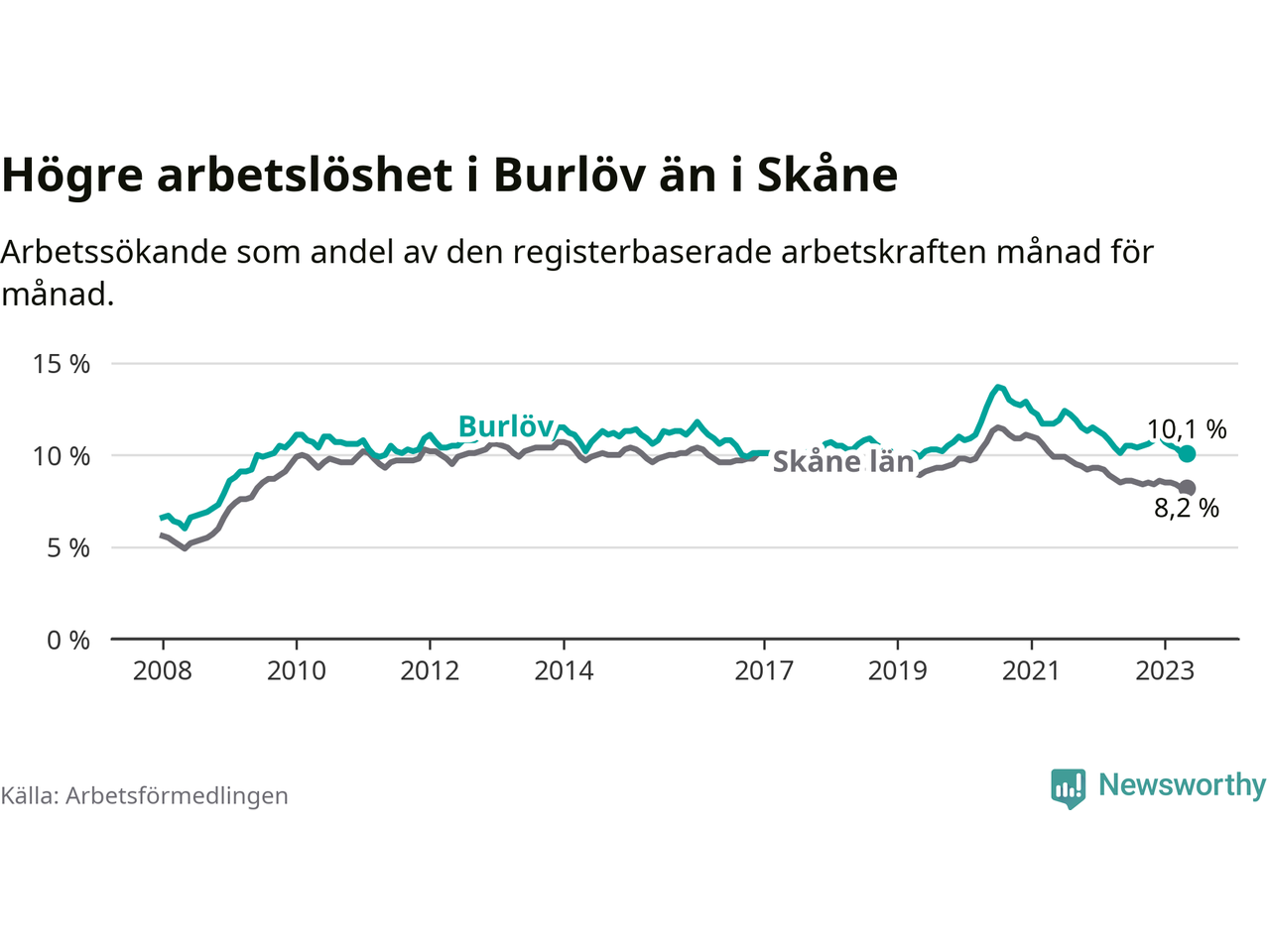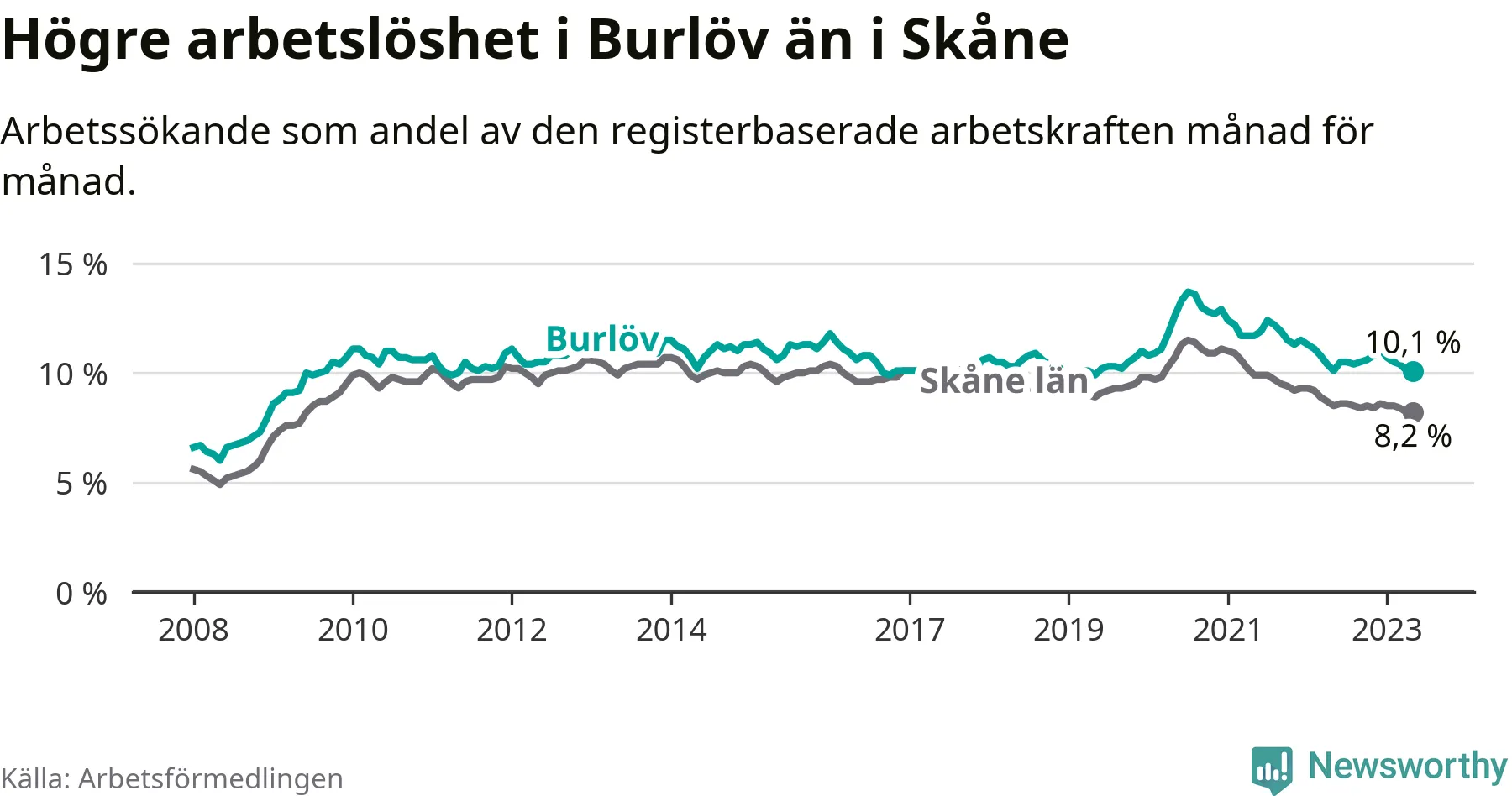 Perstorp är den kommun som har högst arbetslöshet just nu (11,8 procent) i landet som helhet, medan Kiruna har den lägsta (2,3 procent). Burlövs arbetslöshet sticker ut som den sjunde högsta i hela landet.