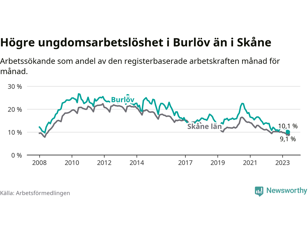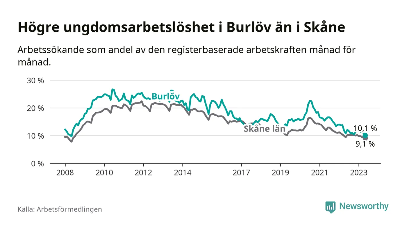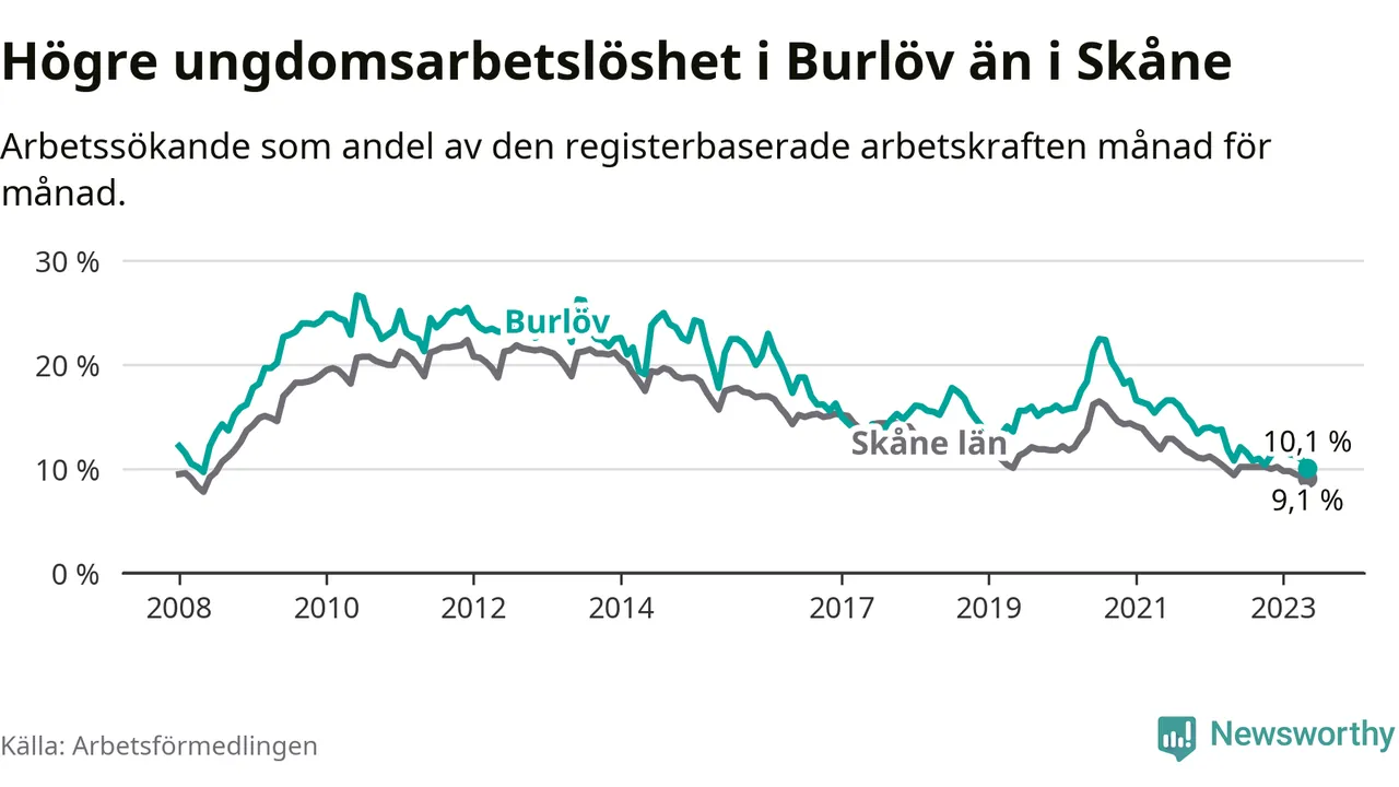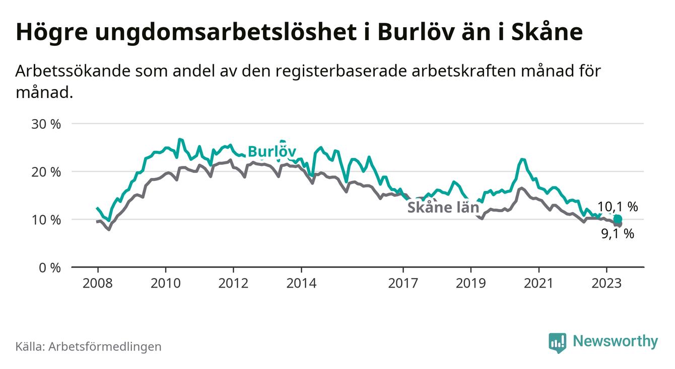 Precis som den totala arbetslösheten ligger ungdomsarbetslösheten i Burlöv högre än i Skåne som helhet. Skillnaden mellan kommunen och länet är 1,0 procentenheter.