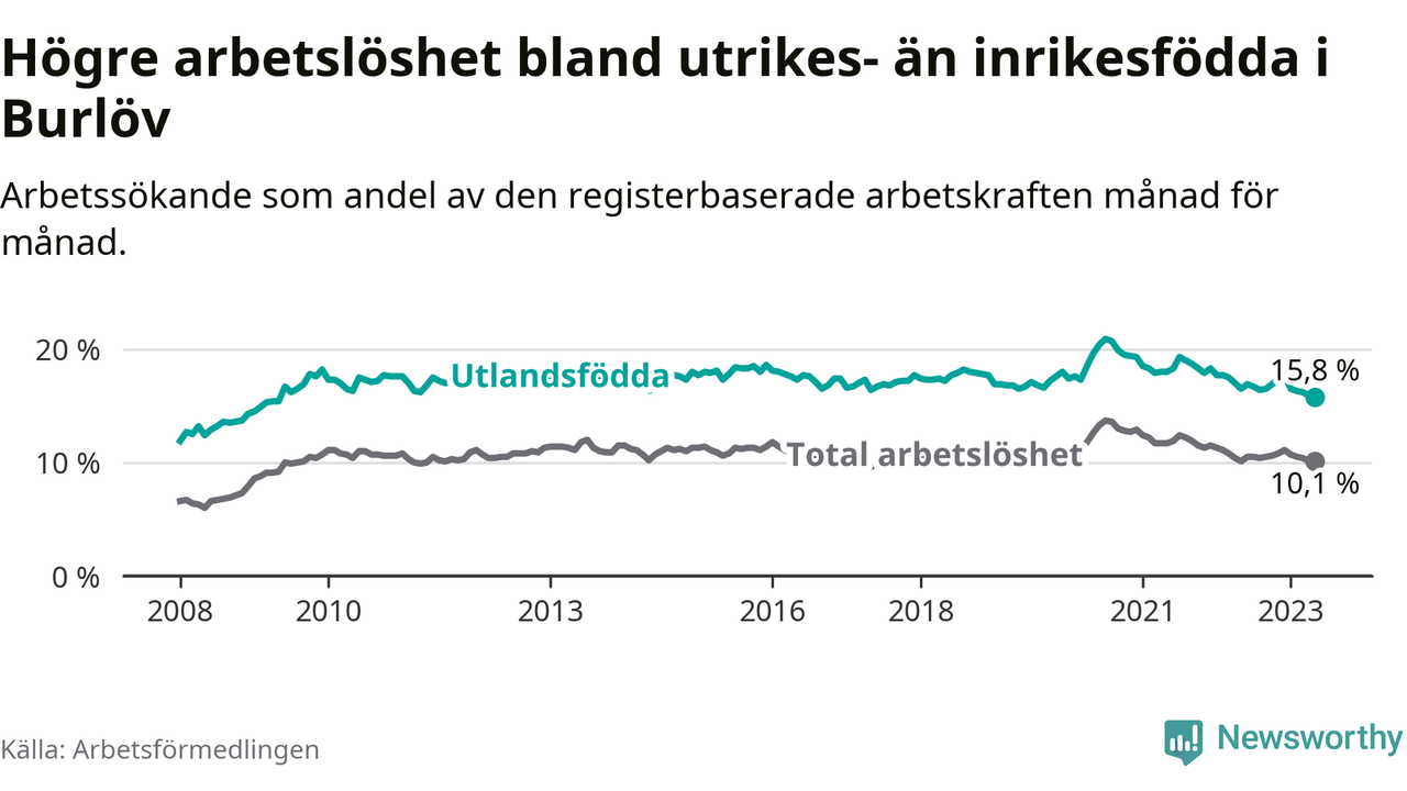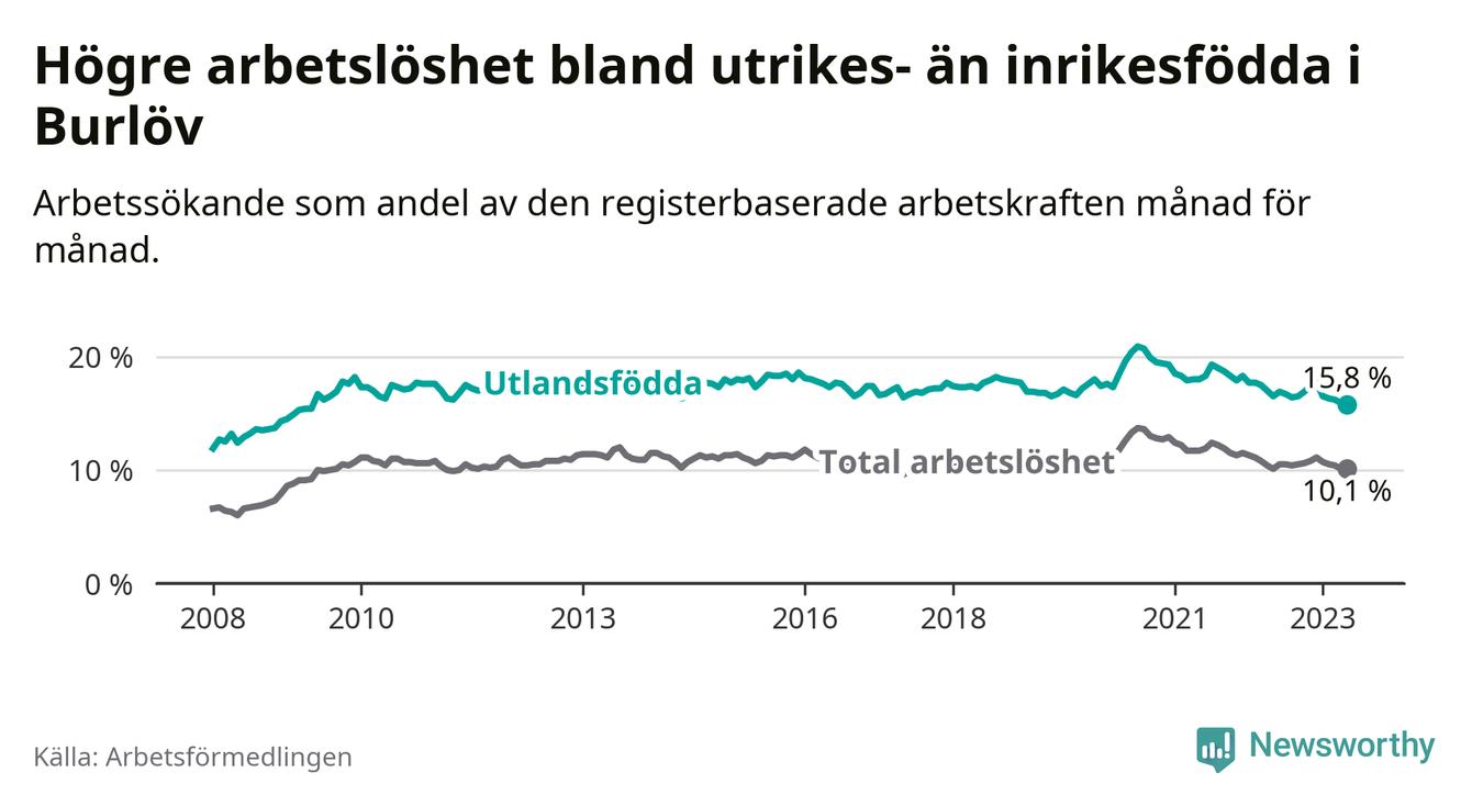 Arbetslösheten bland utlandsfödda var 15,8 procent i Burlöv under maj månad, motsvarande 656 av 4 152 personer. Det är 0,7 procentenheter färre än vid samma tidpunkt i fjol (+25 om man räknar personer). Därmed har de utlandsföddas arbetslöshet varit lägre än vid samma tidpunkt i fjol i över två år i sträck. Sedan mars 2021 har arbetslösheten bland utlandsfödda minskat från 17,9 till 15,8 procent. Den nuvarande arbetslöshetsnivån är den lägsta sedan maj 2009.