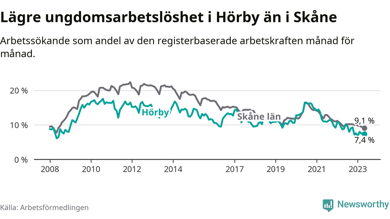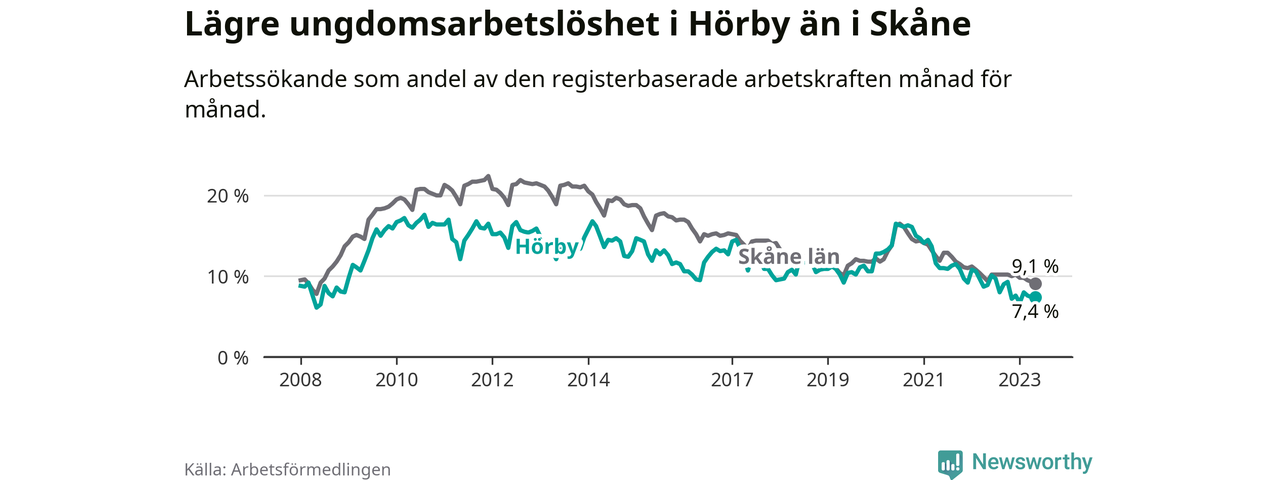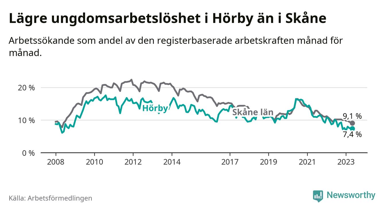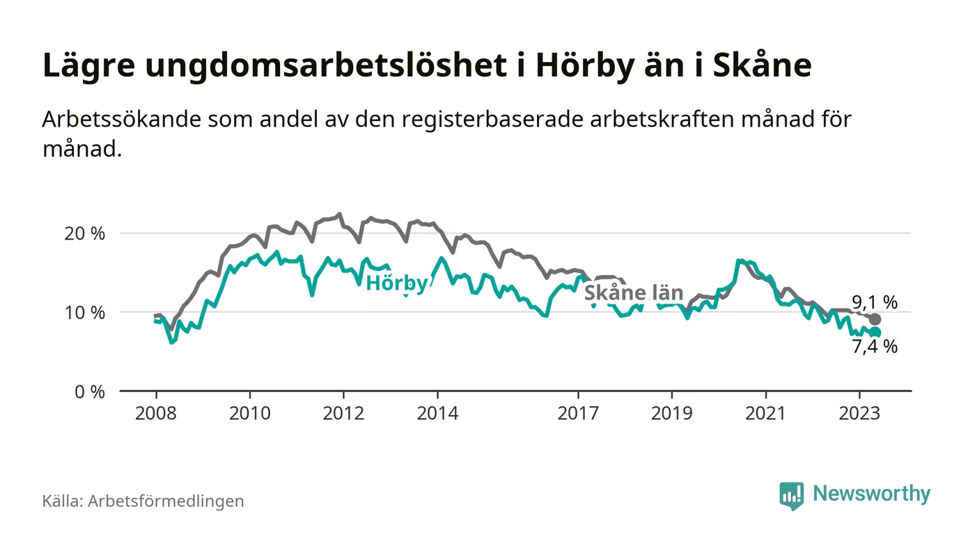 Precis som den totala arbetslösheten ligger ungdomsarbetslösheten i Hörby lägre än i Skåne som helhet. Skillnaden mellan kommunen och länet är 1,7 procentenheter.