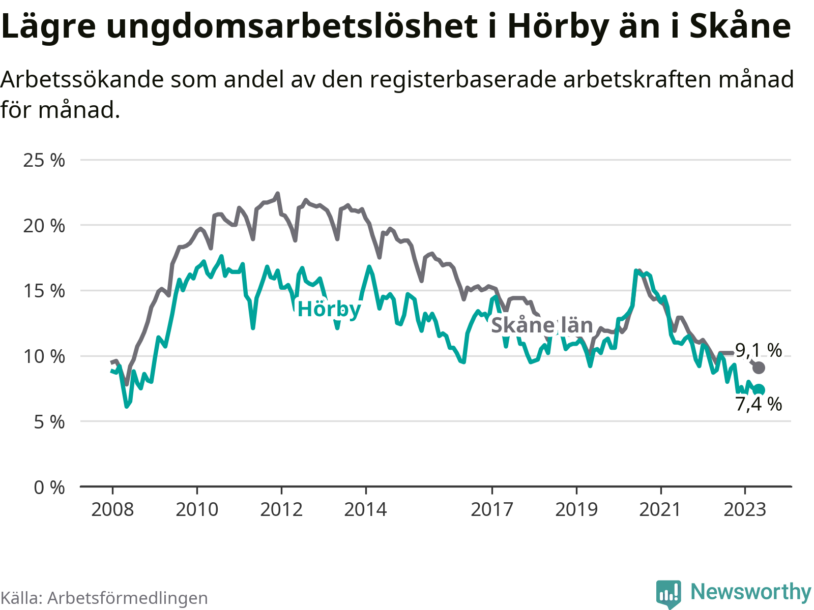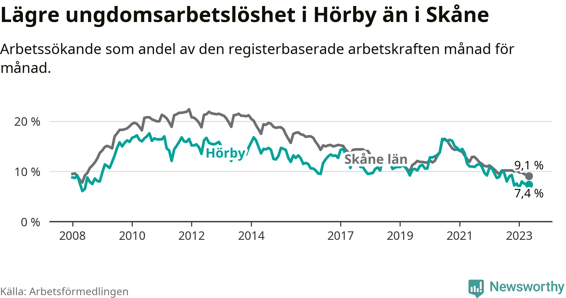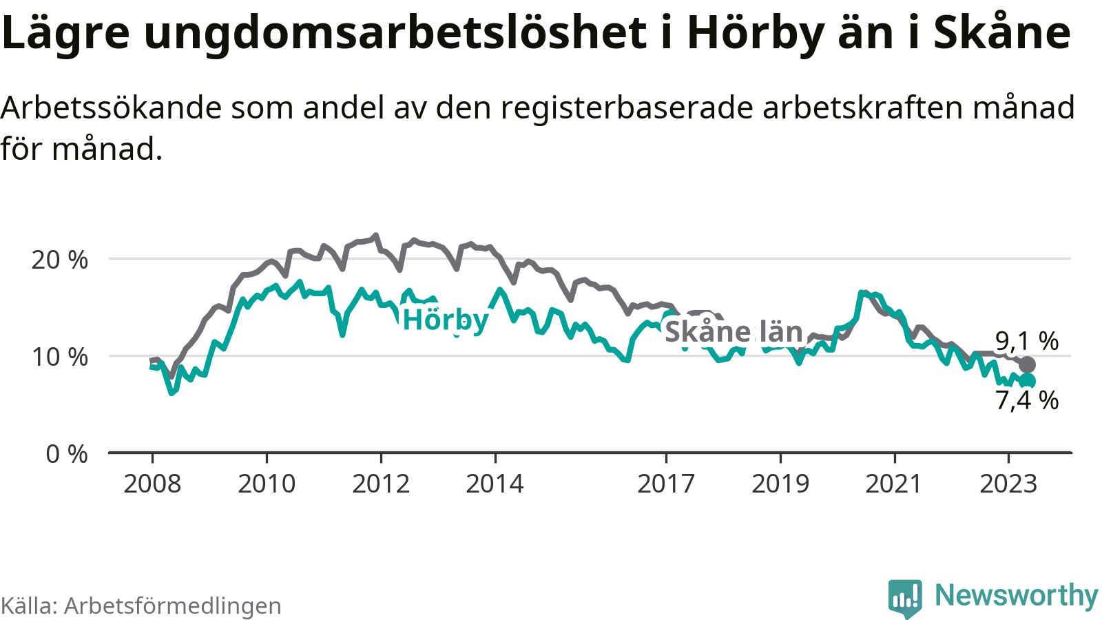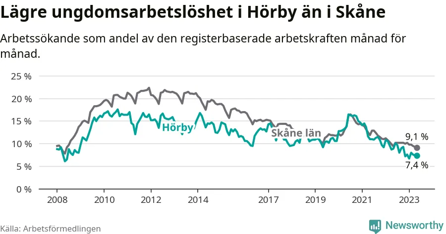 Precis som den totala arbetslösheten ligger ungdomsarbetslösheten i Hörby lägre än i Skåne som helhet. Skillnaden mellan kommunen och länet är 1,7 procentenheter.