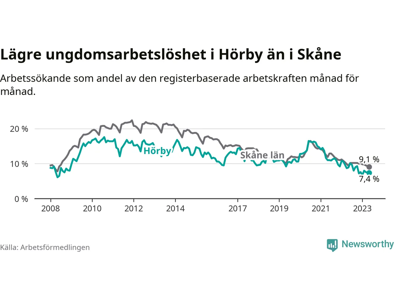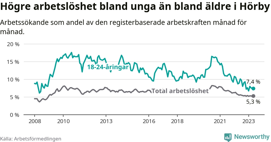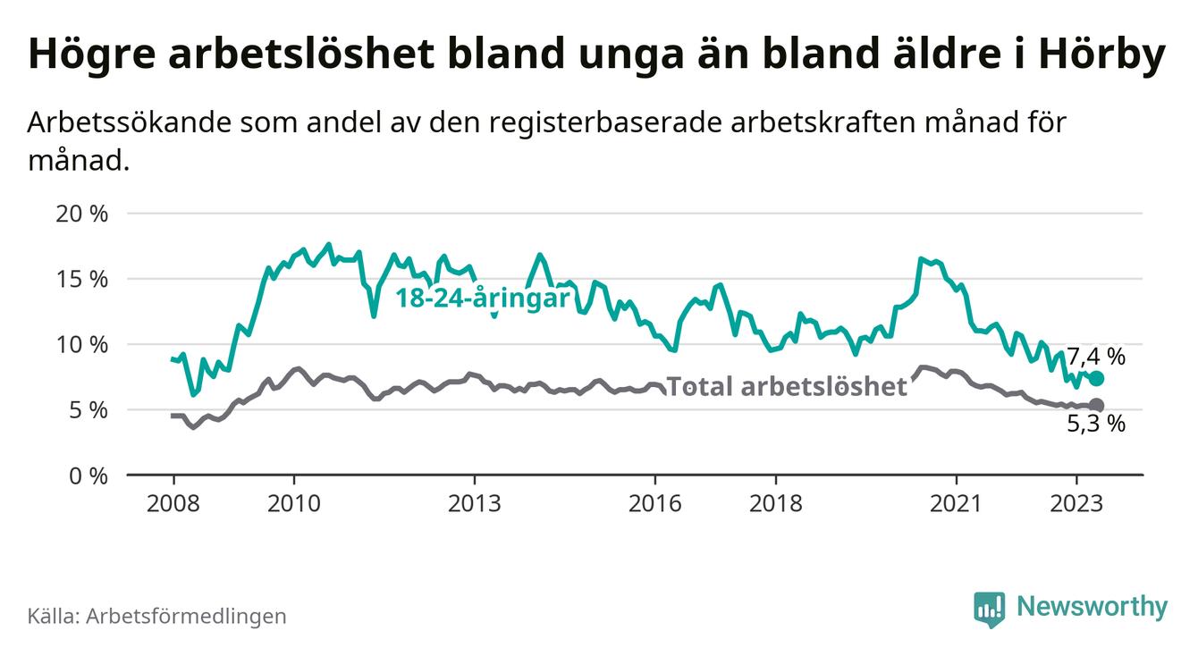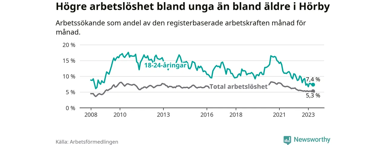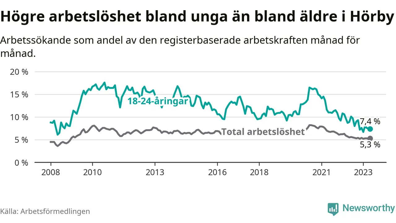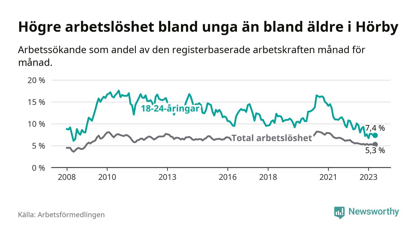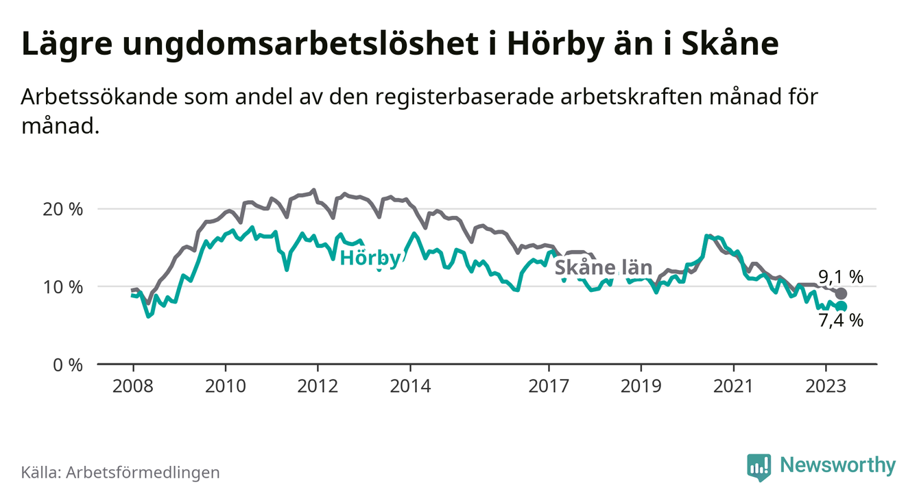I och med den senaste månadens nedgång har de ungas arbetslöshet i Hörby sjunkit över två år i sträck (ner från 13,7 procent i mars 2021 till 7,4 procent nu).