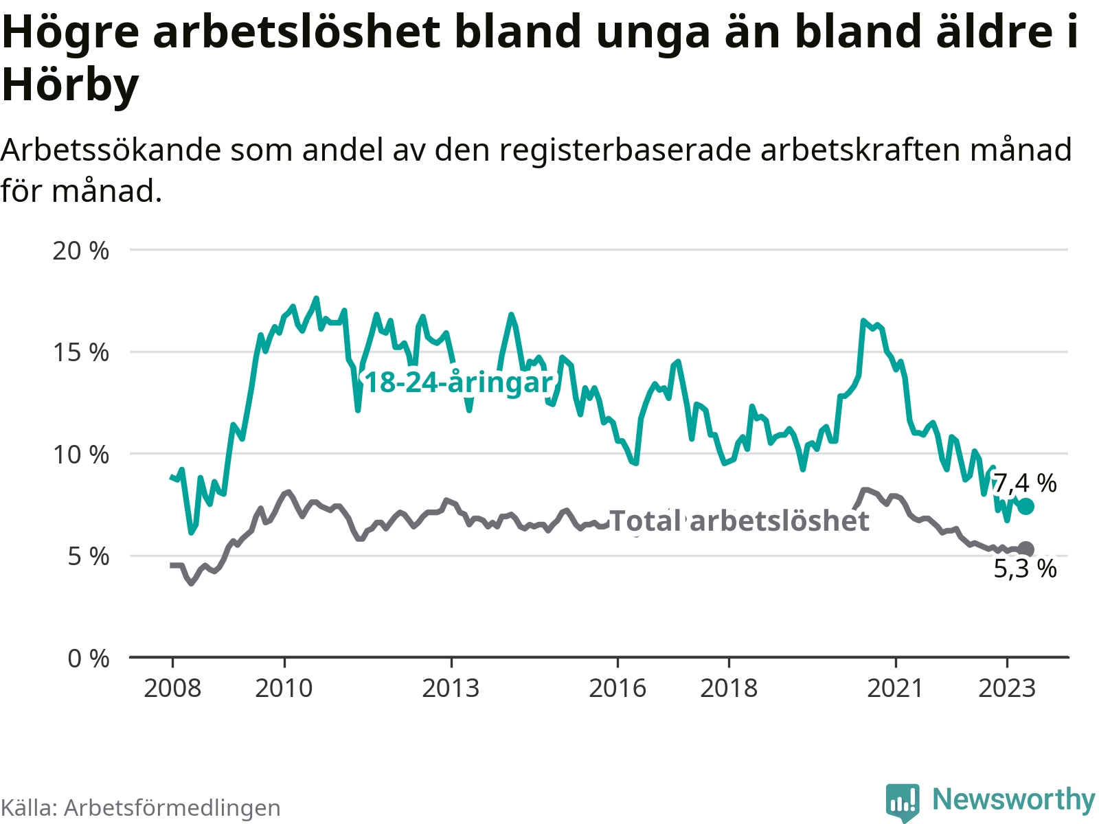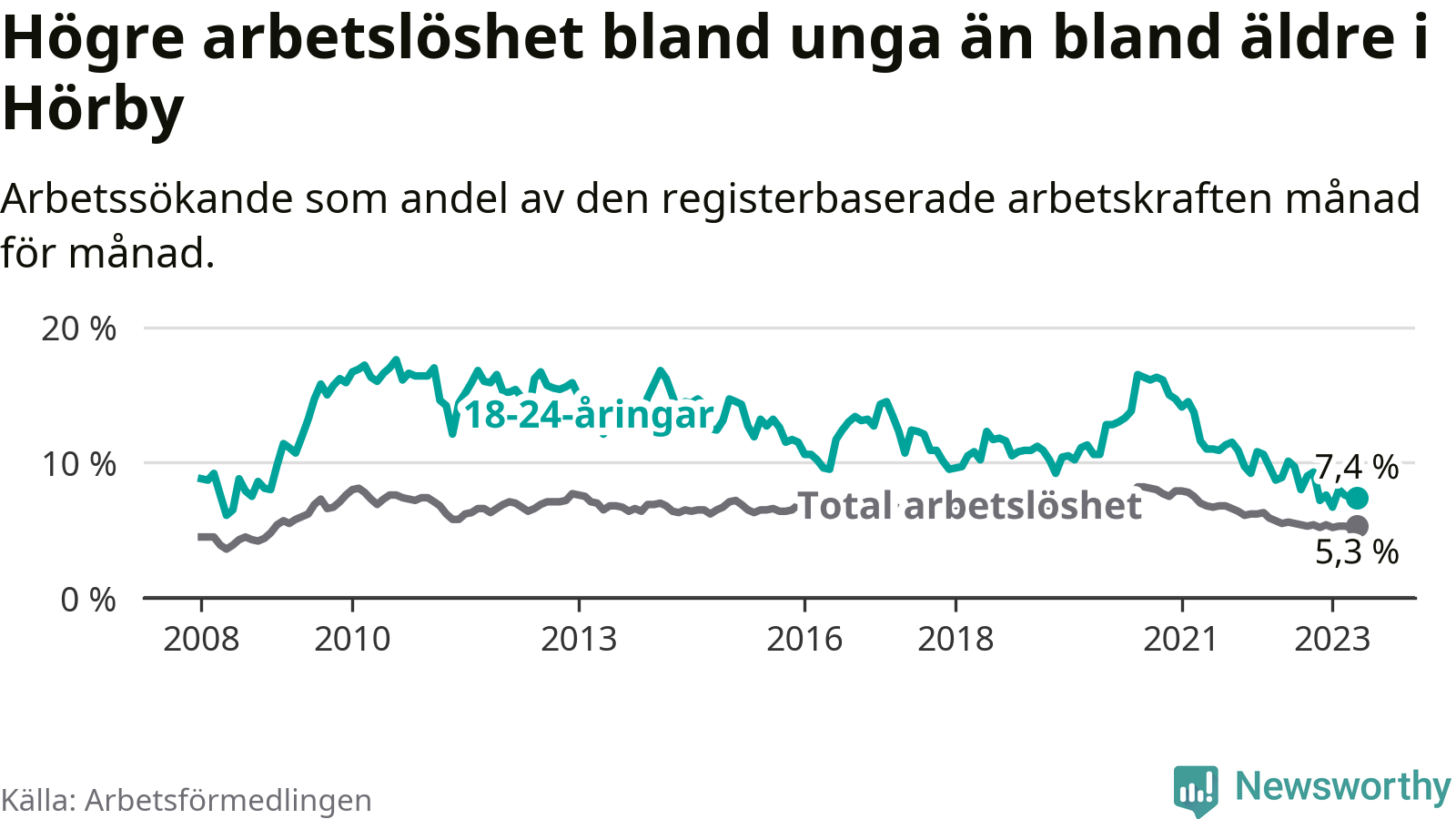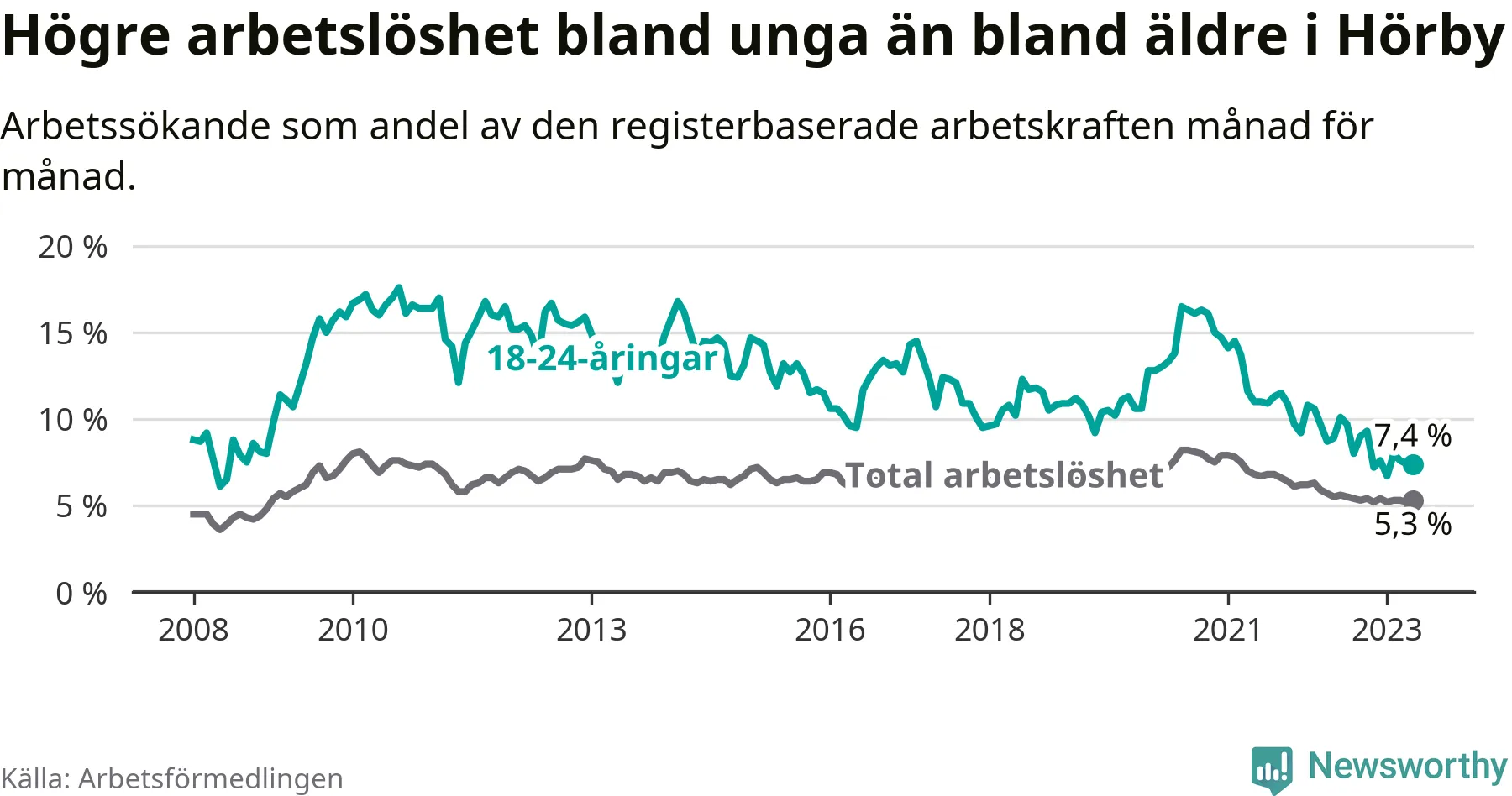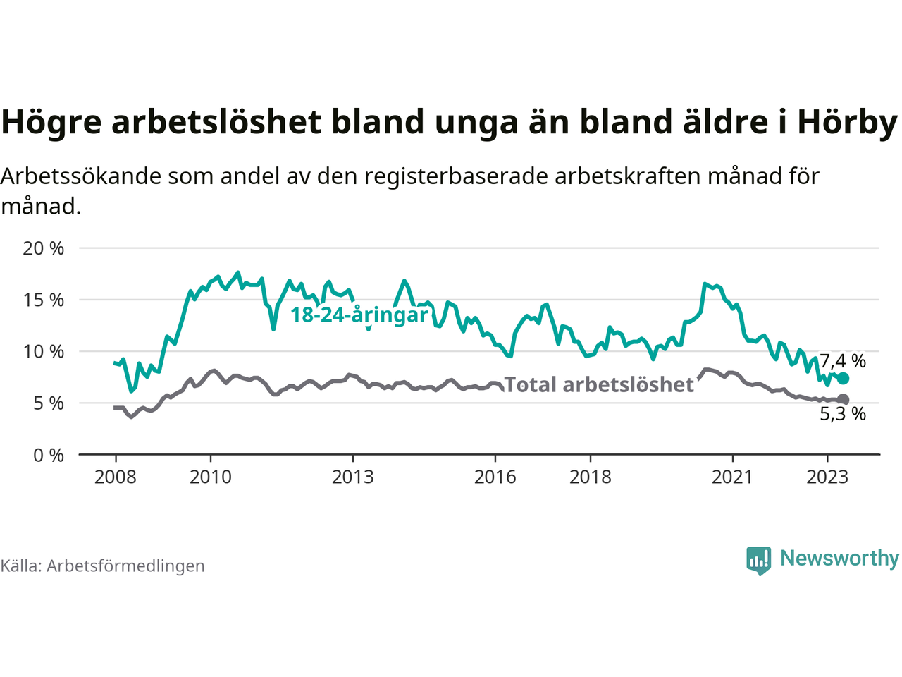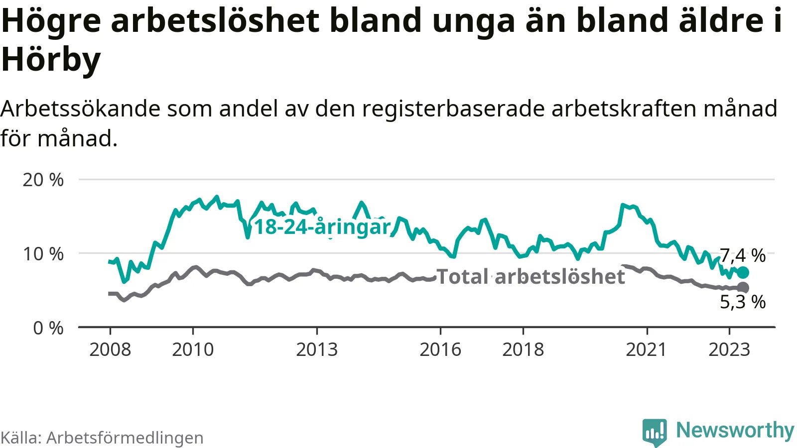 I och med den senaste månadens nedgång har de ungas arbetslöshet i Hörby sjunkit över två år i sträck (ner från 13,7 procent i mars 2021 till 7,4 procent nu).