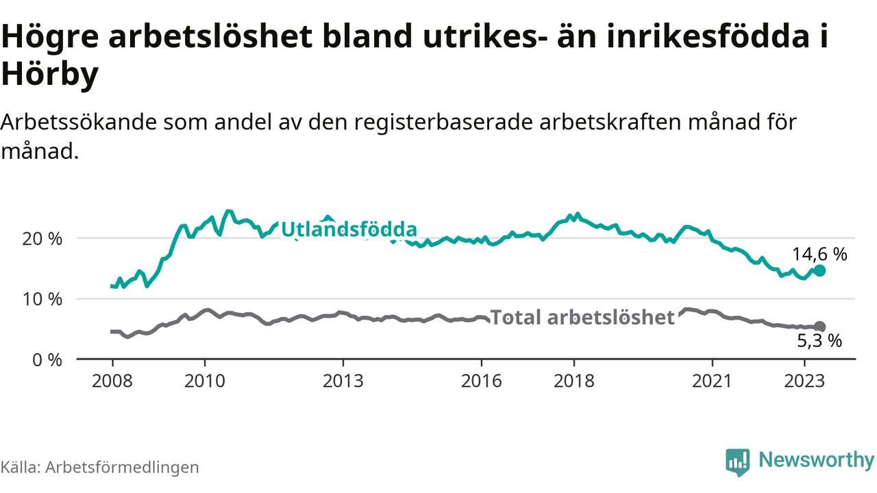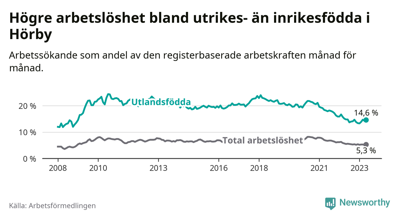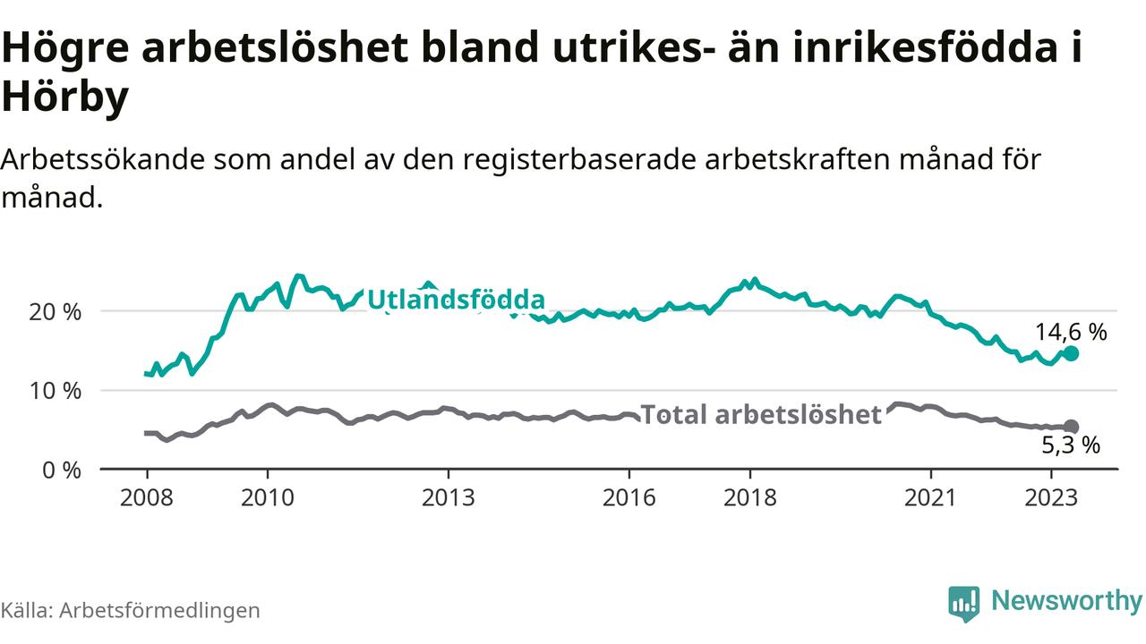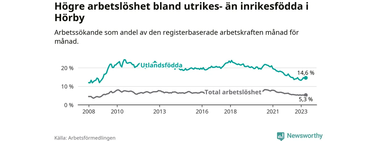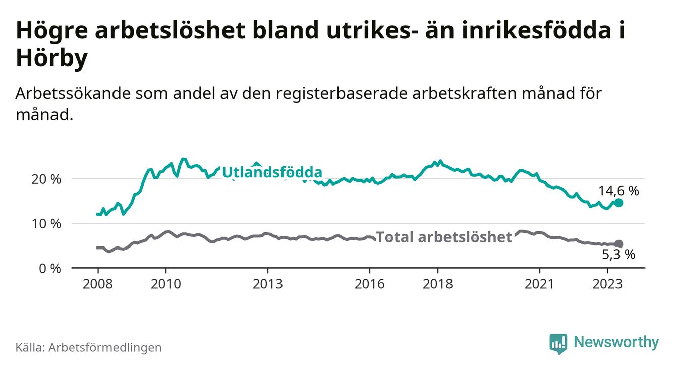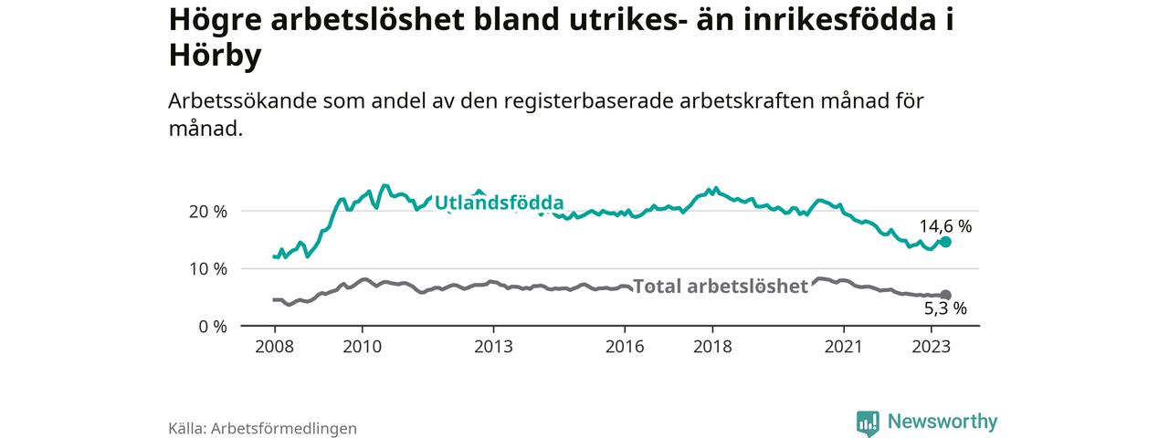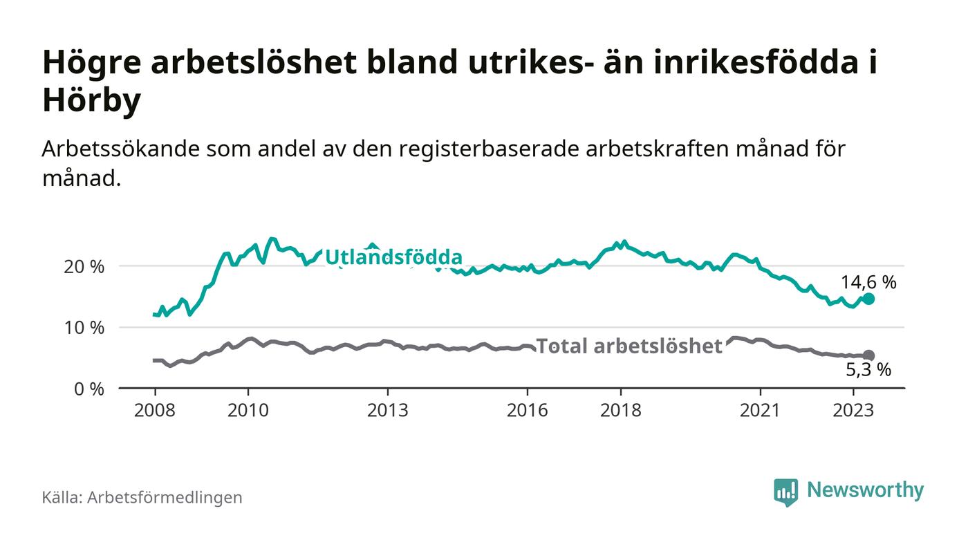 Arbetslösheten bland utlandsfödda var 14,6 procent i Hörby under maj månad, motsvarande 164 av 1 123 personer. Det är 0,2 procentenheter färre än vid samma tidpunkt i fjol (±0 om man räknar personer). Därmed har de utlandsföddas arbetslöshet varit lägre än vid samma tidpunkt i fjol i över två år i sträck. Sedan januari 2021 har arbetslösheten bland utlandsfödda minskat från 19,6 till 14,6 procent.