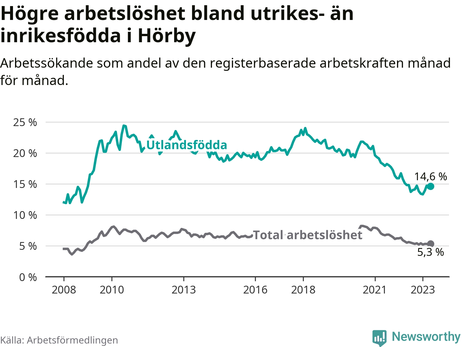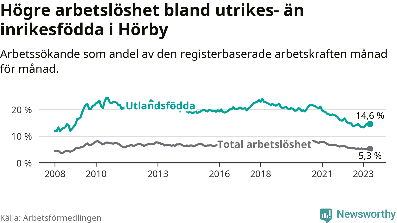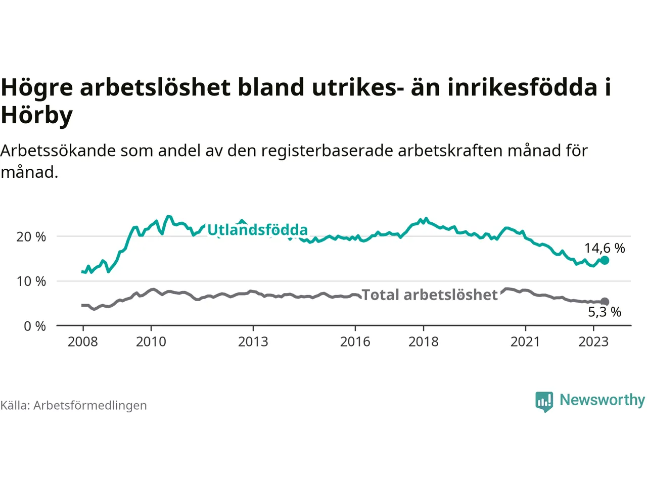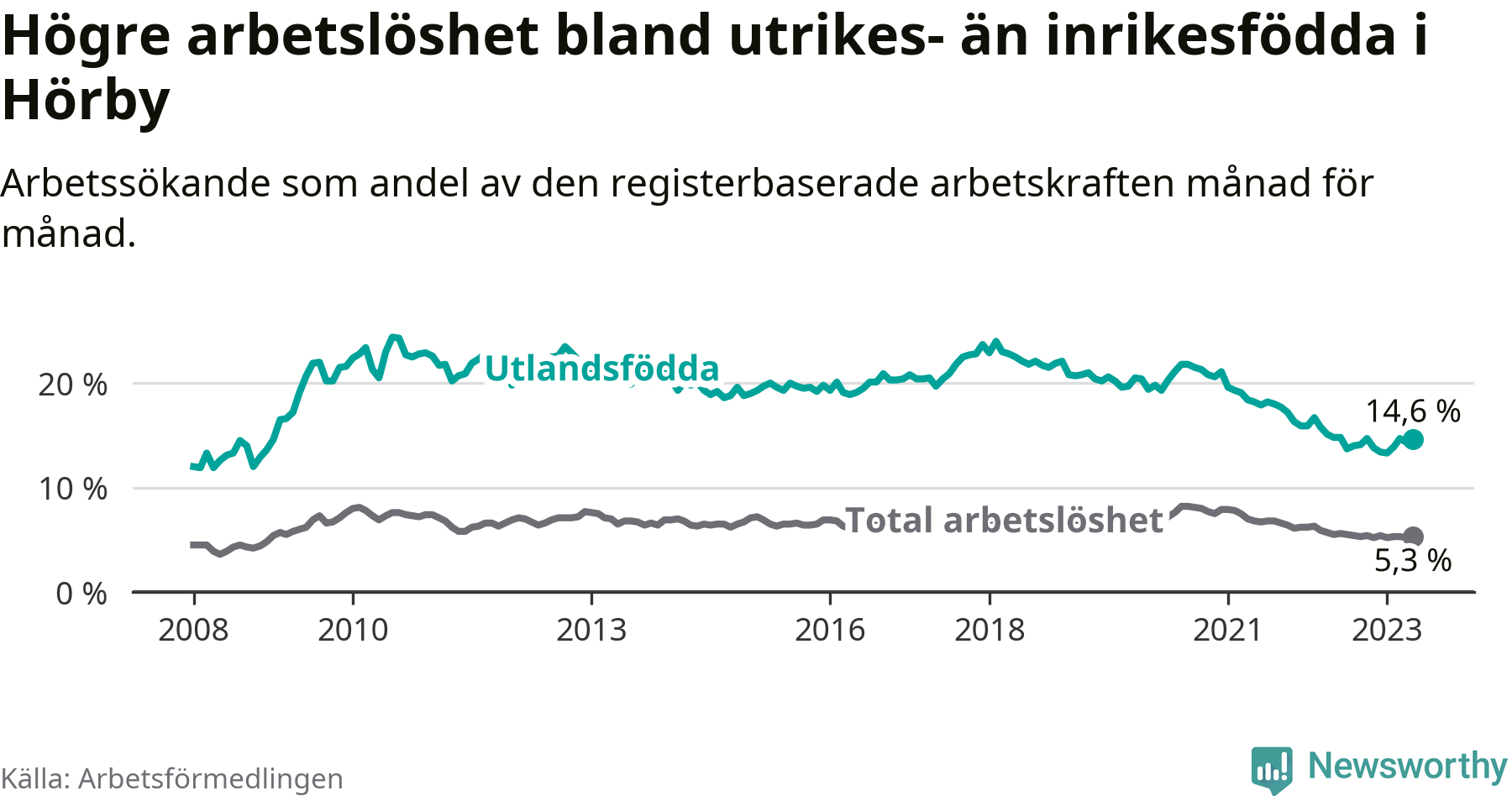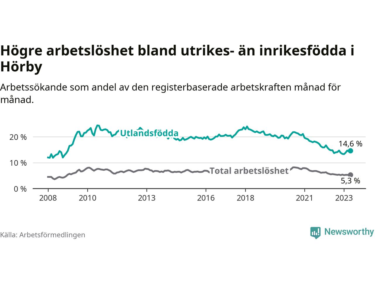 Arbetslösheten bland utlandsfödda var 14,6 procent i Hörby under maj månad, motsvarande 164 av 1 123 personer. Det är 0,2 procentenheter färre än vid samma tidpunkt i fjol (±0 om man räknar personer). Därmed har de utlandsföddas arbetslöshet varit lägre än vid samma tidpunkt i fjol i över två år i sträck. Sedan januari 2021 har arbetslösheten bland utlandsfödda minskat från 19,6 till 14,6 procent.