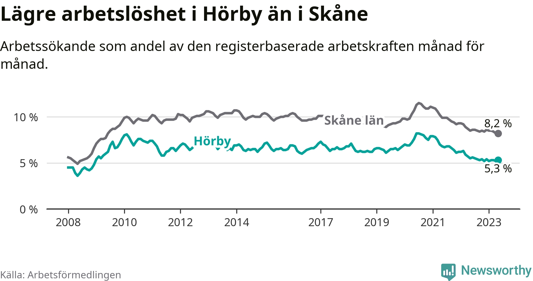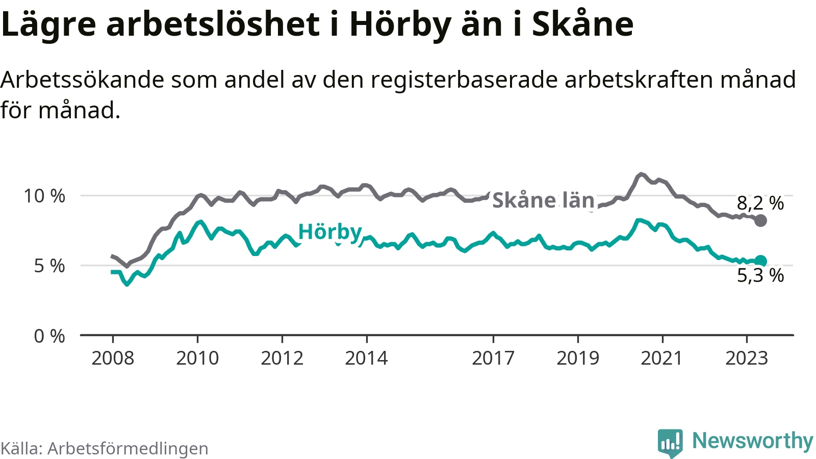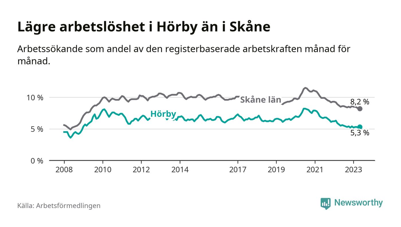 Hörby hade redan tidigare lägre arbetslöshet än snittet i hela Skåne län och nu växer klyftan (5,3 procent i kommunen, jämfört med 8,2 procent i hela länet). Lomma har den lägsta arbetslösheten i länet (3,1 procent), medan Perstorp har den högsta (11,8 procent). För att Hörby skulle komma ner i samma arbetslöshetsnivå som Lomma skulle 168 personer behöva sysselsättas.