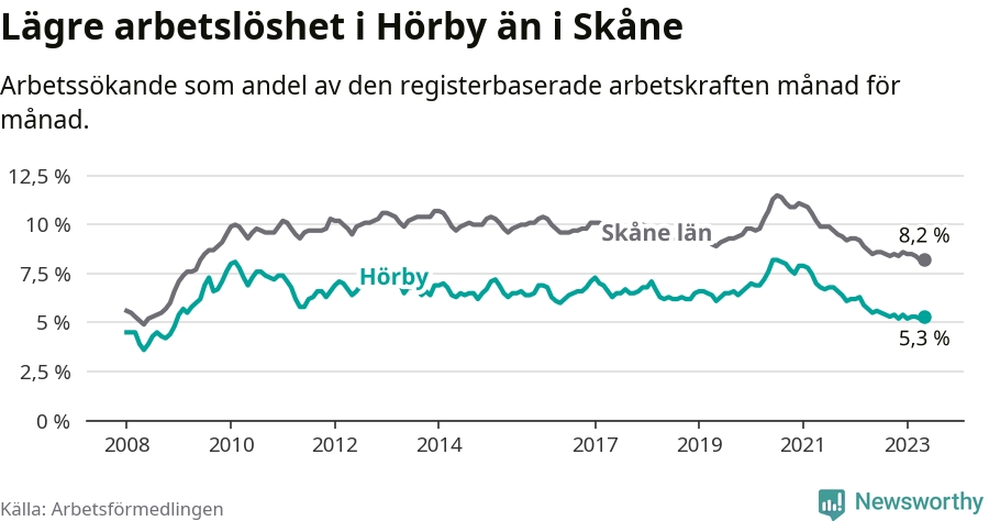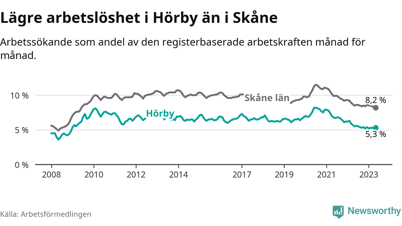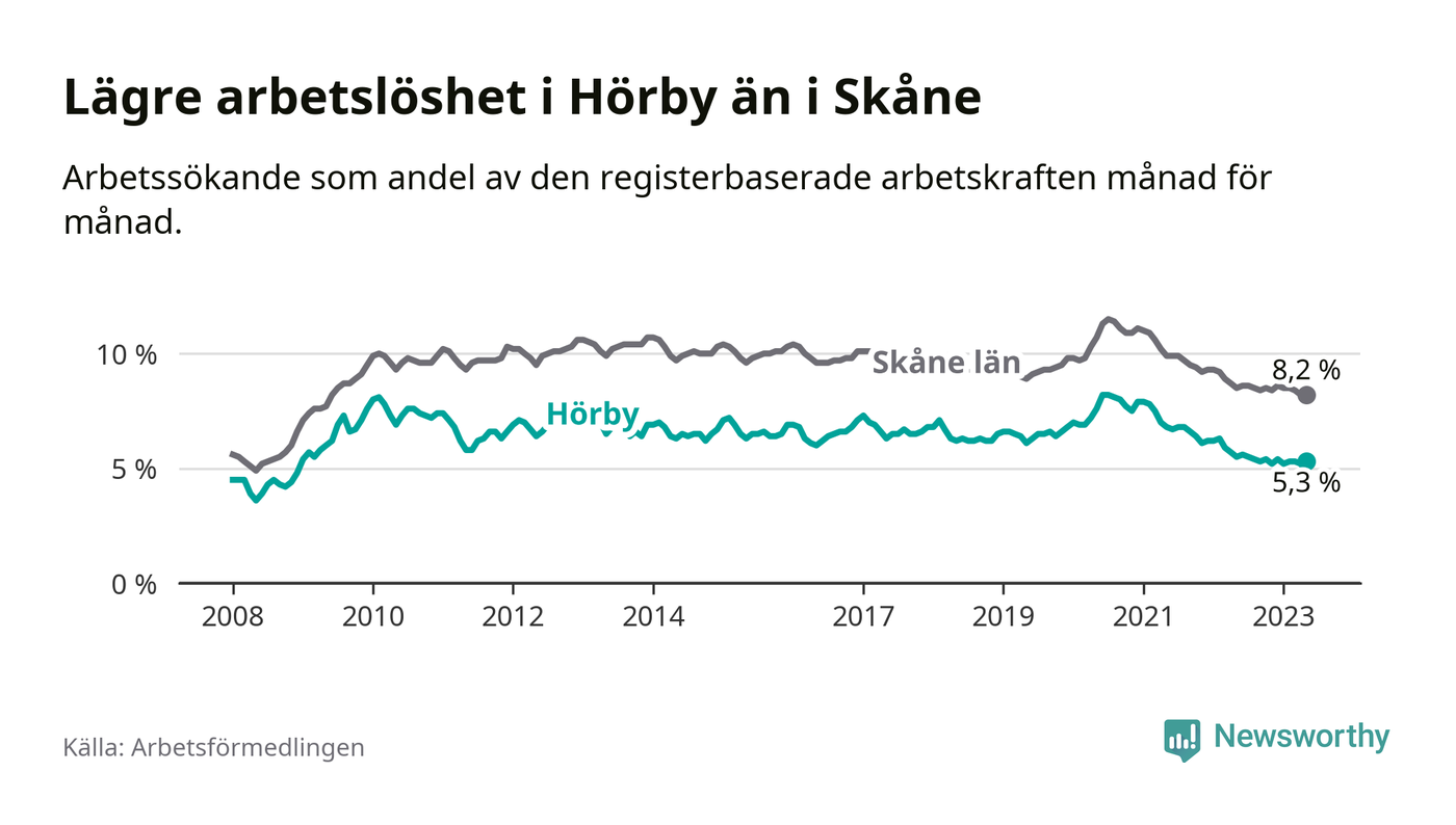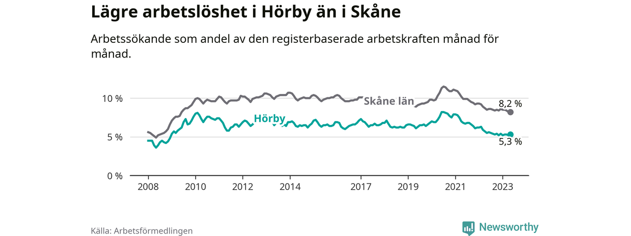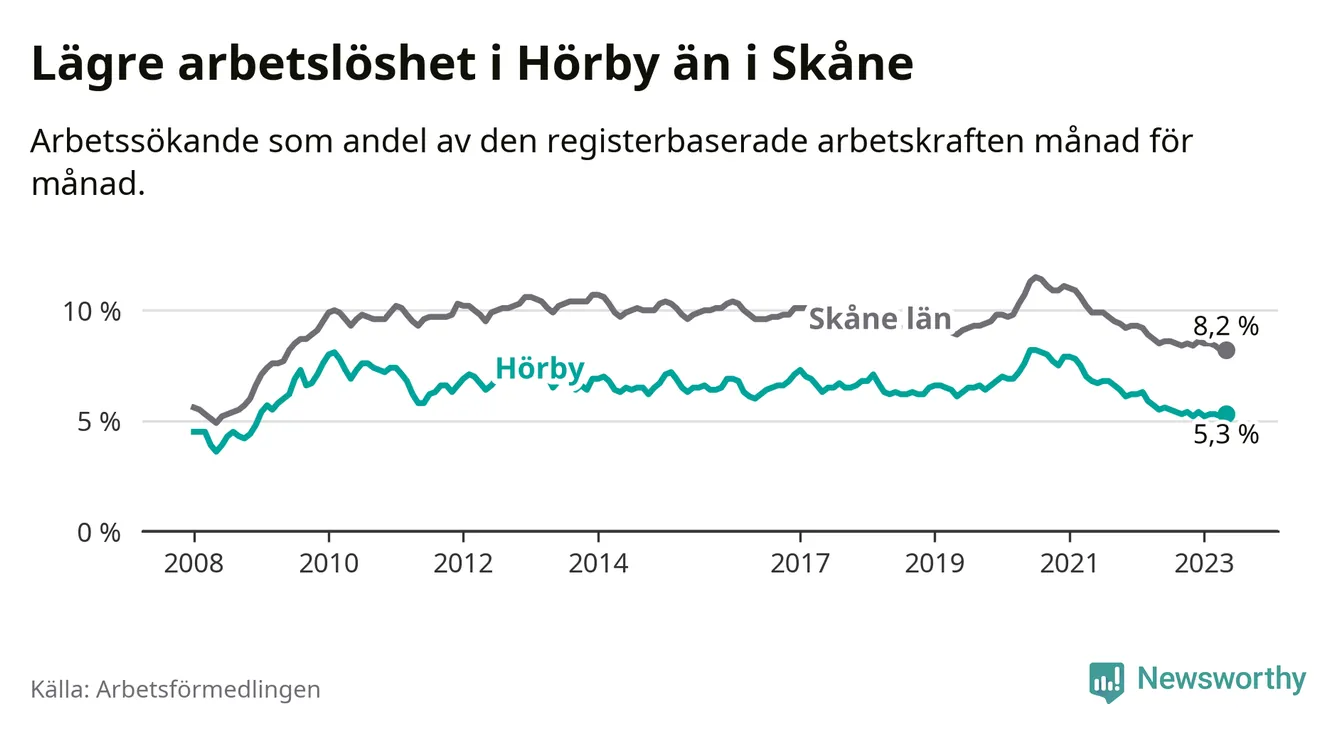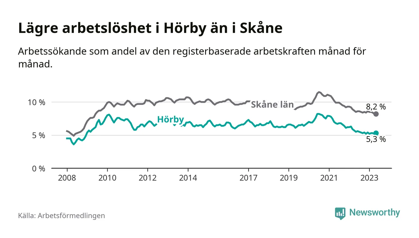 Det är 26:e månaden i följd som arbetslösheten i Hörby är lägre än den var under samma tidpunkt året innan. Sedan mars 2021 har arbetslösheten gått ner från 7,5 till 5,3 procent.