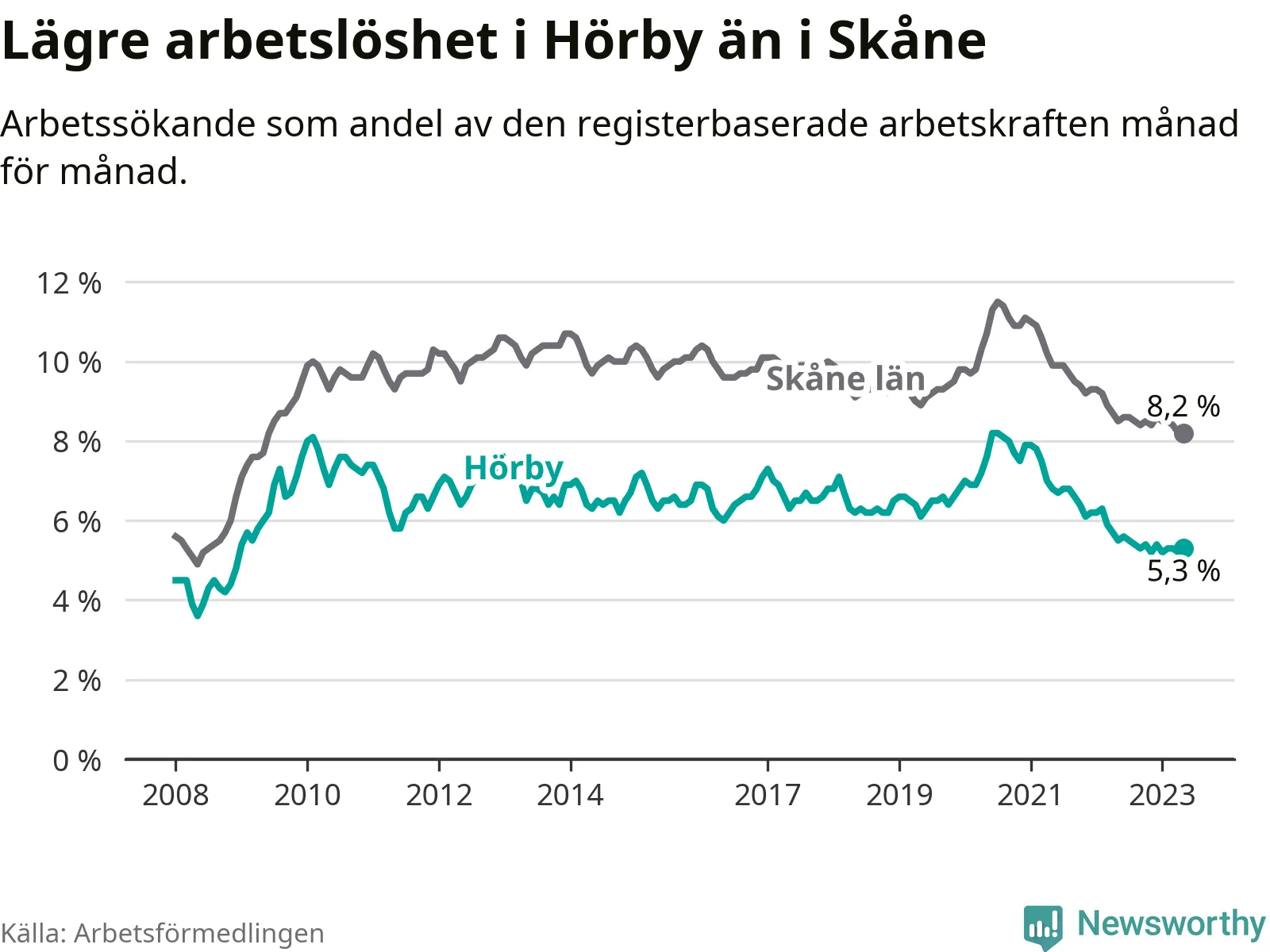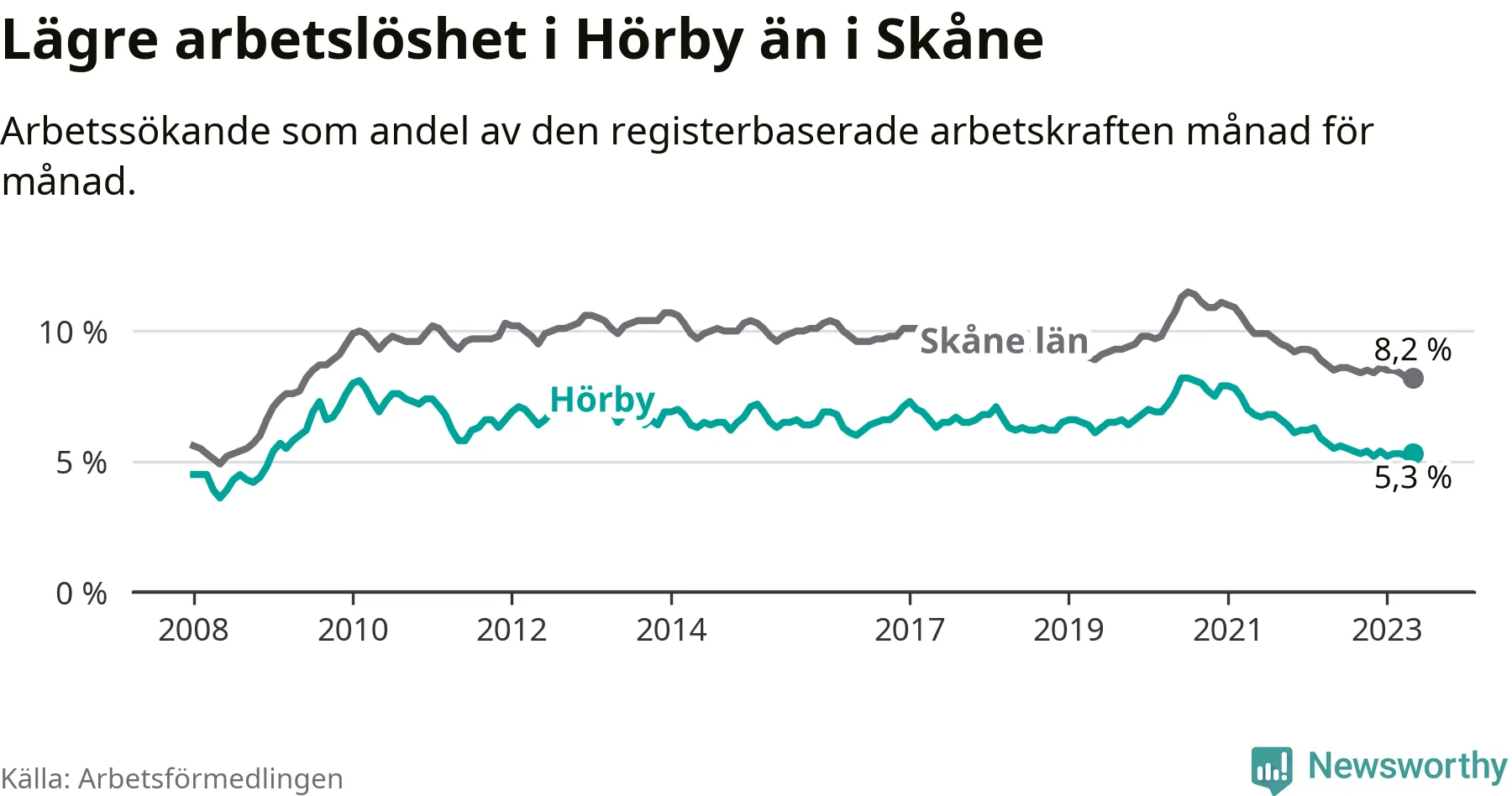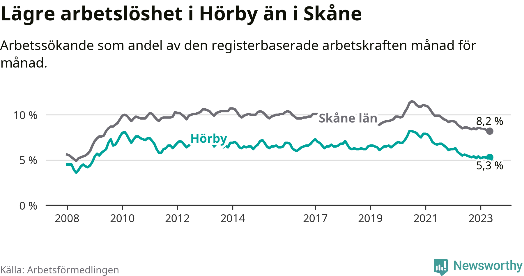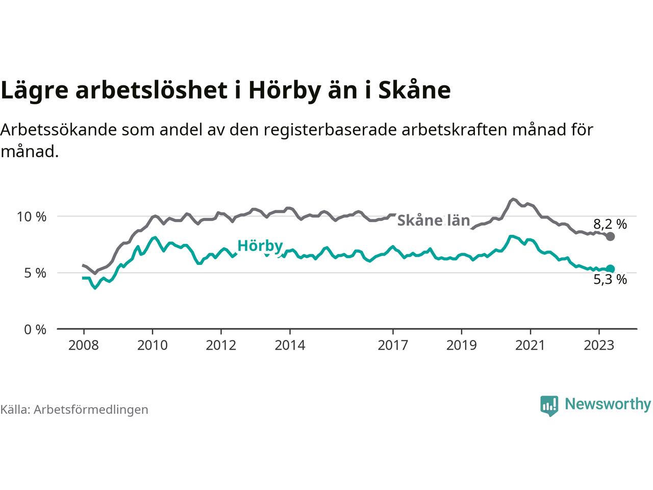 Det är 26:e månaden i följd som arbetslösheten i Hörby är lägre än den var under samma tidpunkt året innan. Sedan mars 2021 har arbetslösheten gått ner från 7,5 till 5,3 procent.