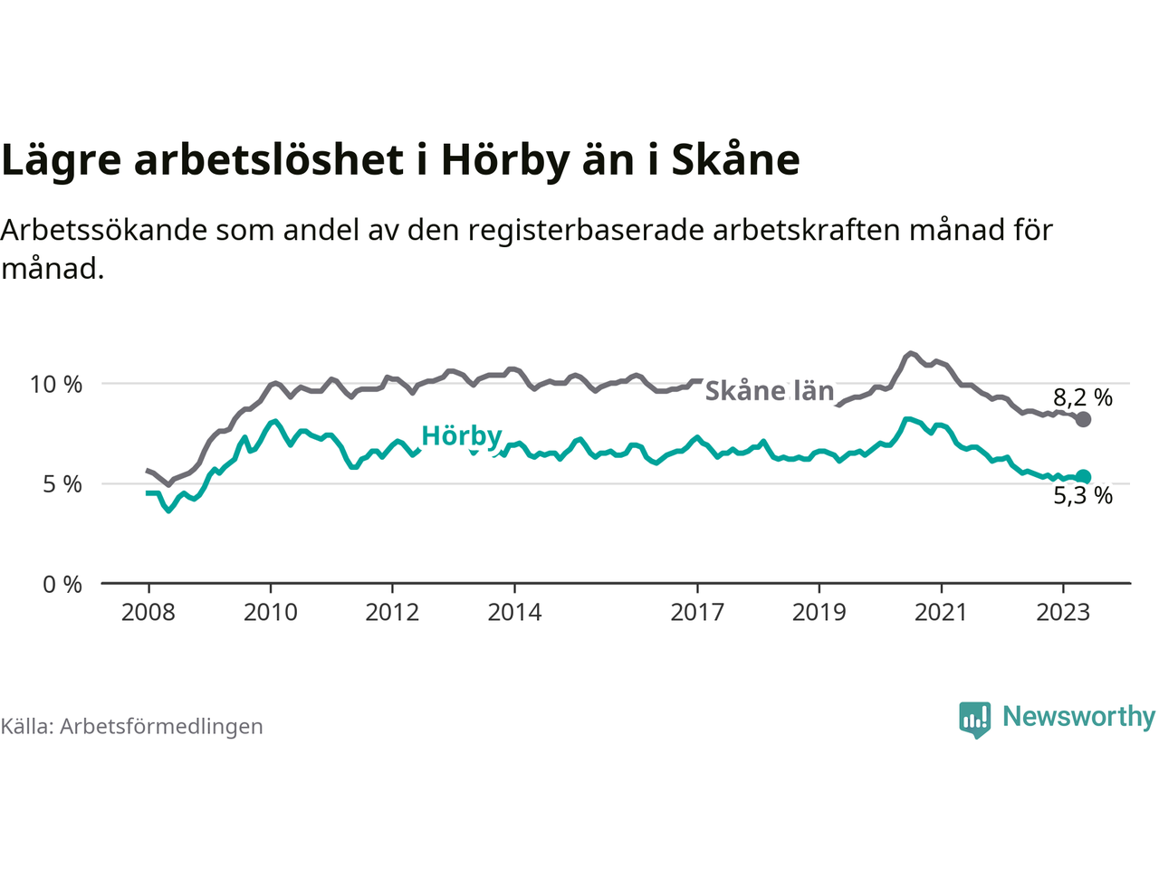 Under maj månad rapporterade Hörby kommun en total arbetslöshet på 5,3 procent. Det är en minskning jämfört med samma tidpunkt i fjol (−0,2 procentenheter). Även i Skåne län sjunker arbetslösheten .