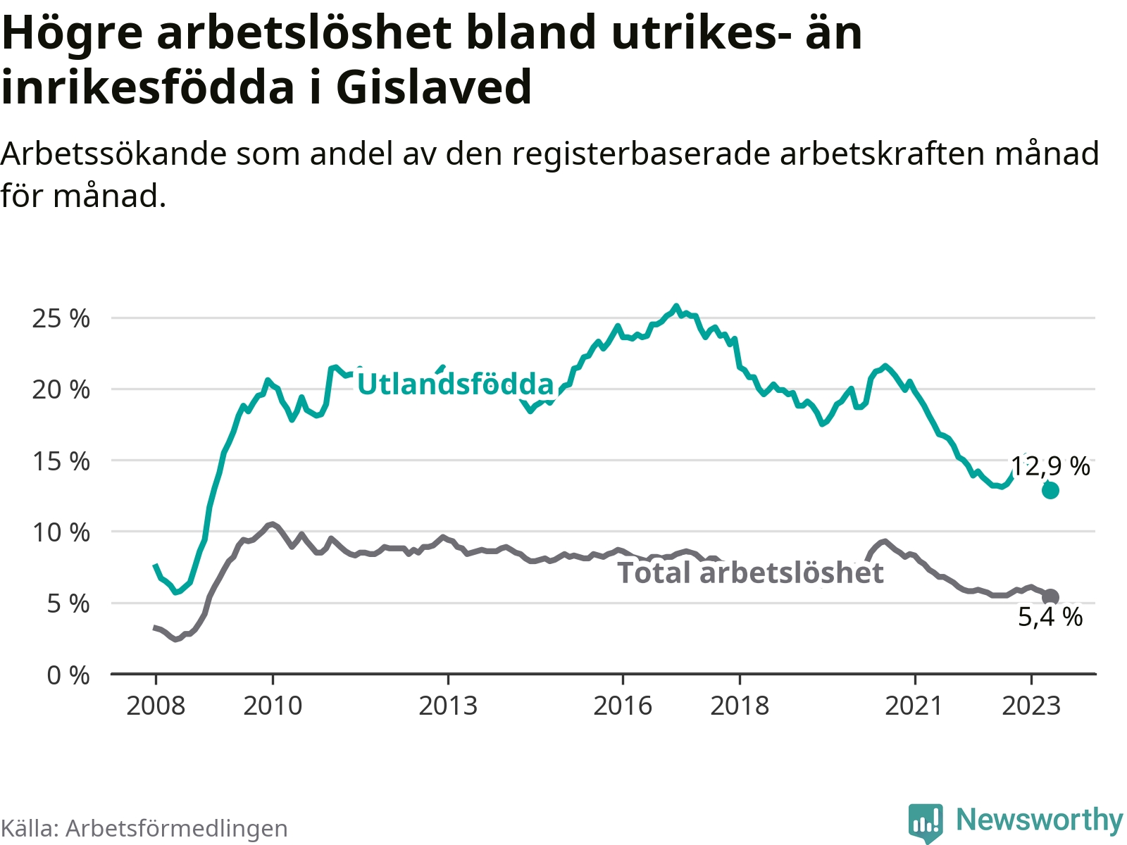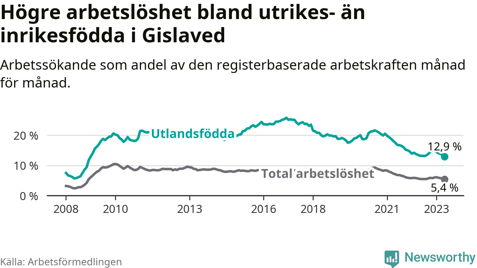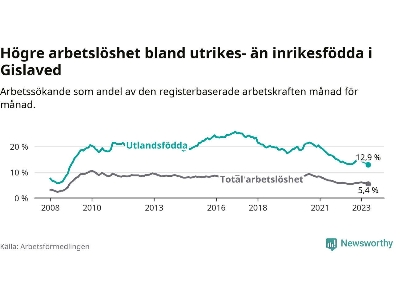 Arbetslösheten bland utlandsfödda var 12,9 procent i Gislaved under maj månad, motsvarande 576 av 4 465 personer. Det är 0,3 procentenheter färre än vid samma tidpunkt i fjol (+35 om man räknar personer). Den nuvarande arbetslöshetsnivån är den lägsta sedan december 2008. Den senaste månadens nedgång innebär ett trendbrott. Under de ett föregående månaderna hade arbetslösheten bland utlandsfödda varit högre än motsvarande tidpunkt året innan.