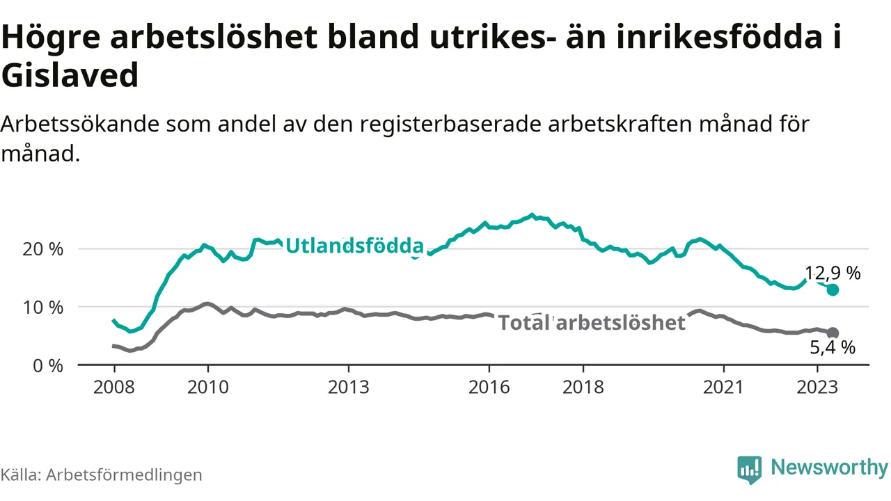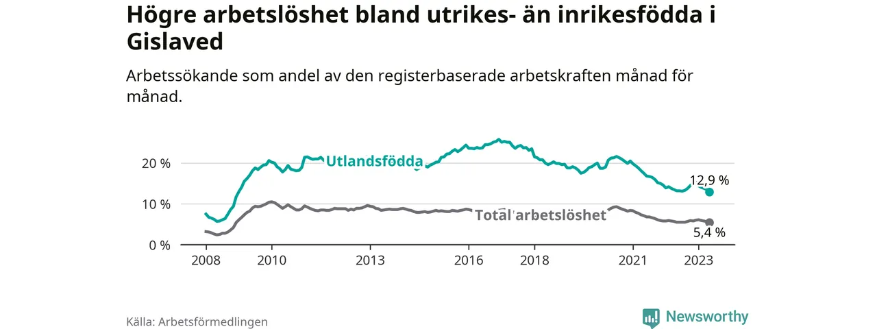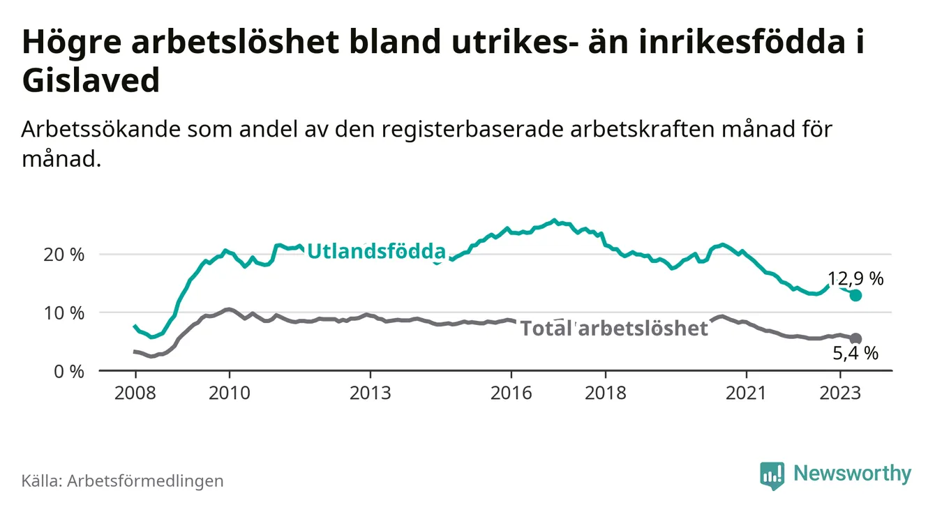 Skillnaden i arbetslöshet mellan utrikesfödda och hela befolkningen är 7,5 procentenheter i Gislaved.