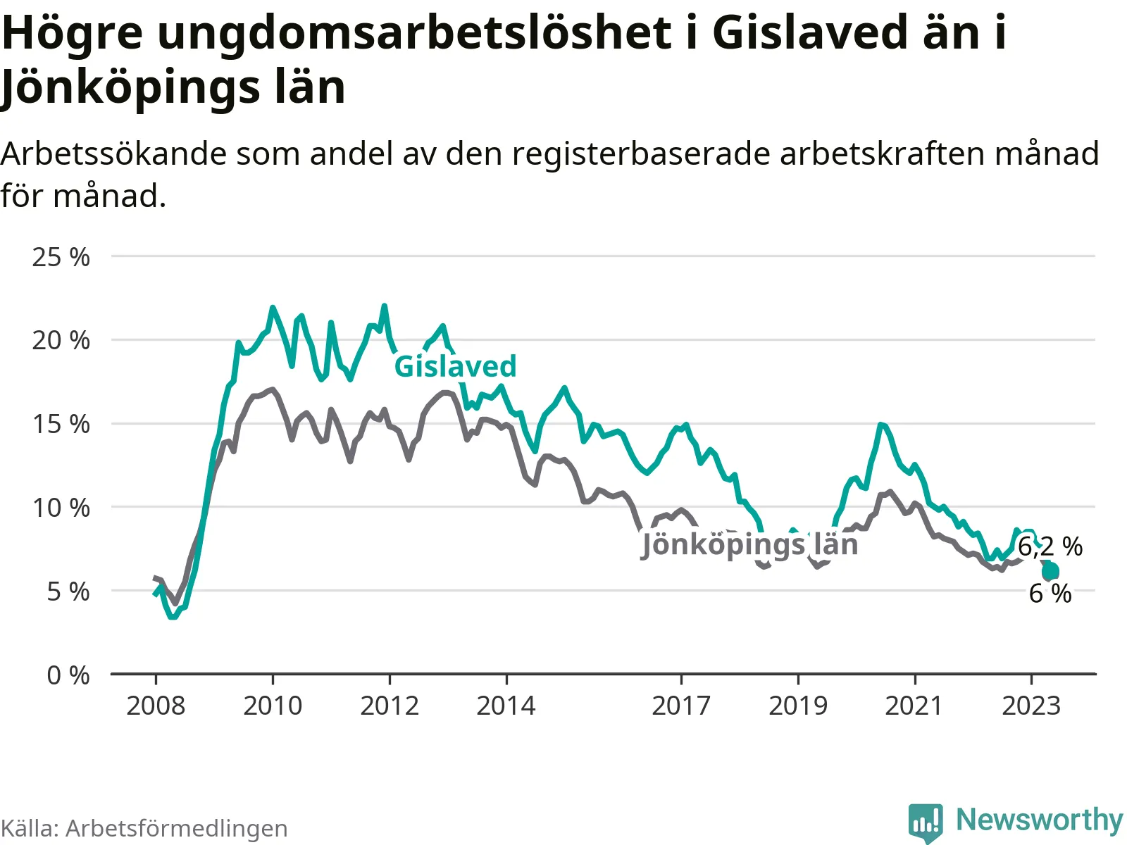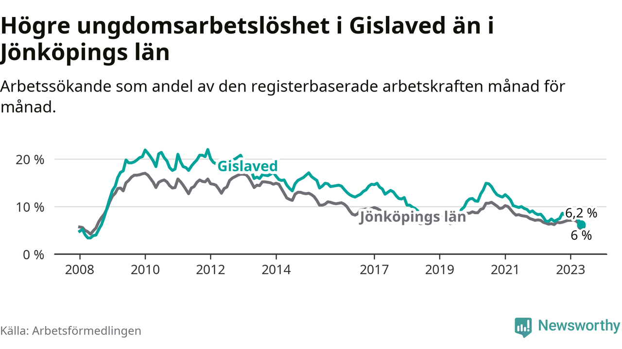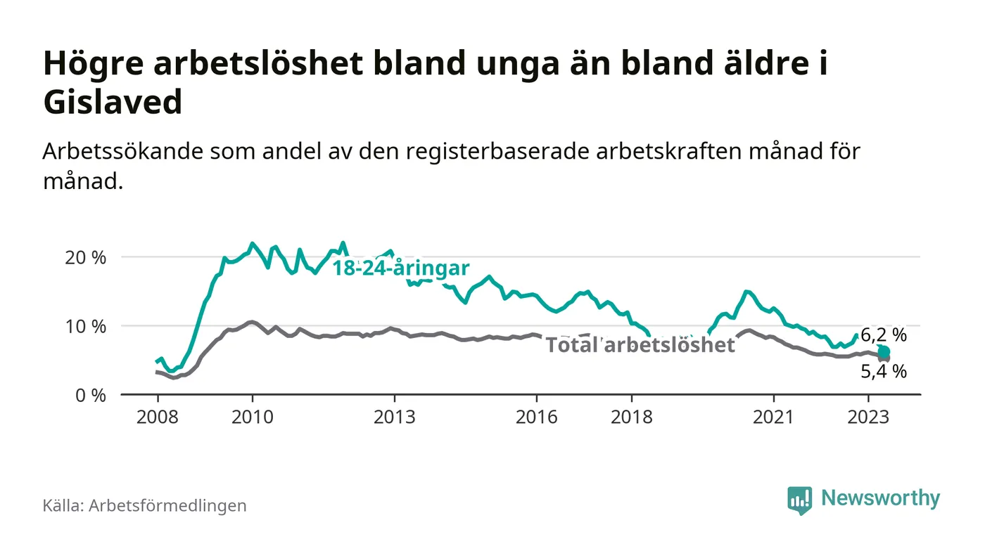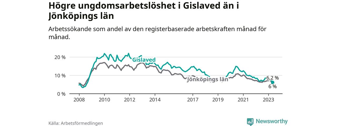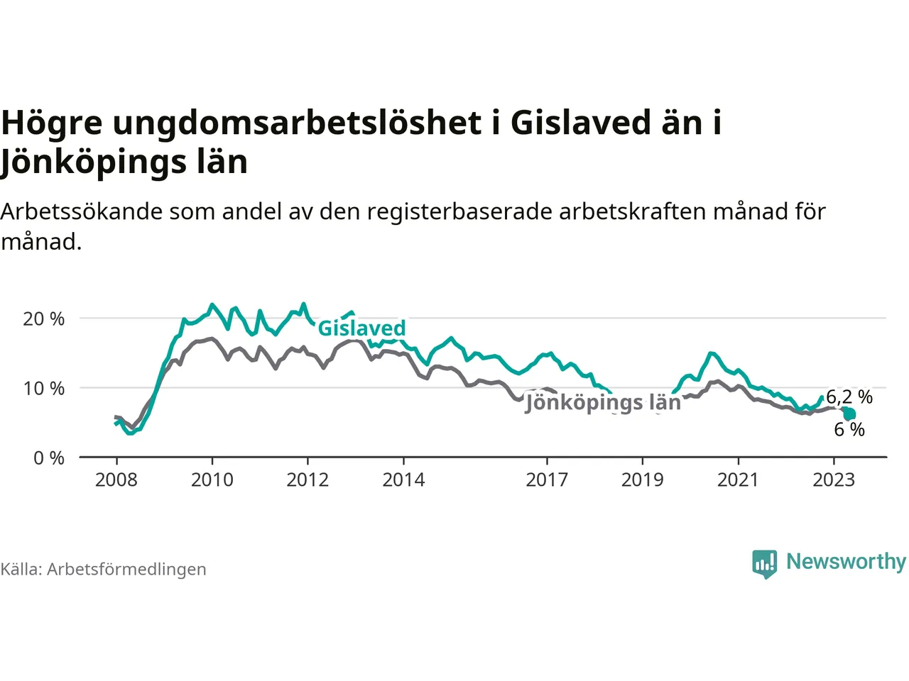 Precis som den totala arbetslösheten ligger ungdomsarbetslösheten i Gislaved högre än i Jönköpings län som helhet. Skillnaden mellan kommunen och länet är 0,2 procentenheter.