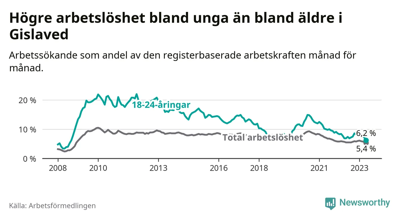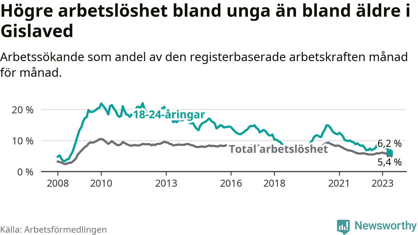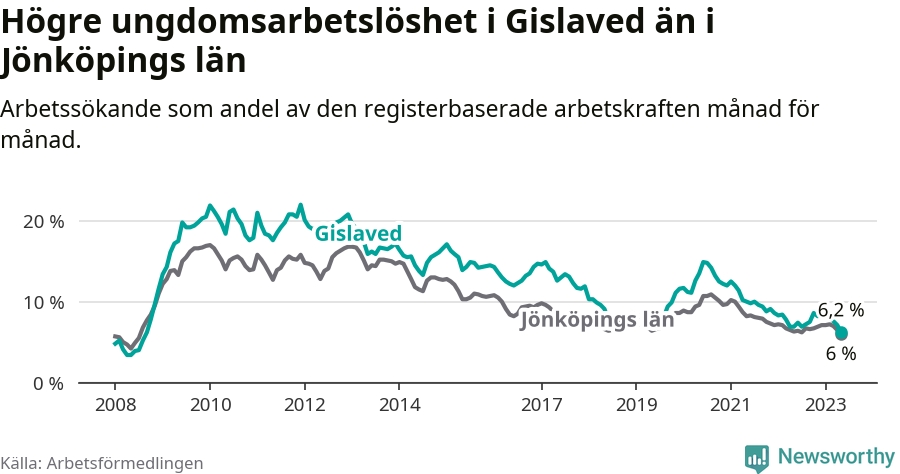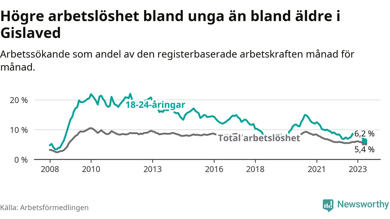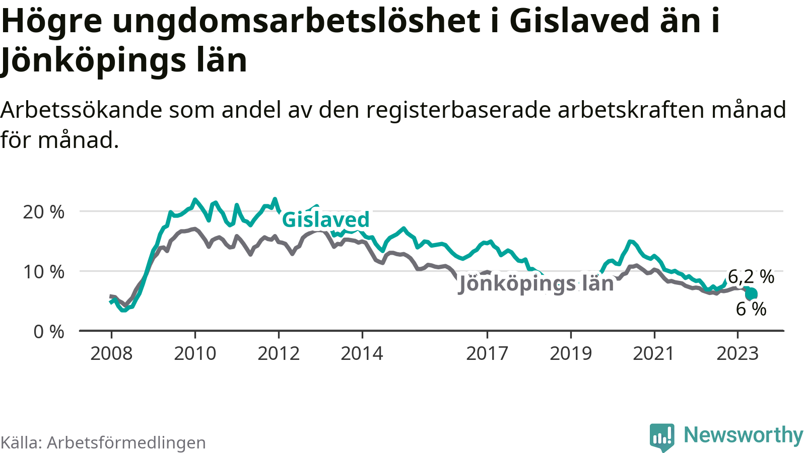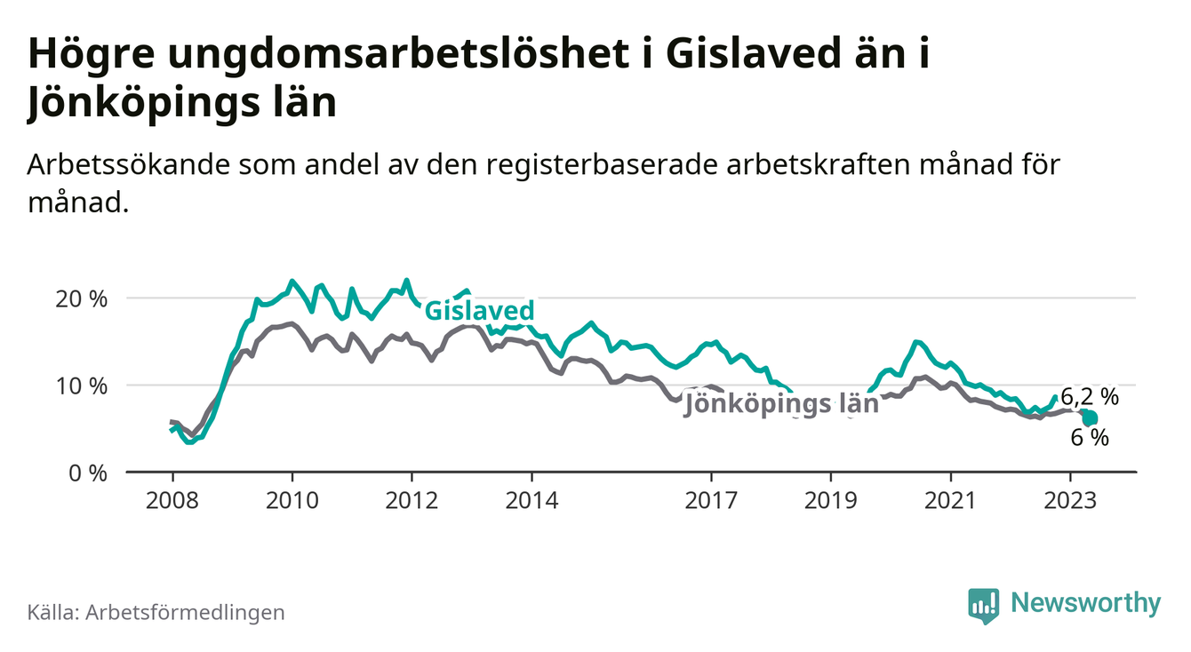 Precis som den totala arbetslösheten ligger ungdomsarbetslösheten i Gislaved högre än i Jönköpings län som helhet. Skillnaden mellan kommunen och länet är 0,2 procentenheter.