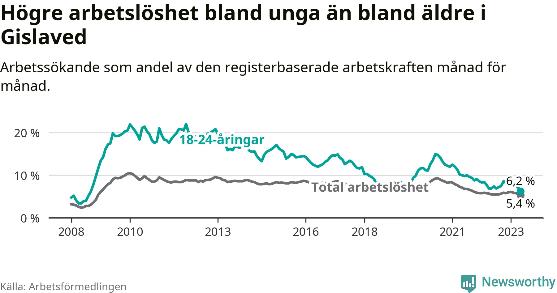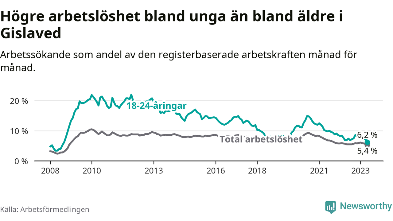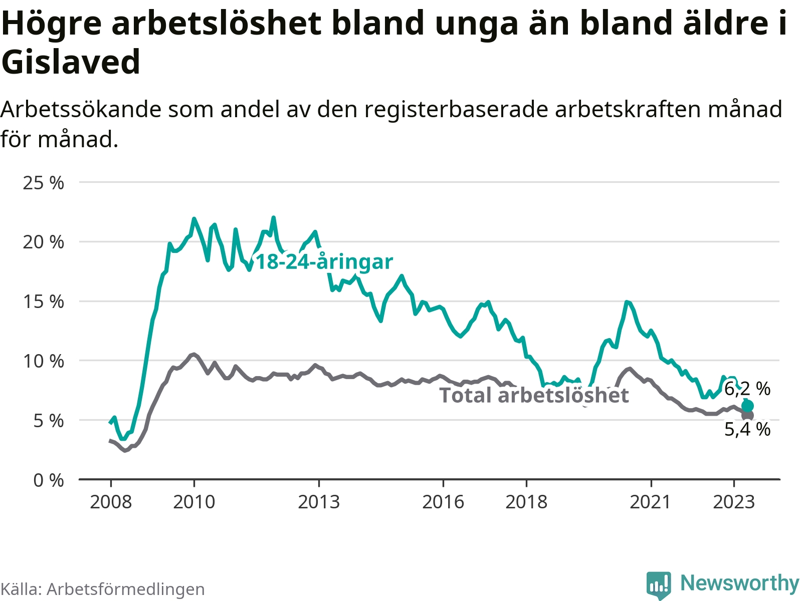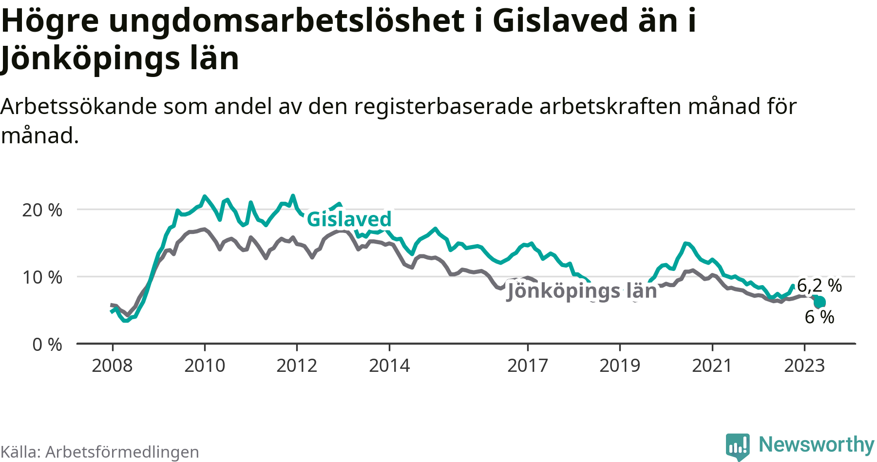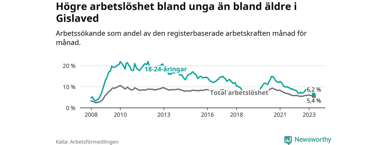 Precis som den totala arbetslösheten ligger ungdomsarbetslösheten i Gislaved högre än i Jönköpings län som helhet. Skillnaden mellan kommunen och länet är 0,2 procentenheter.