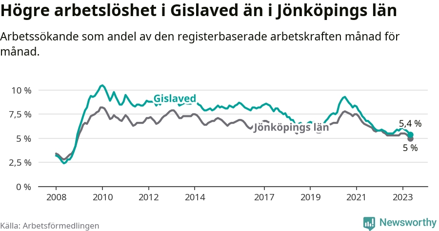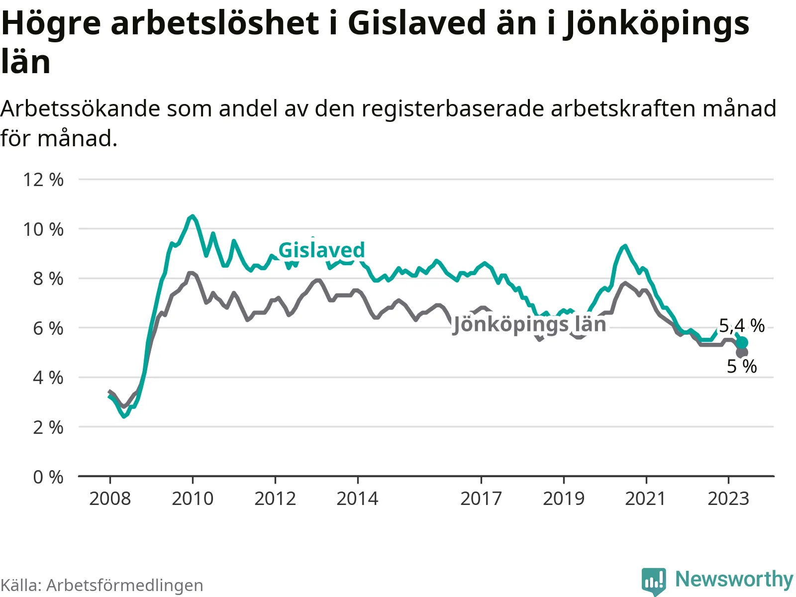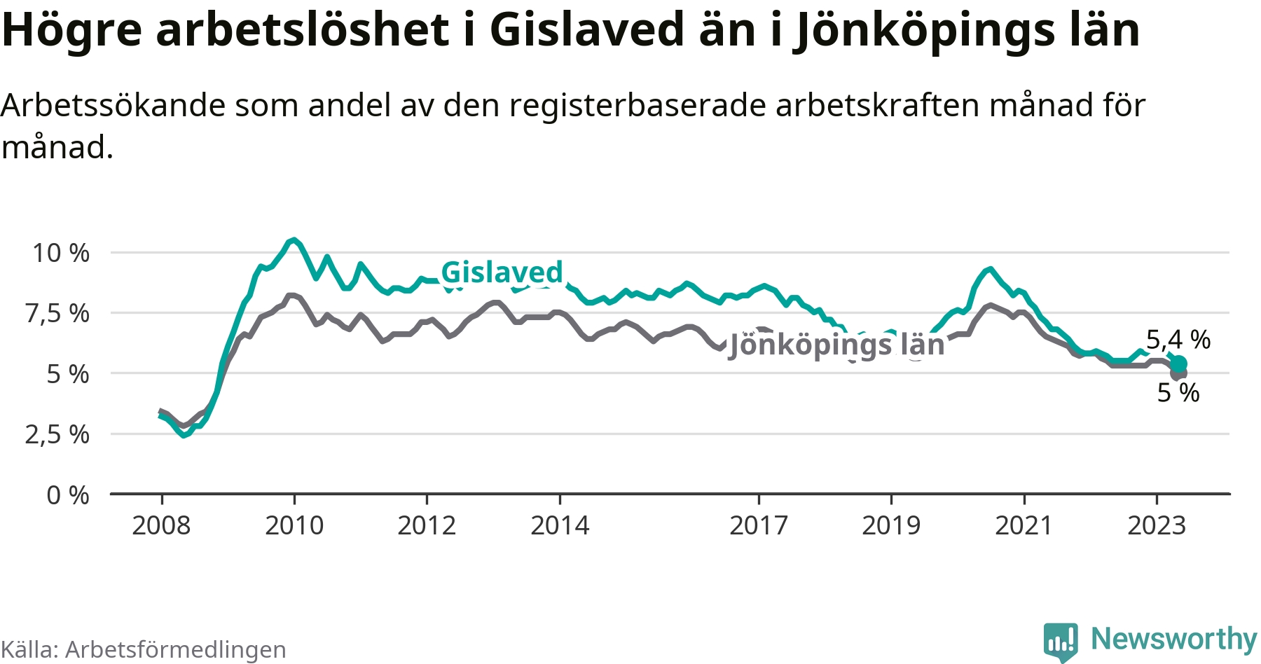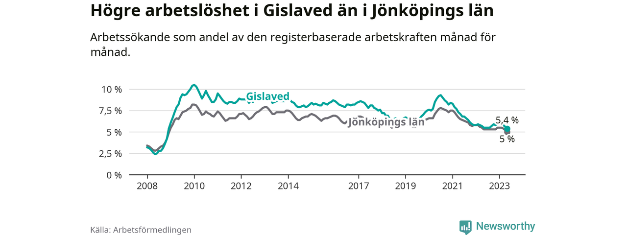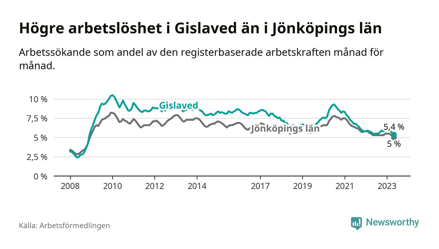 Även om arbetslösheten i Gislaved alltså minskar, så ligger den fortfarande över snittet i hela Jönköpings län (5,4 procent i kommunen, jämfört med 5,0 procent i hela länet). Habo har den lägsta arbetslösheten i länet (3,0 procent), medan Nässjö har den högsta (7,5 procent). För att Gislaved skulle komma ner i samma arbetslöshetsnivå som Habo skulle 359 personer behöva sysselsättas.