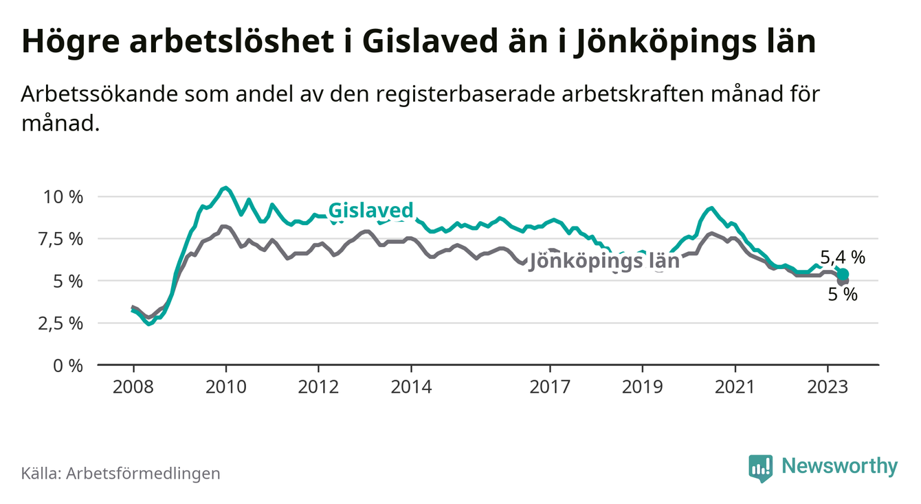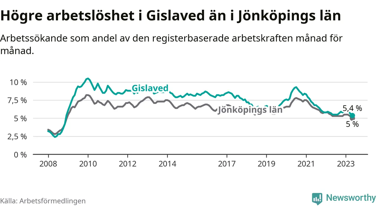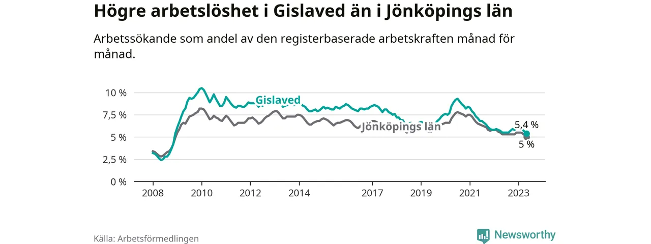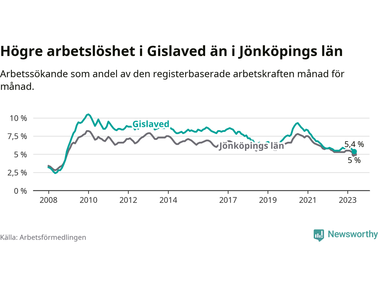 Under maj månad rapporterade Gislaveds kommun en total arbetslöshet på 5,4 procent. Det är en minskning jämfört med samma tidpunkt i fjol (−0,1 procentenheter). Även i Jönköpings län sjunker arbetslösheten .