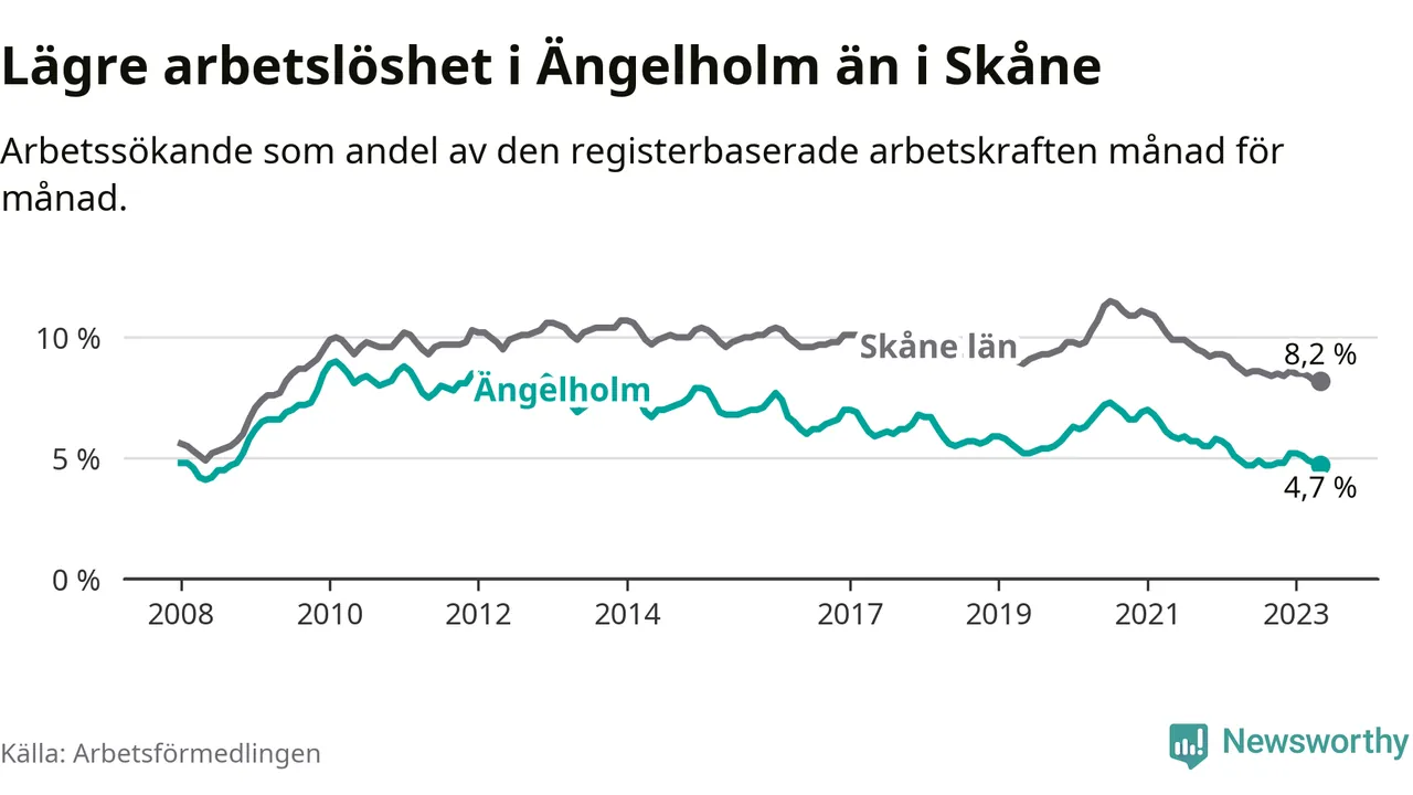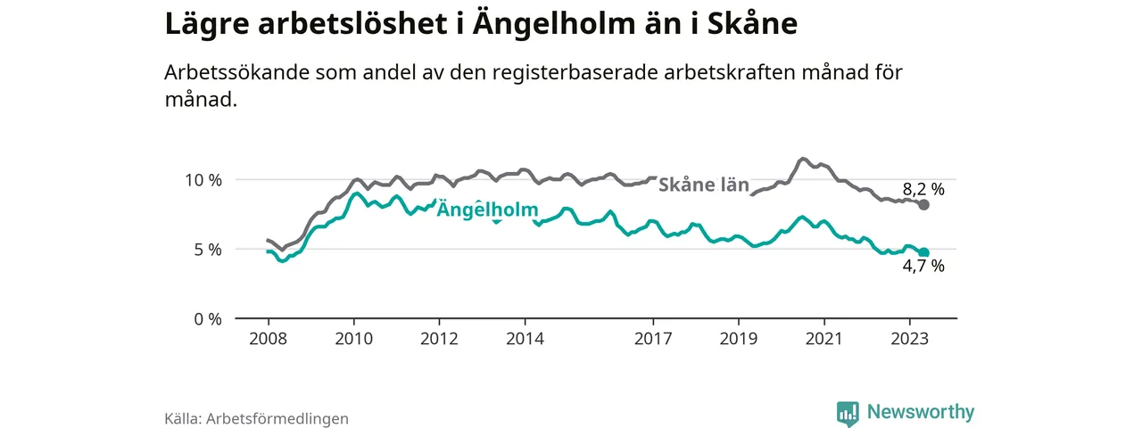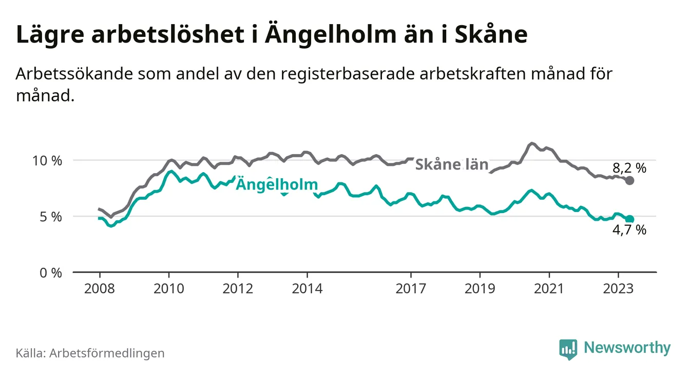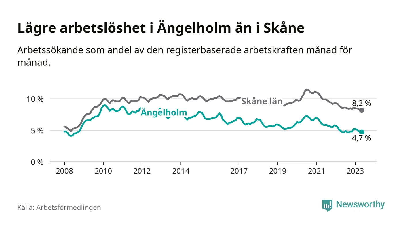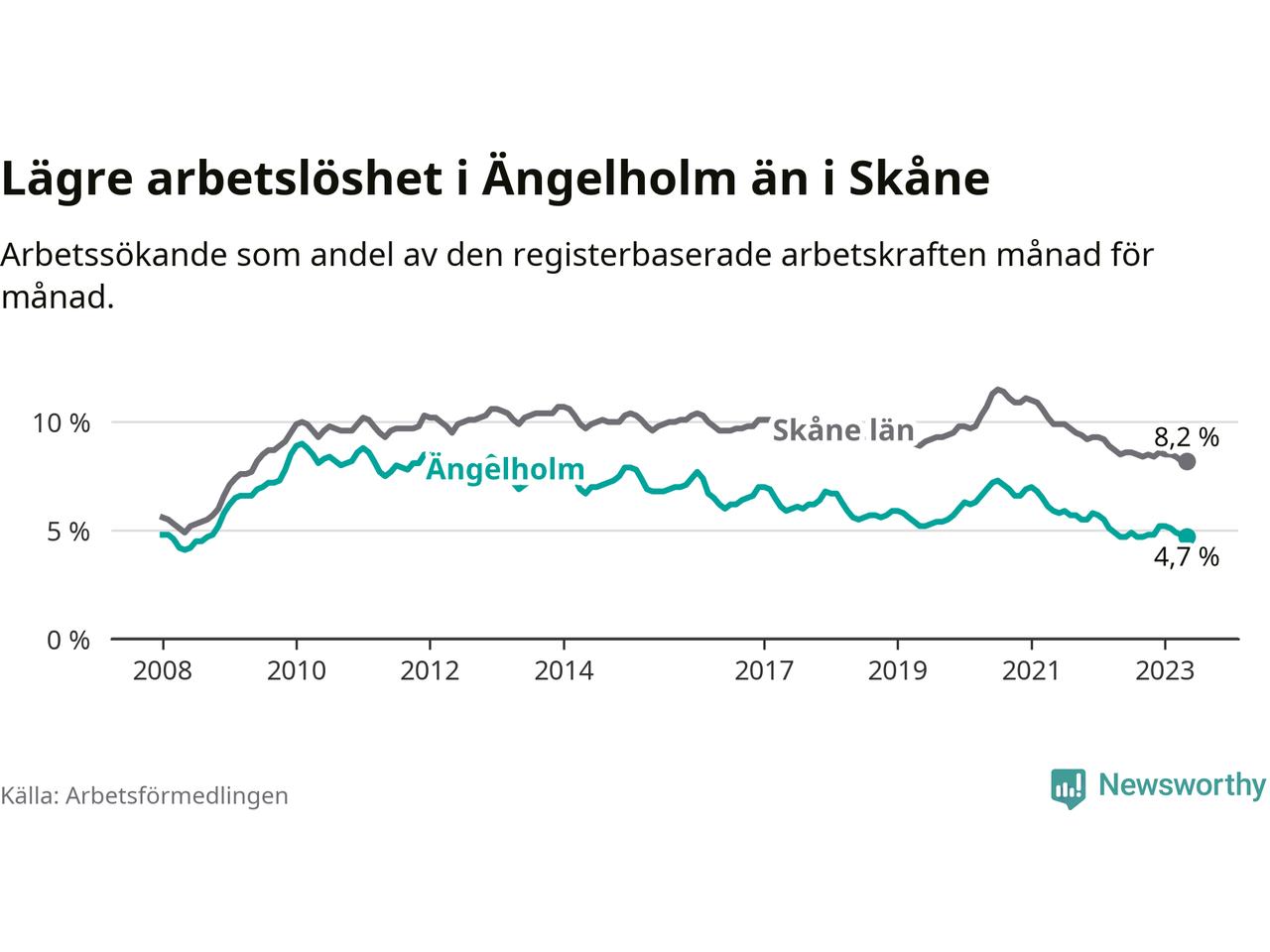 Under maj månad rapporterade Ängelholms kommun en total arbetslöshet på 4,7 procent. Det är i samma nivå som i maj i fjol. I Skåne län däremot sjunker arbetslösheten