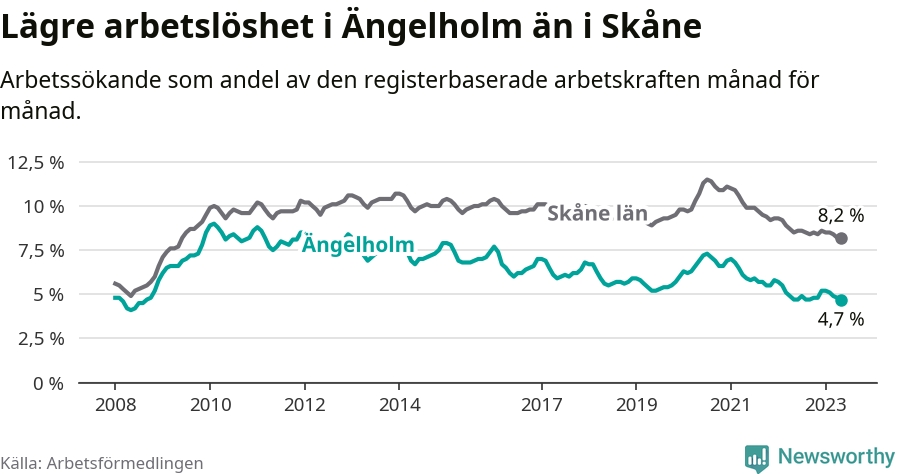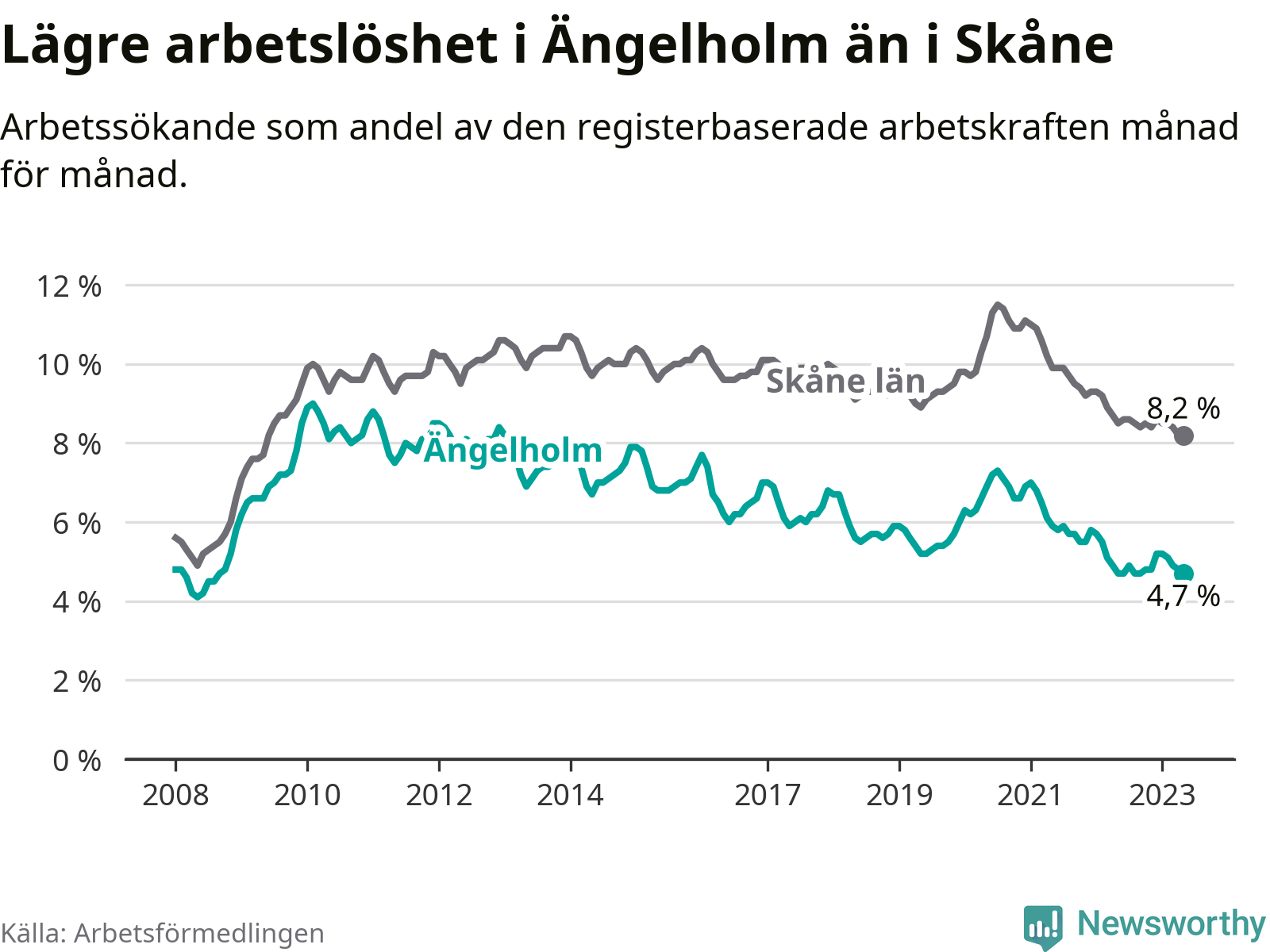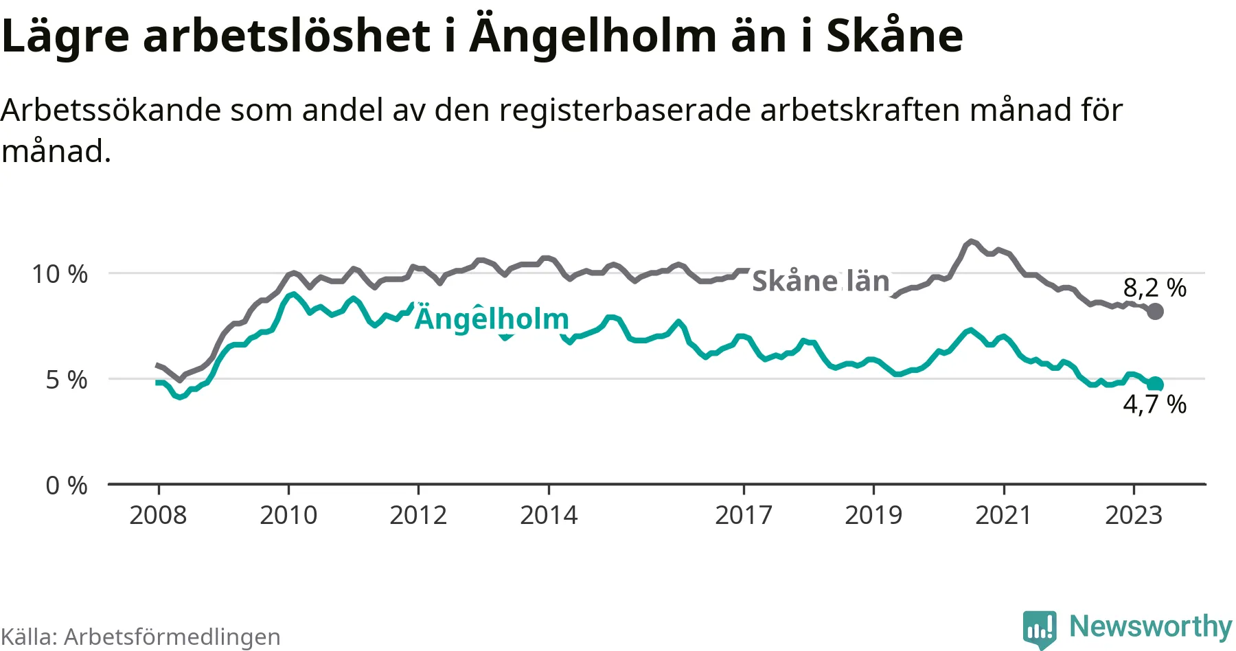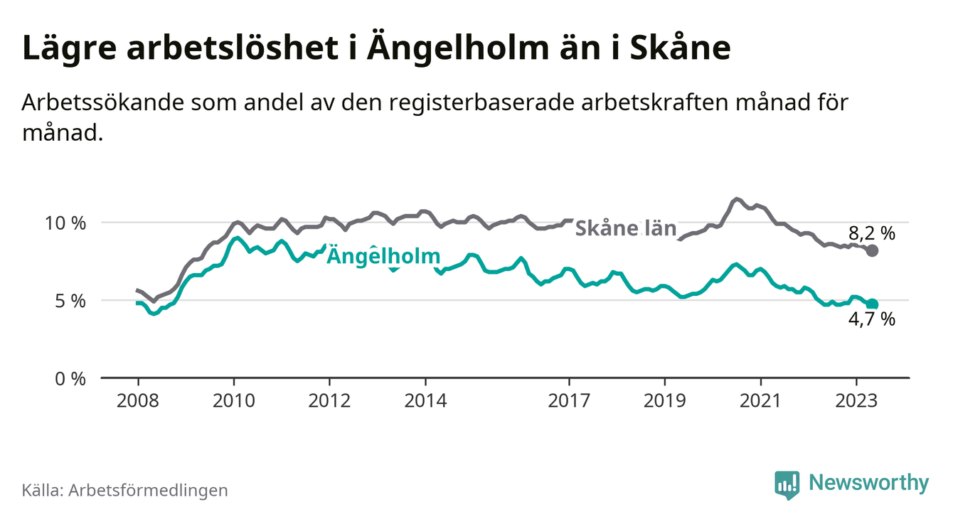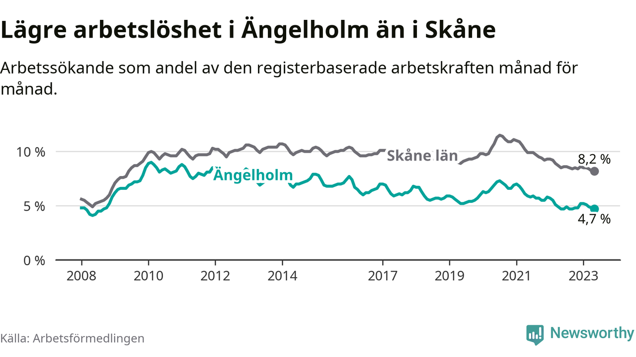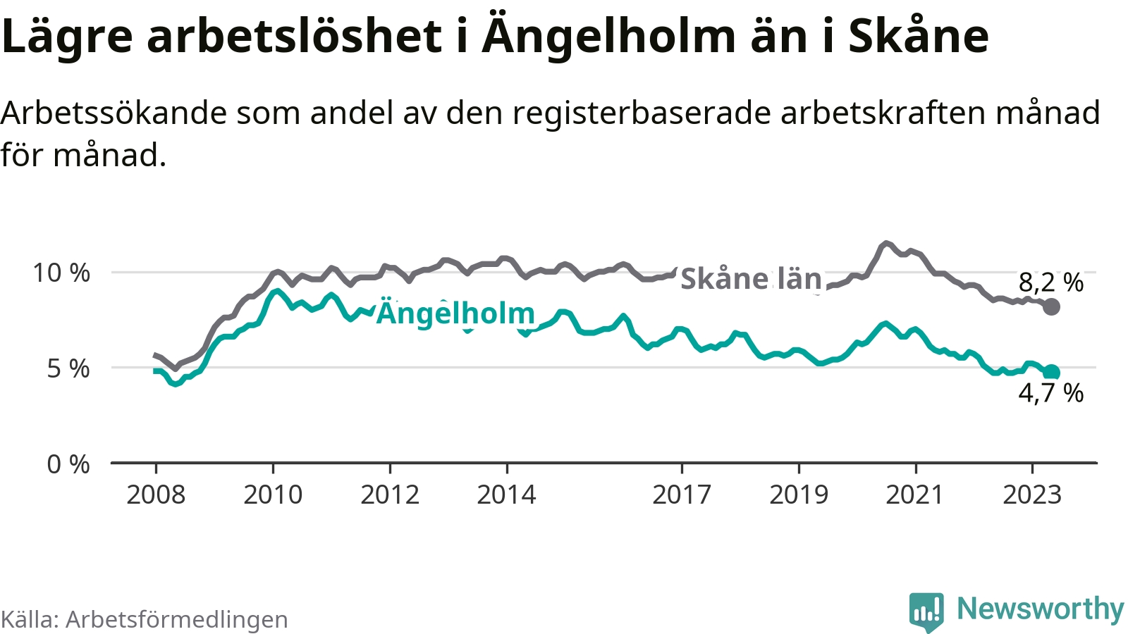 Under maj månad rapporterade Ängelholms kommun en total arbetslöshet på 4,7 procent. Det är i samma nivå som i maj i fjol. I Skåne län däremot sjunker arbetslösheten