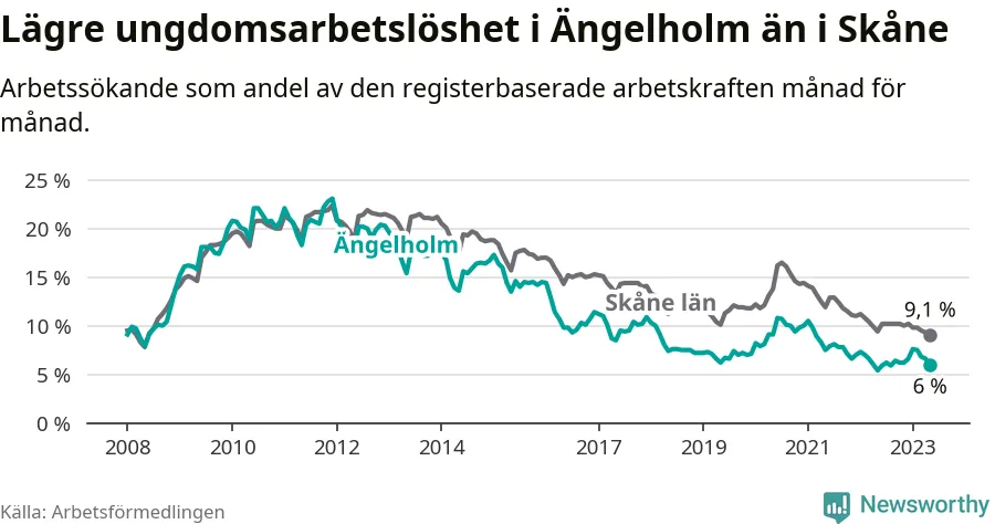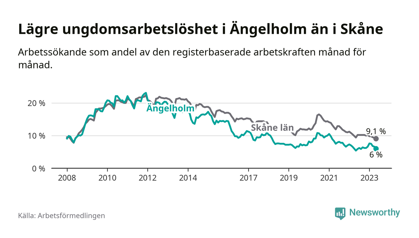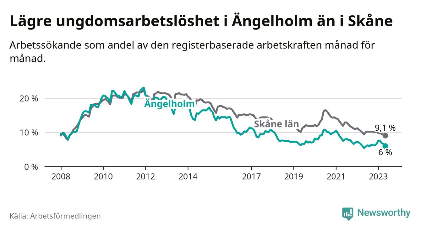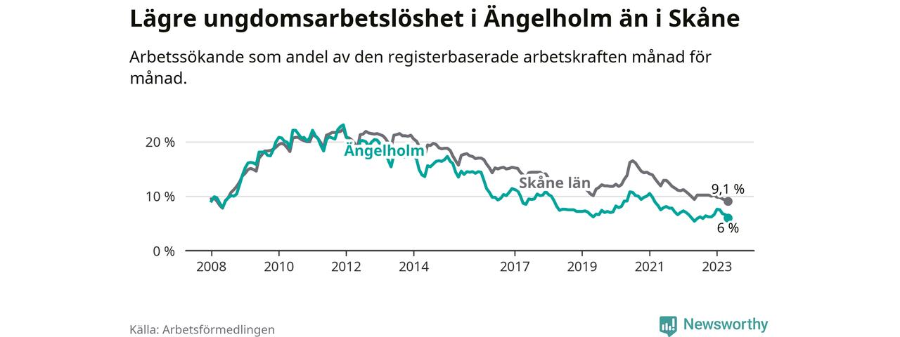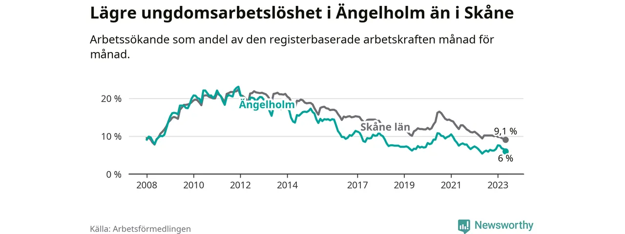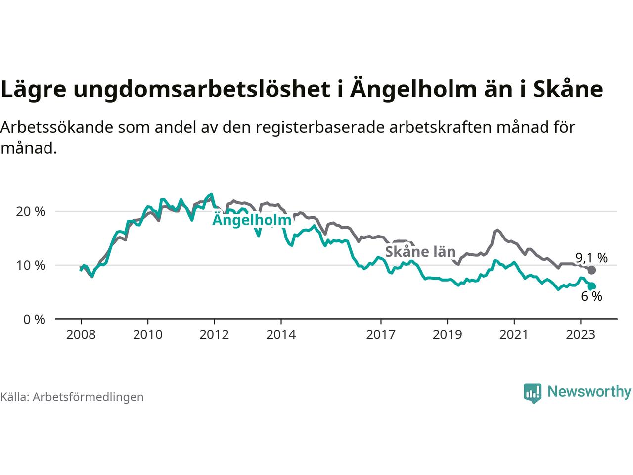 Precis som den totala arbetslösheten ligger ungdomsarbetslösheten i Ängelholm lägre än i Skåne som helhet. Skillnaden mellan kommunen och länet är 3,1 procentenheter.
