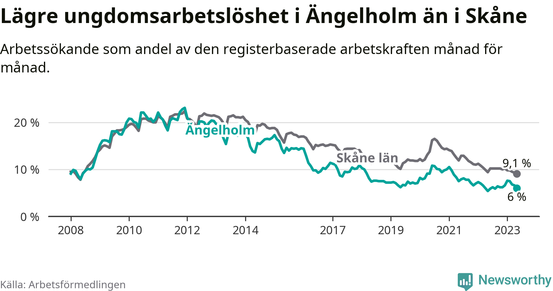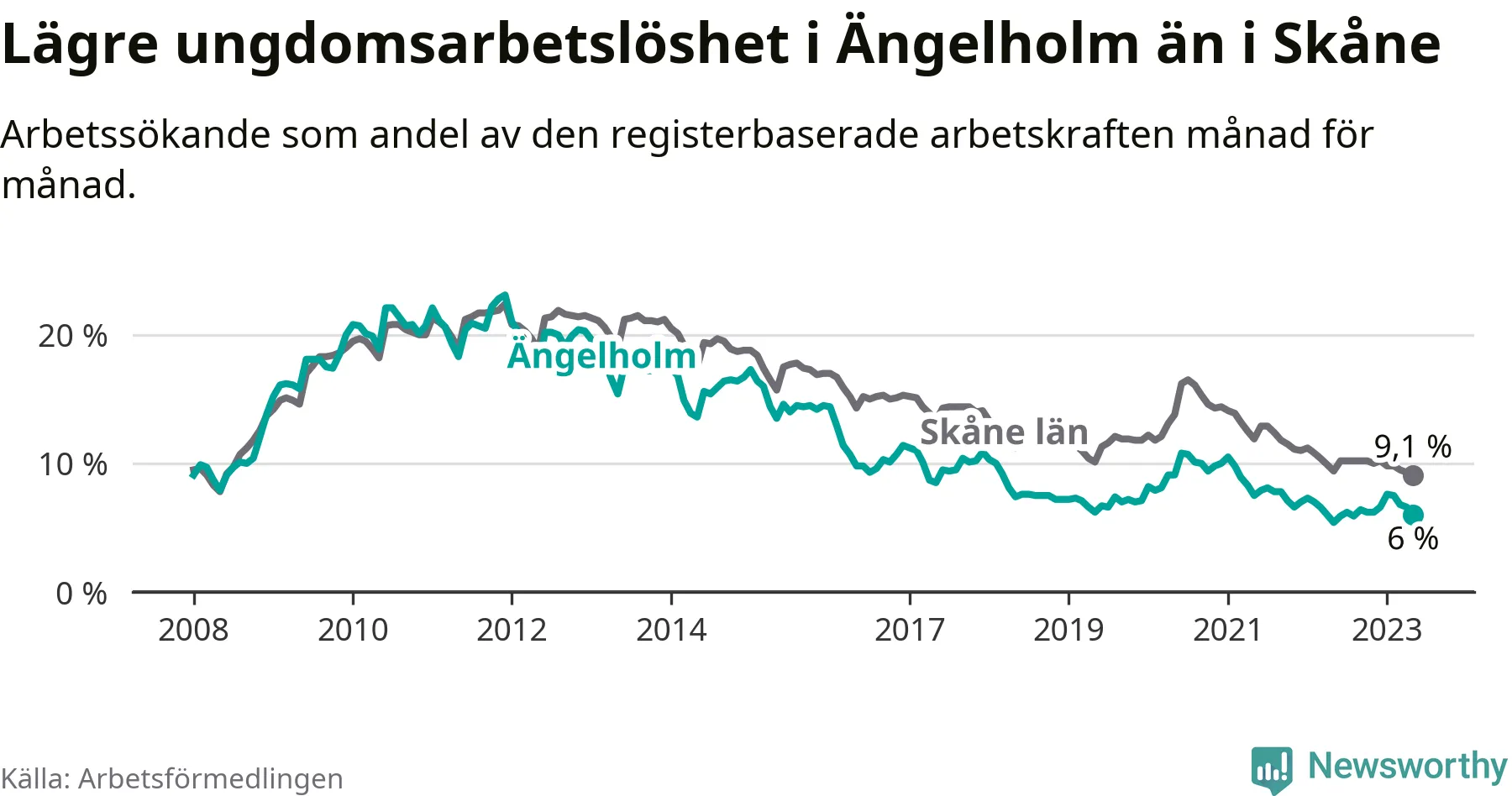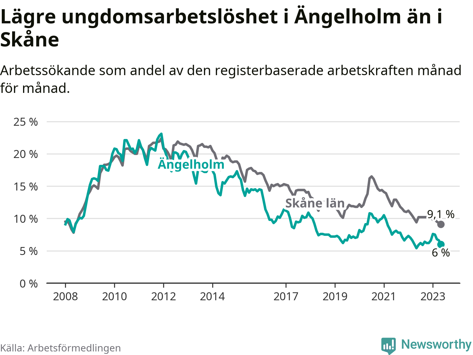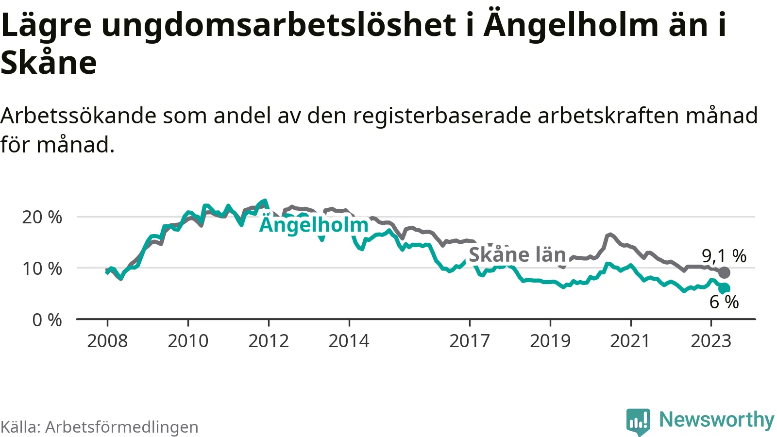Precis som den totala arbetslösheten ligger ungdomsarbetslösheten i Ängelholm lägre än i Skåne som helhet. Skillnaden mellan kommunen och länet är 3,1 procentenheter.