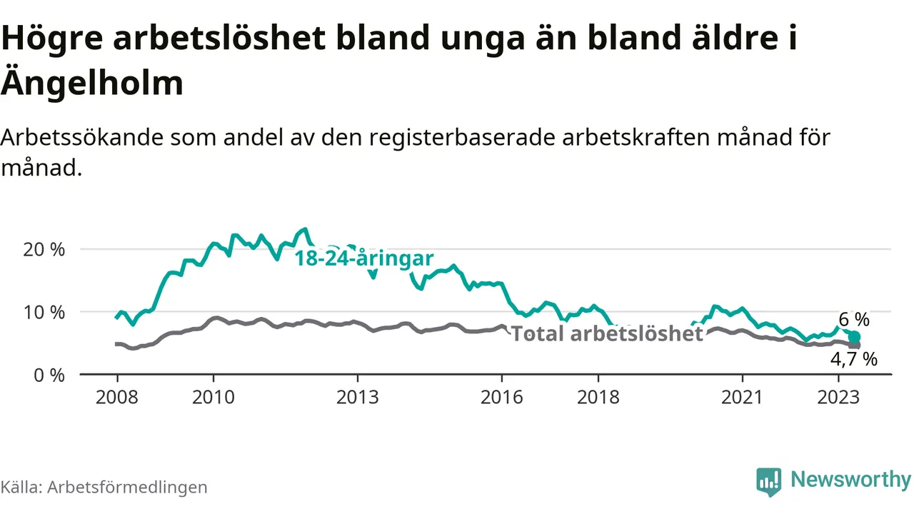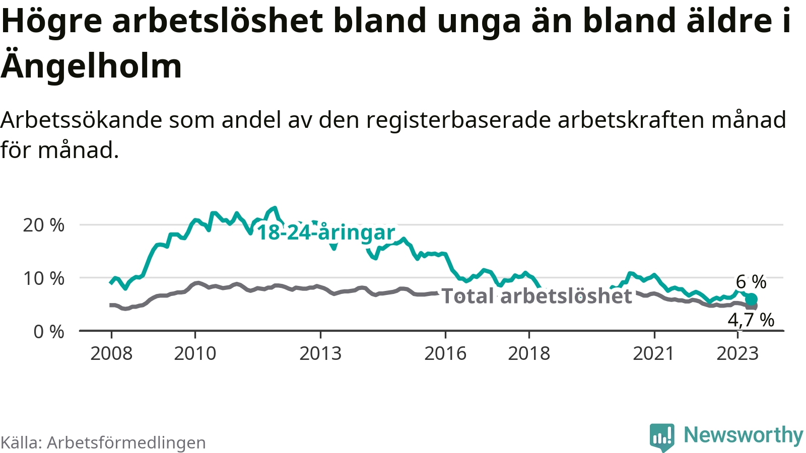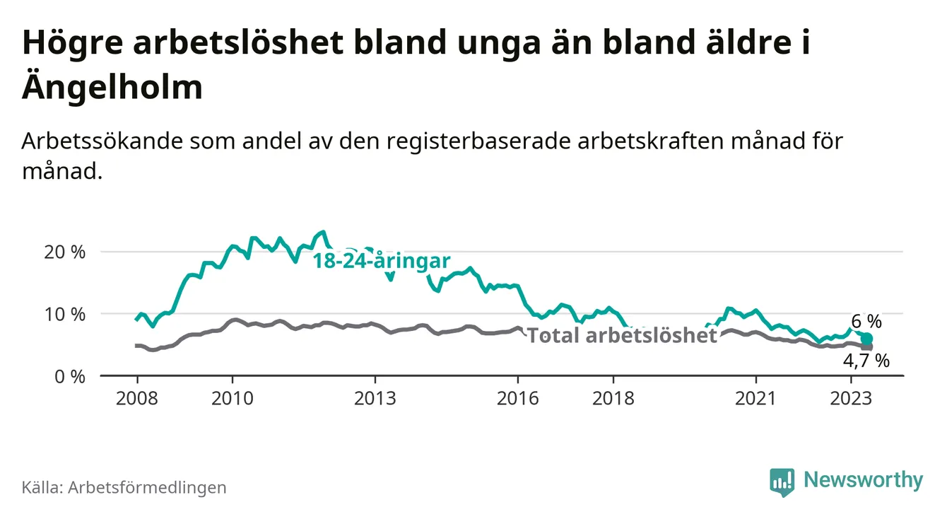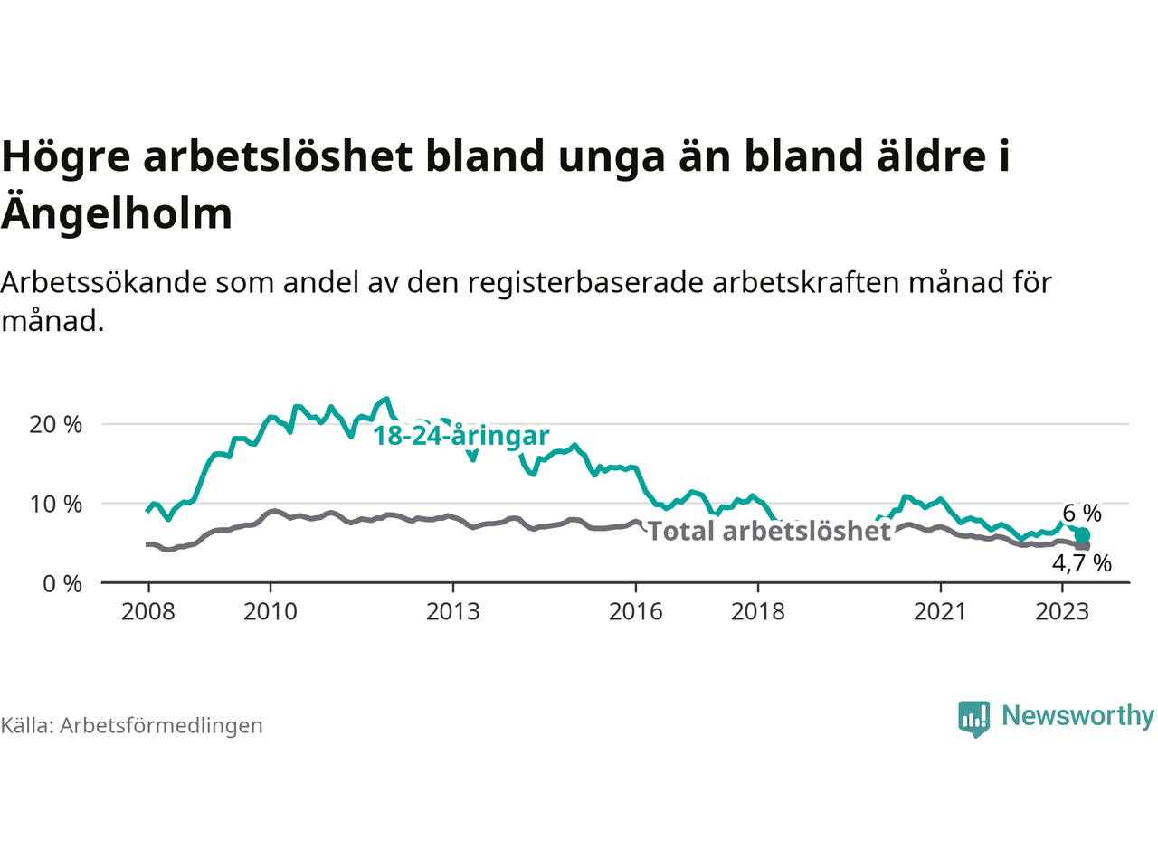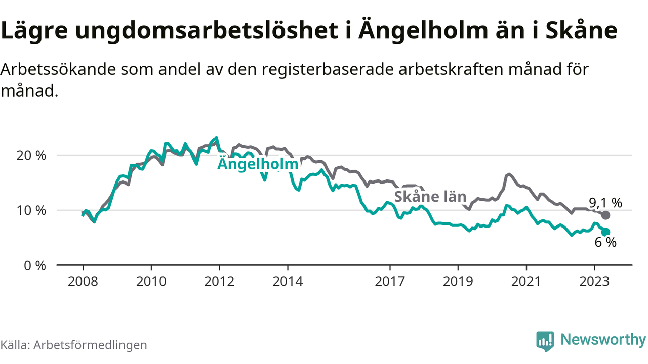 Precis som den totala arbetslösheten ligger ungdomsarbetslösheten i Ängelholm lägre än i Skåne som helhet. Skillnaden mellan kommunen och länet är 3,1 procentenheter.