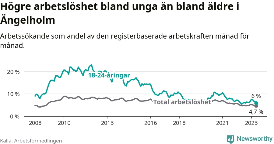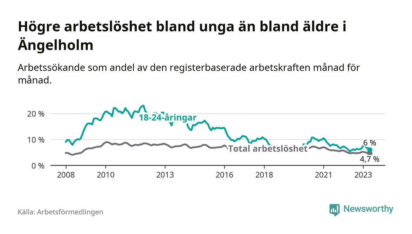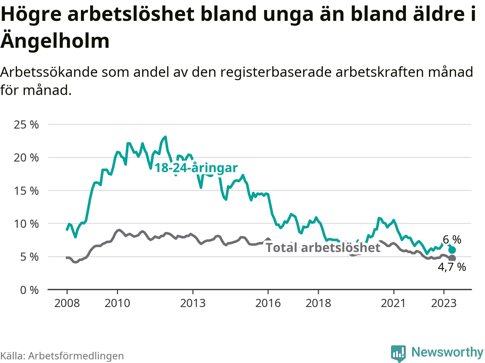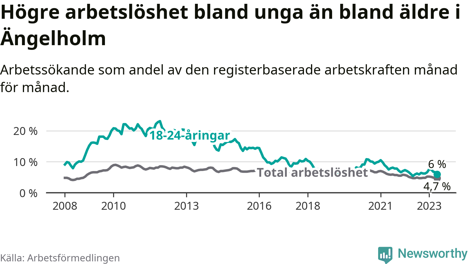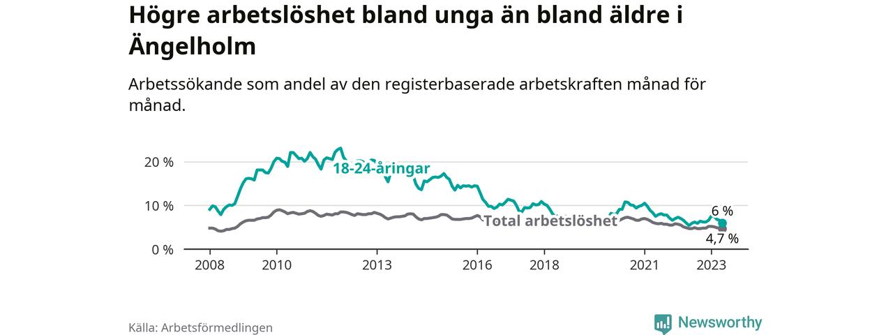 Precis som den totala arbetslösheten ligger ungdomsarbetslösheten i Ängelholm lägre än i Skåne som helhet. Skillnaden mellan kommunen och länet är 3,1 procentenheter.