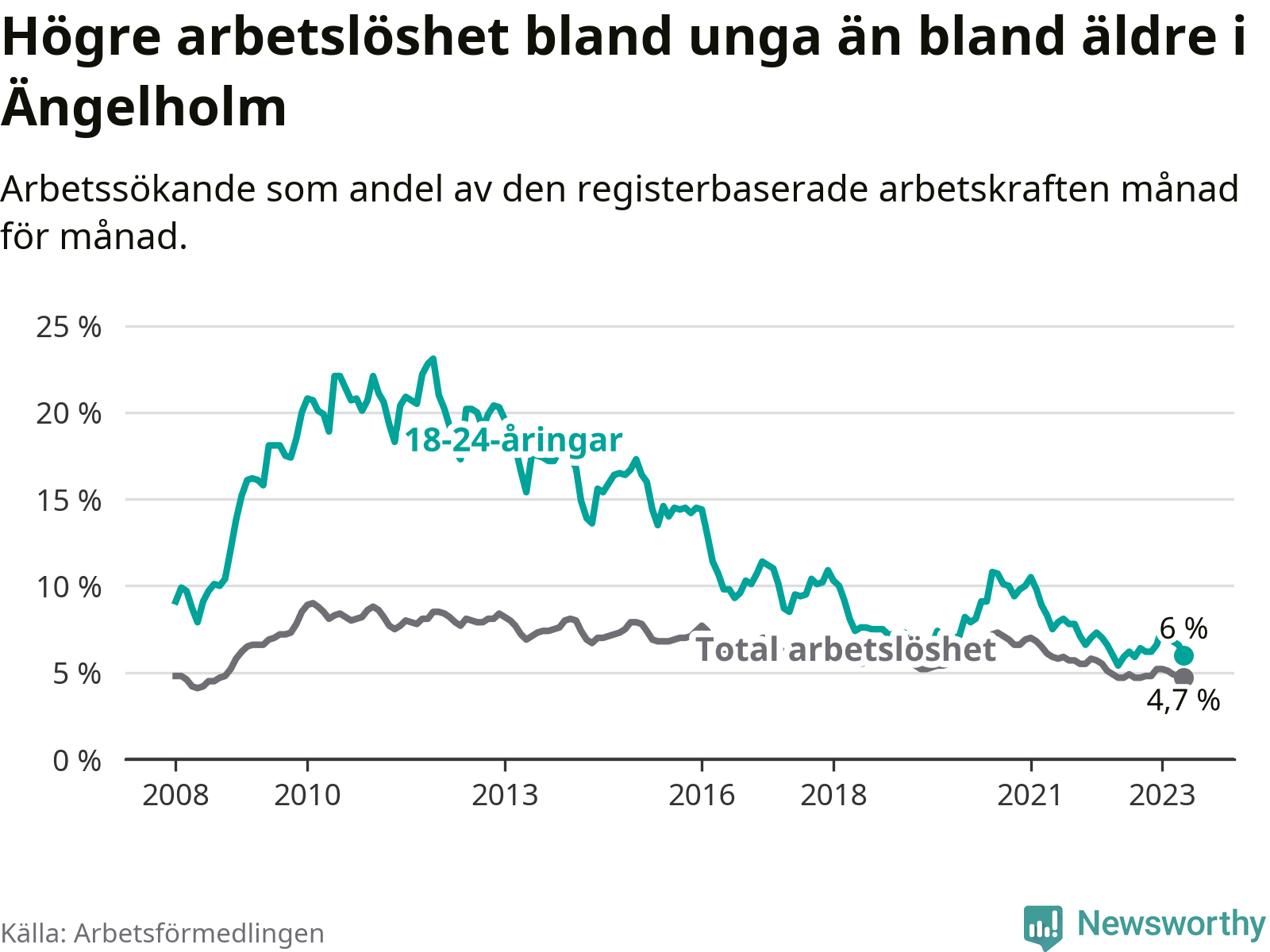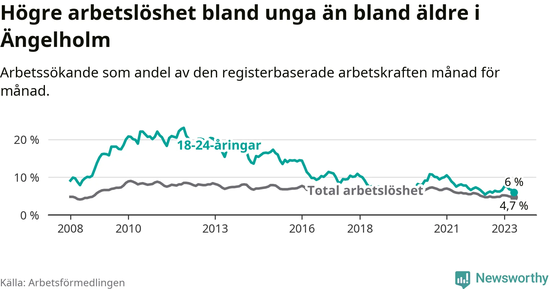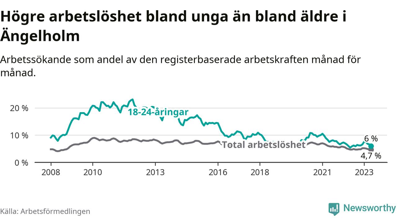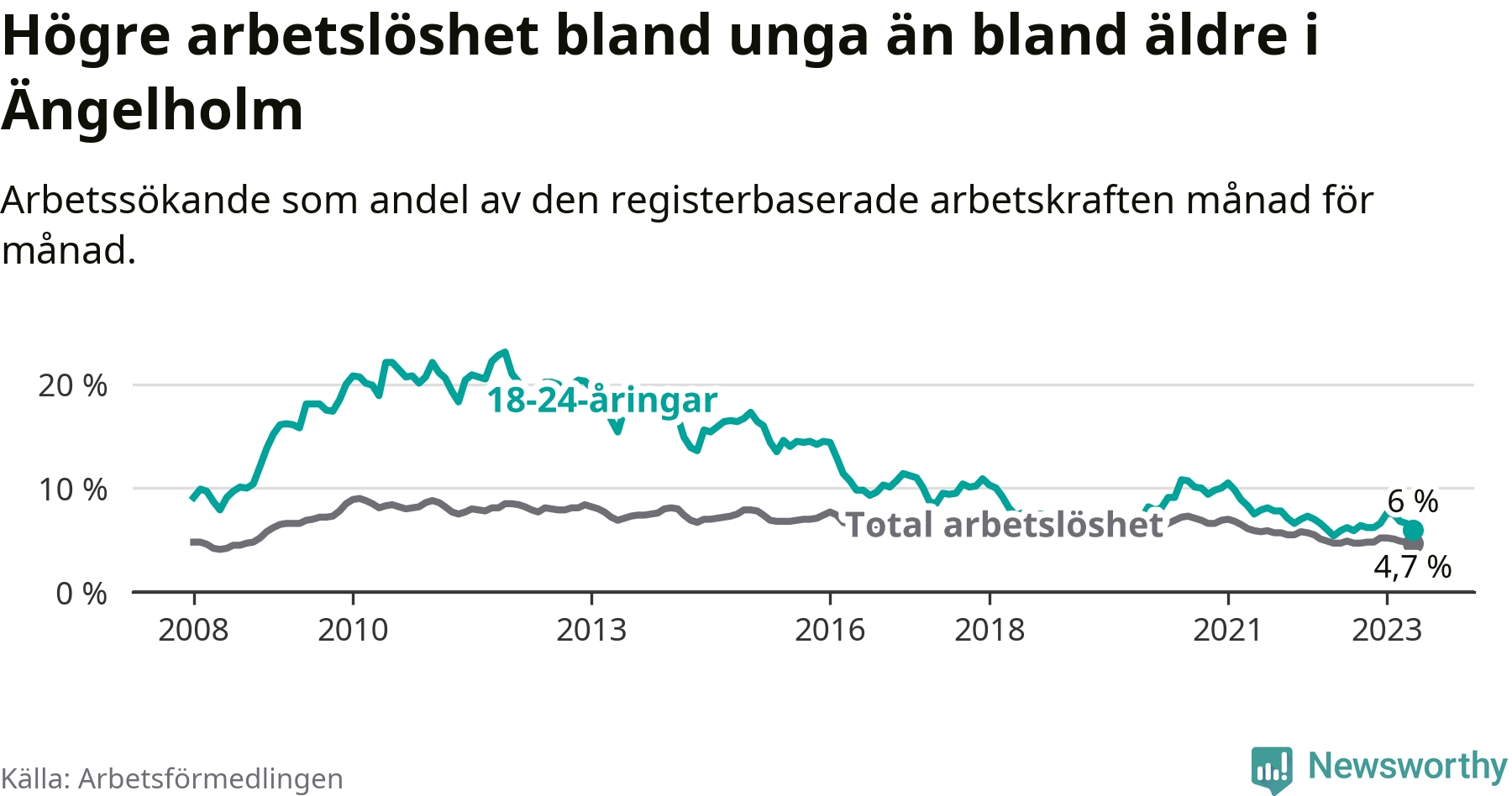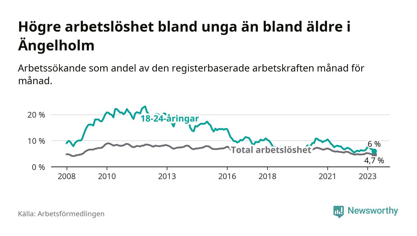 Till skillnad från den totala arbetslösheten stiger arbetslösheten bland unga (+0,6 procentenheter). I maj var 6,0 procent av 18–24-åringarna inskrivna som arbetssökande (motsvarande 111 personer). Mäter vi antalet inskrivna ser vi en ökning med 14 personer på ett års sikt.