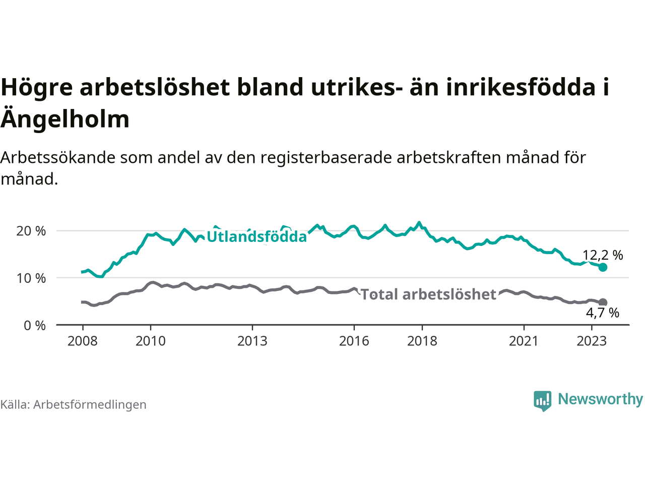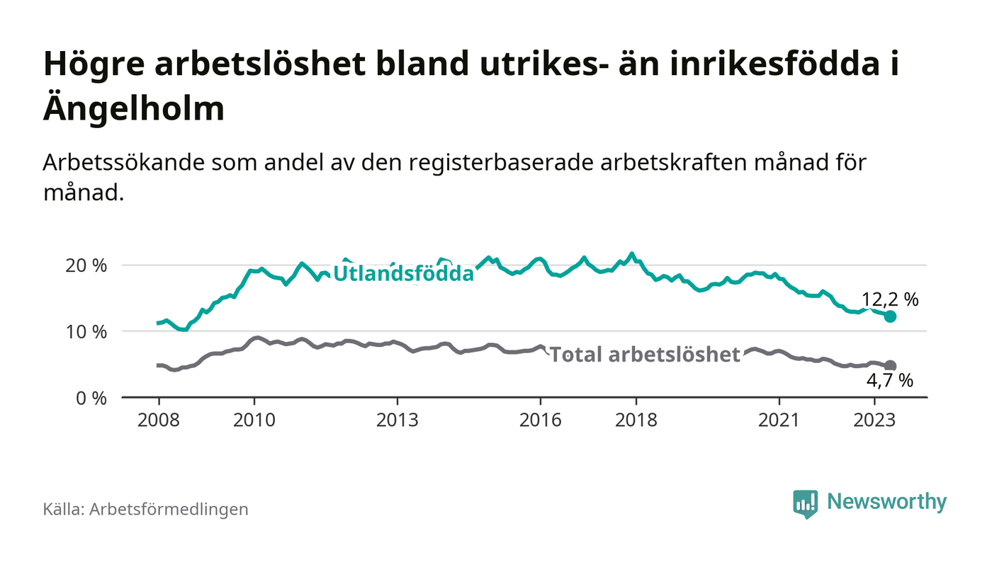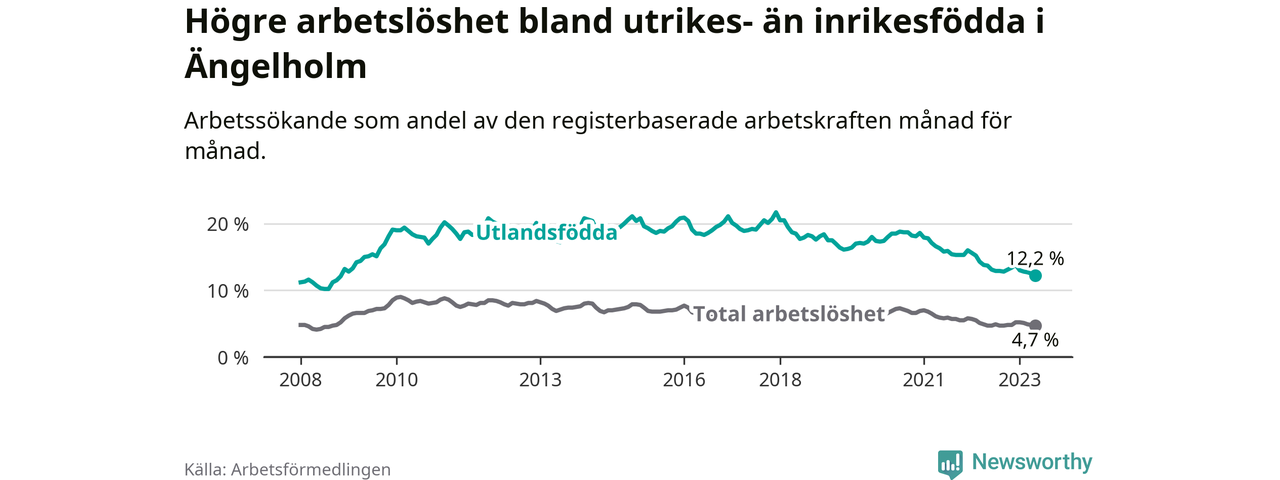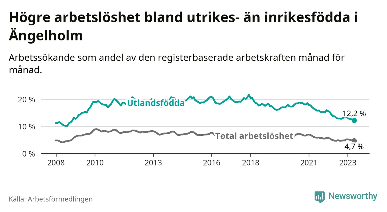 Arbetslösheten bland utlandsfödda var 12,2 procent i Ängelholm under maj månad, motsvarande 409 av 3 352 personer. Det är 1,5 procentenheter färre än vid samma tidpunkt i fjol (−13 om man räknar personer). Därmed har de utlandsföddas arbetslöshet varit lägre än vid samma tidpunkt i fjol i över två år i sträck. Sedan februari 2021 har arbetslösheten bland utlandsfödda minskat från 17,8 till 12,2 procent. Den nuvarande arbetslöshetsnivån är den lägsta sedan november 2008.