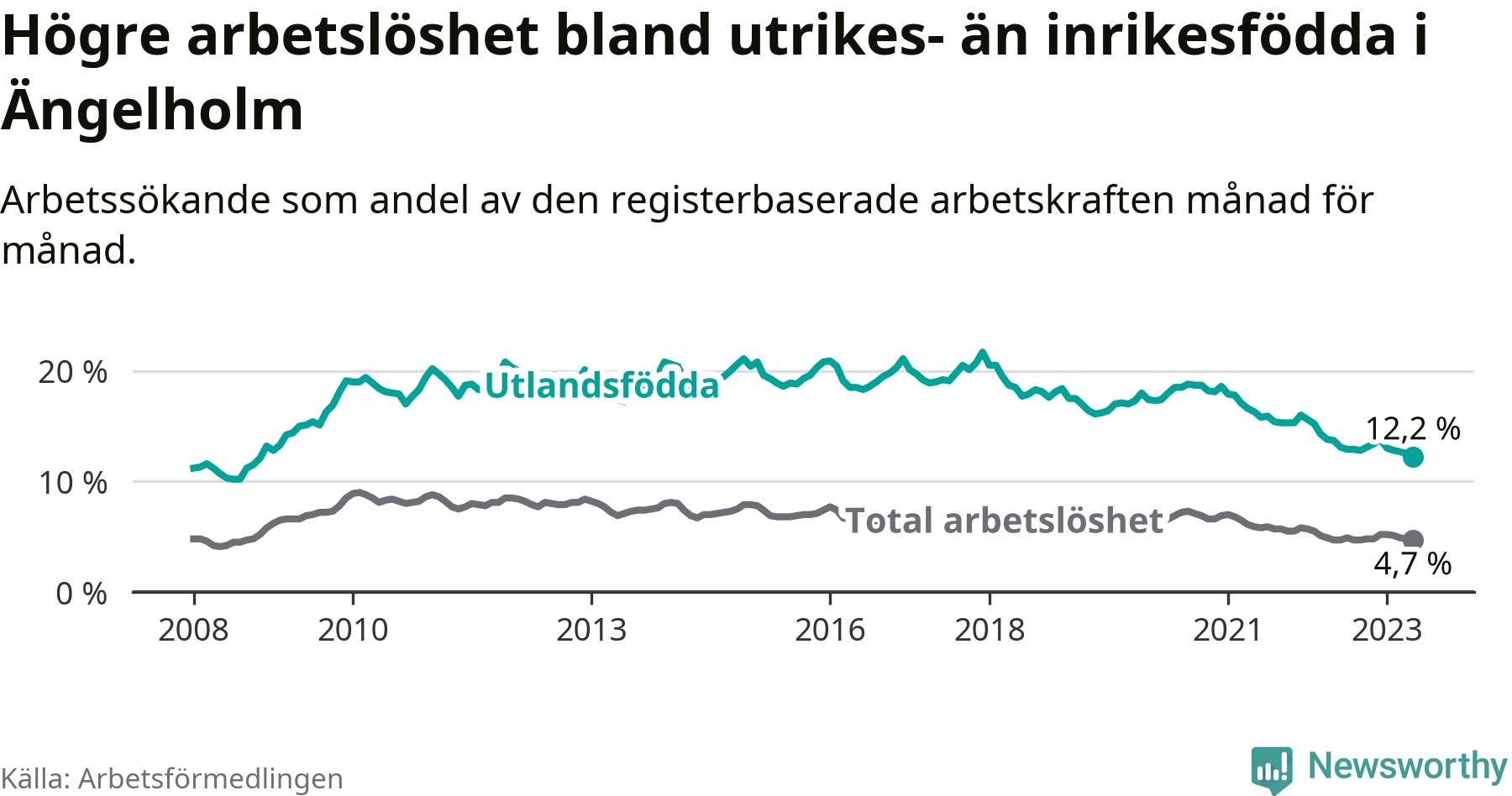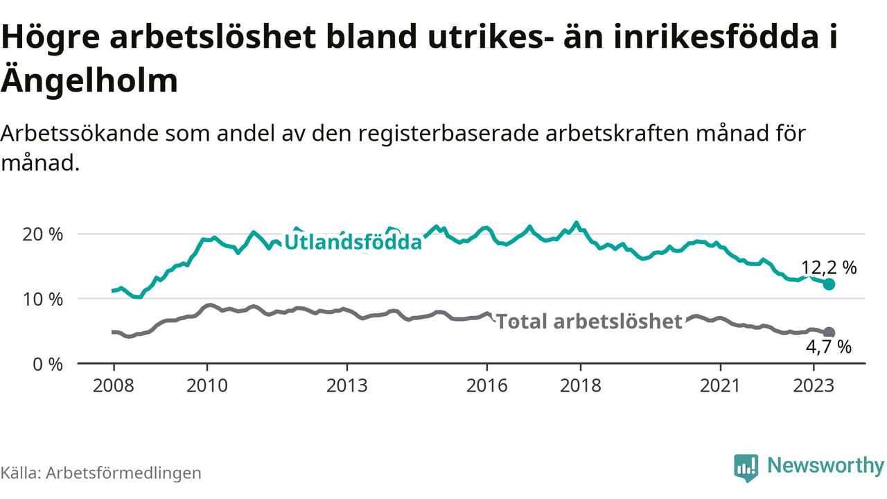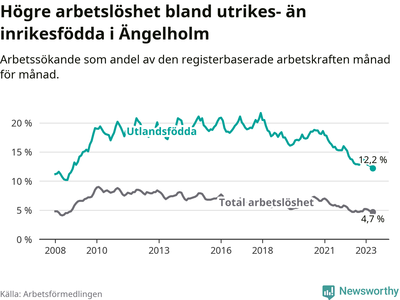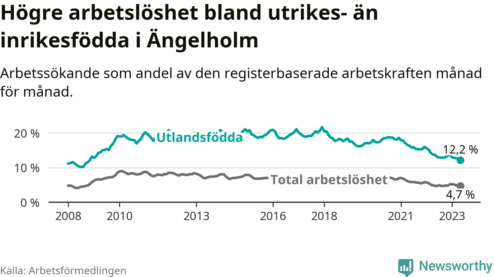Arbetslösheten bland utlandsfödda var 12,2 procent i Ängelholm under maj månad, motsvarande 409 av 3 352 personer. Det är 1,5 procentenheter färre än vid samma tidpunkt i fjol (−13 om man räknar personer). Därmed har de utlandsföddas arbetslöshet varit lägre än vid samma tidpunkt i fjol i över två år i sträck. Sedan februari 2021 har arbetslösheten bland utlandsfödda minskat från 17,8 till 12,2 procent. Den nuvarande arbetslöshetsnivån är den lägsta sedan november 2008.