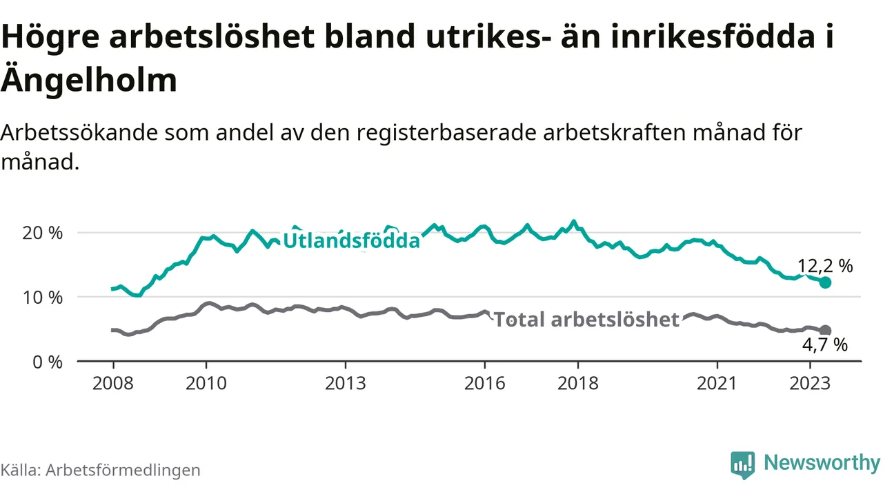 Skillnaden i arbetslöshet mellan utrikesfödda och hela befolkningen är 7,5 procentenheter i Ängelholm. Det är en betydligt mindre skillnad än för ett år sedan (−1,5 procentenheter).