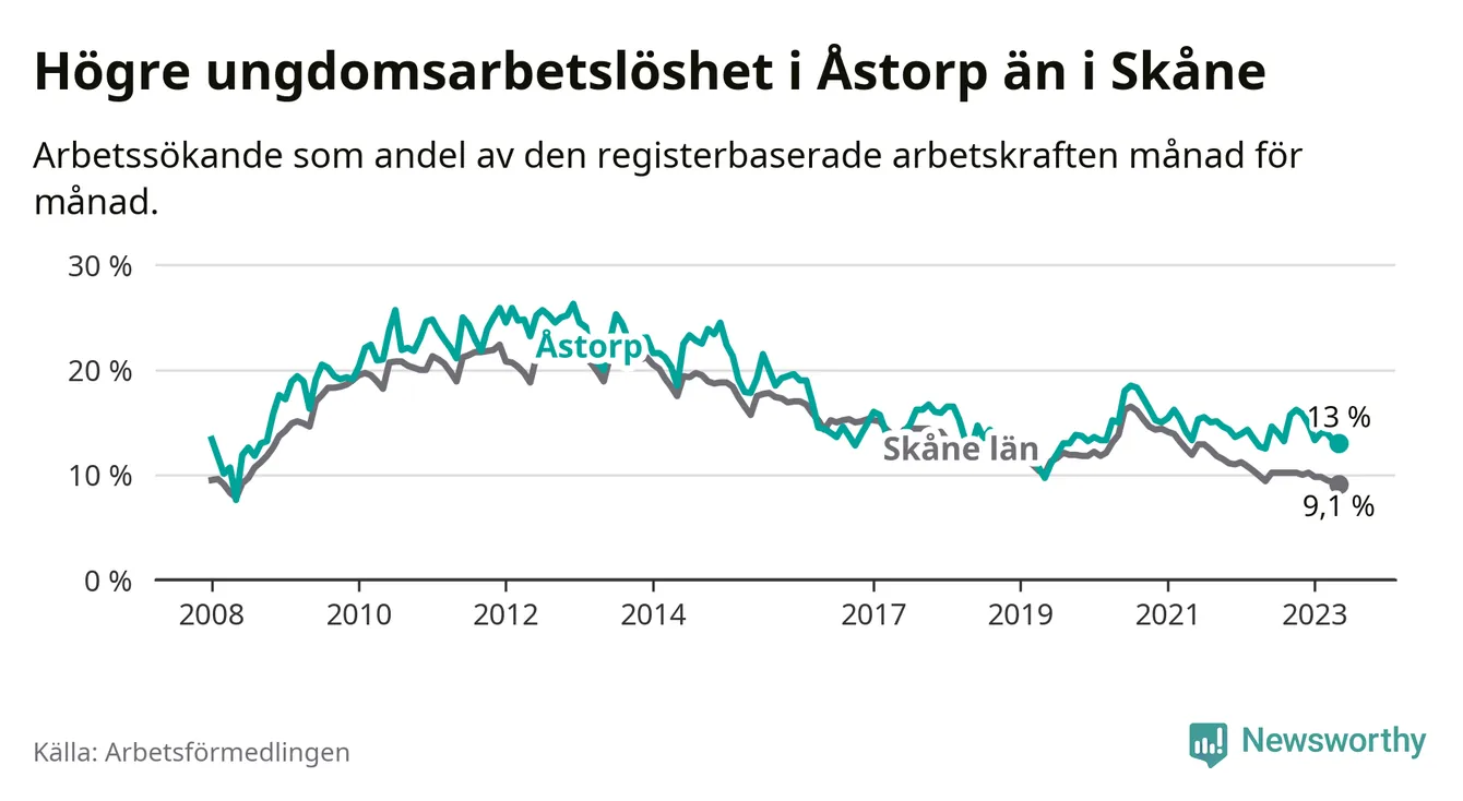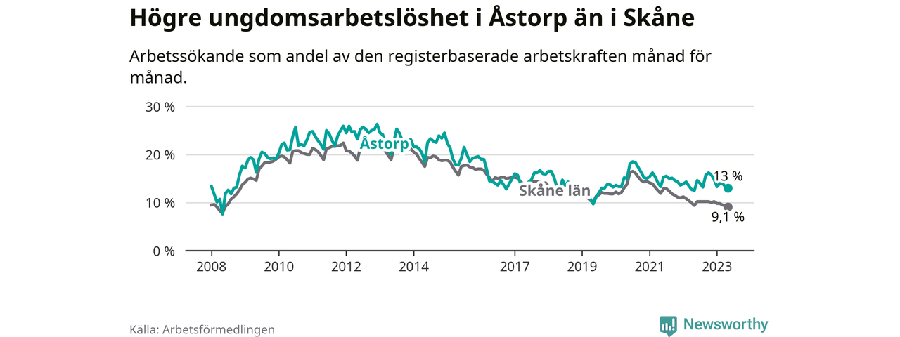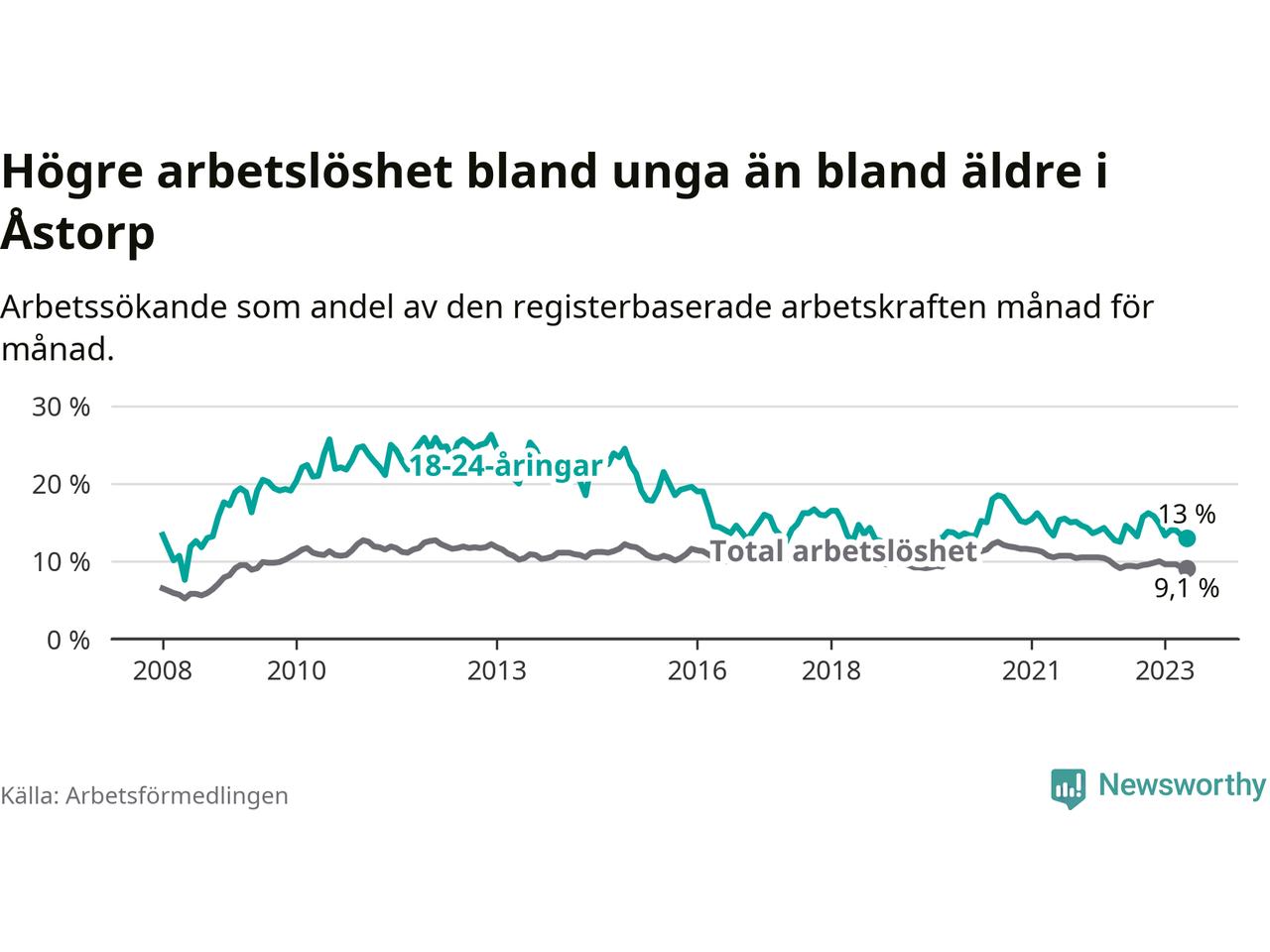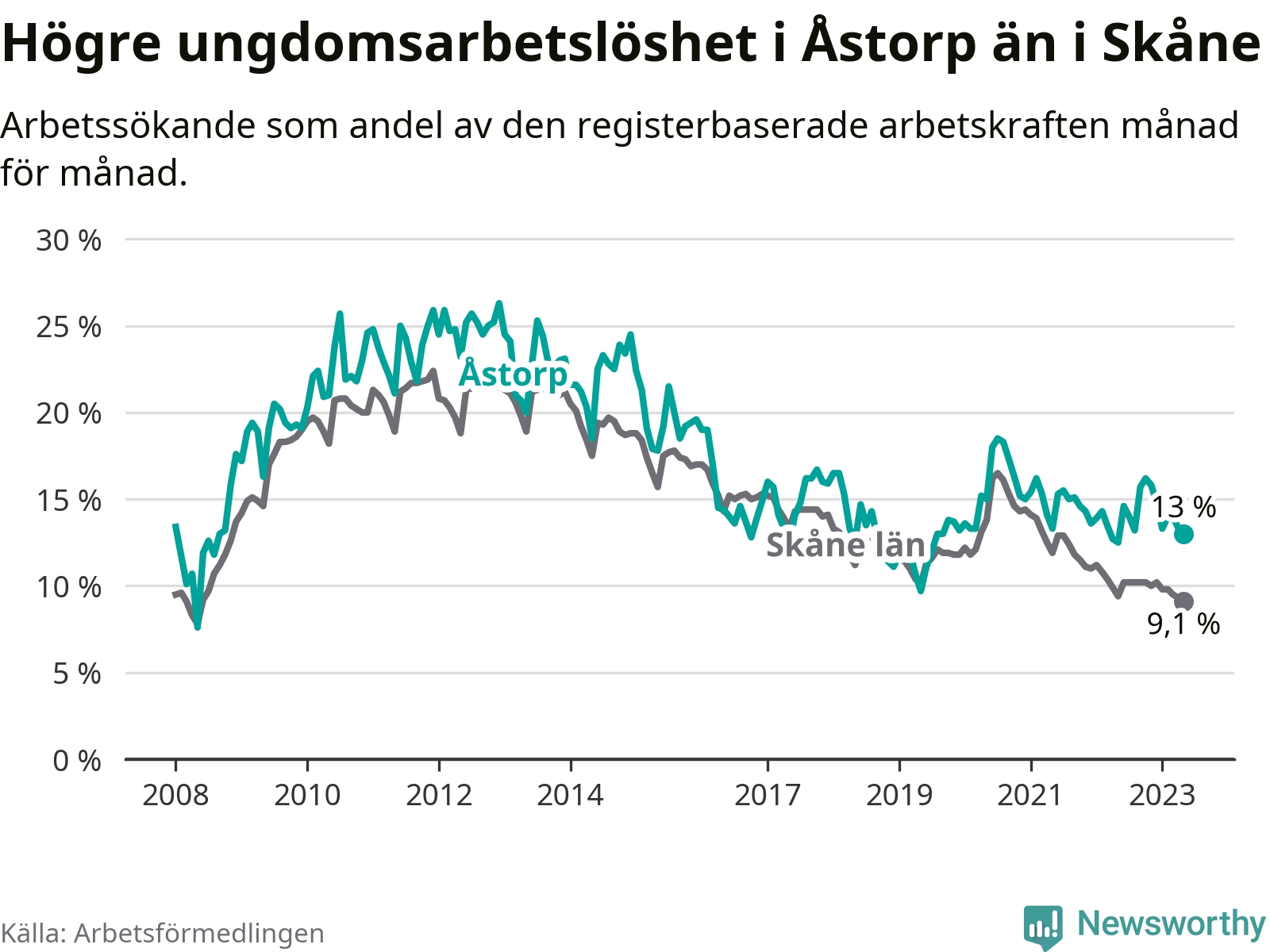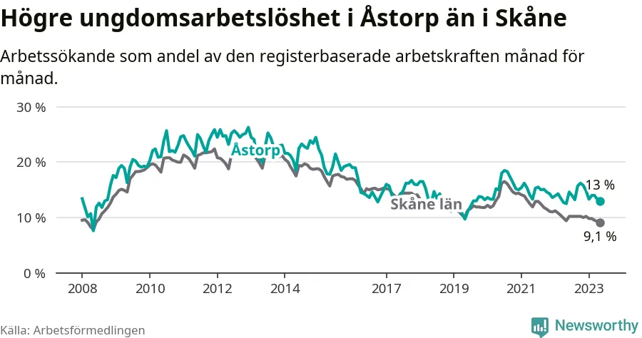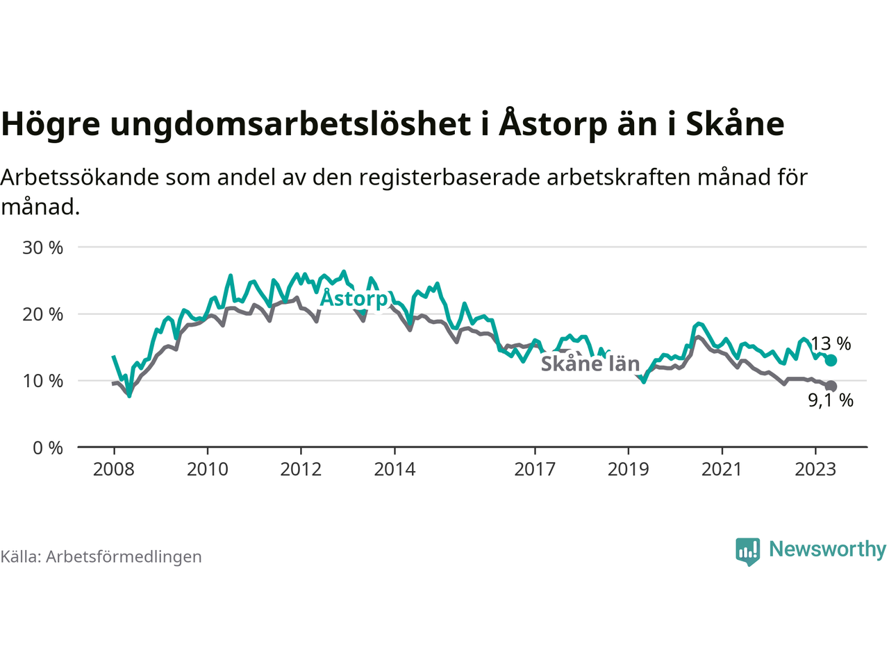 Precis som den totala arbetslösheten ligger ungdomsarbetslösheten i Åstorp högre än i Skåne som helhet. Skillnaden mellan kommunen och länet är 3,9 procentenheter.