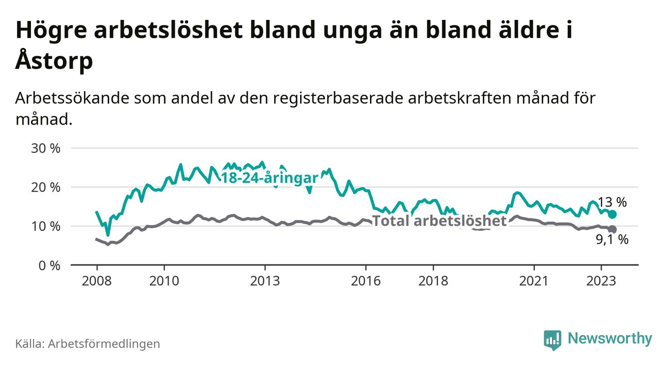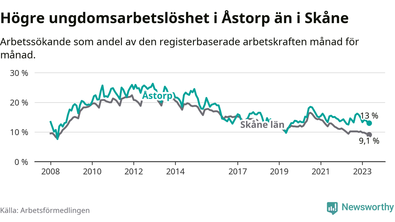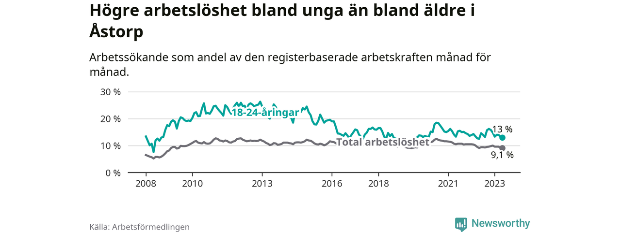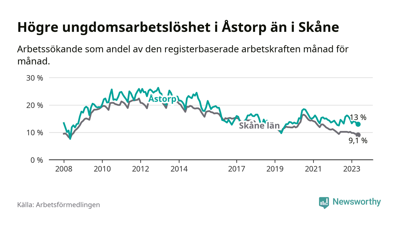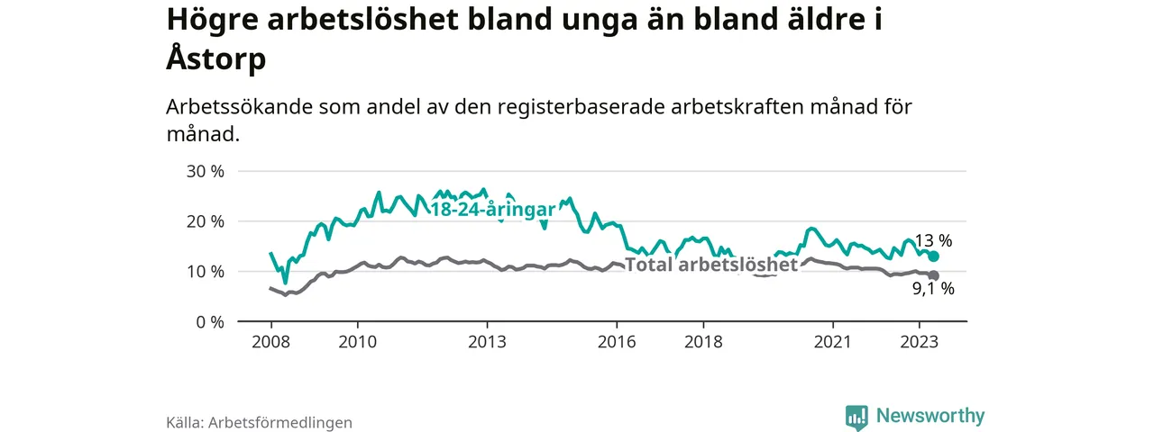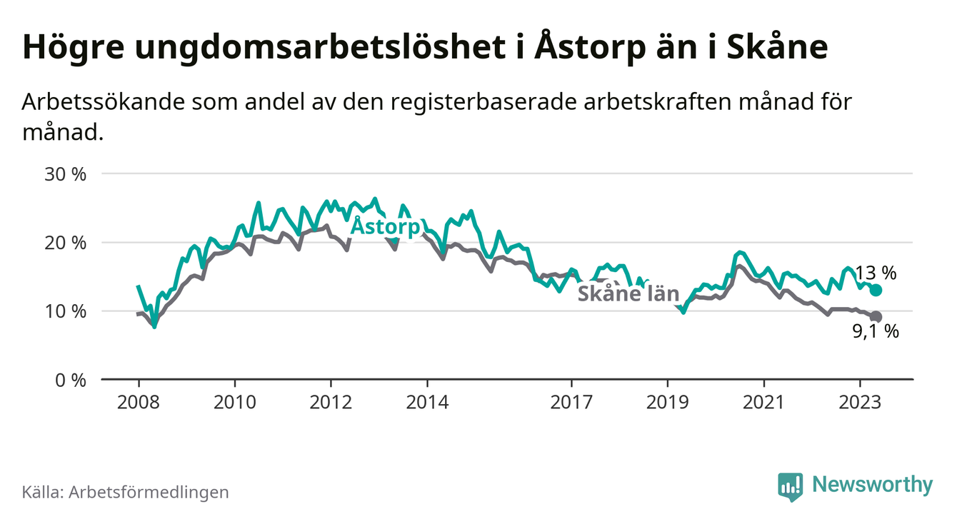 Precis som den totala arbetslösheten ligger ungdomsarbetslösheten i Åstorp högre än i Skåne som helhet. Skillnaden mellan kommunen och länet är 3,9 procentenheter.