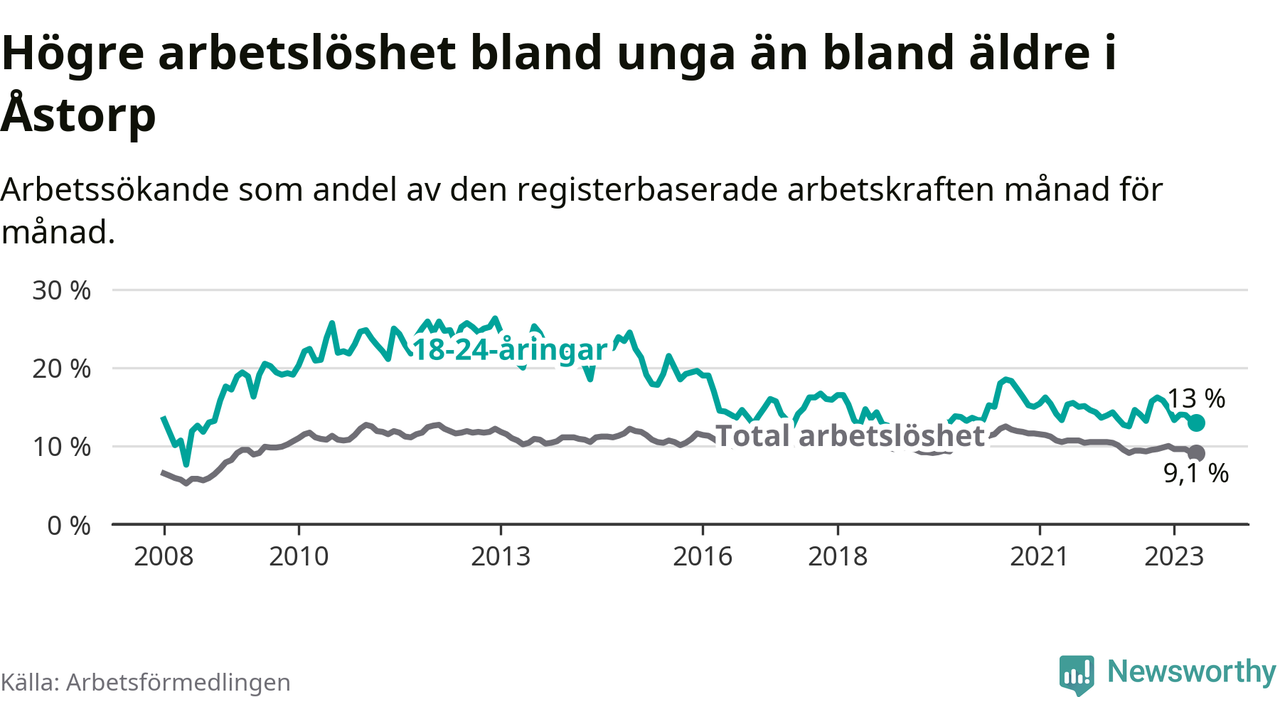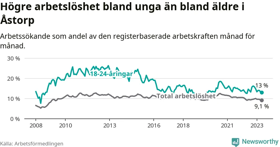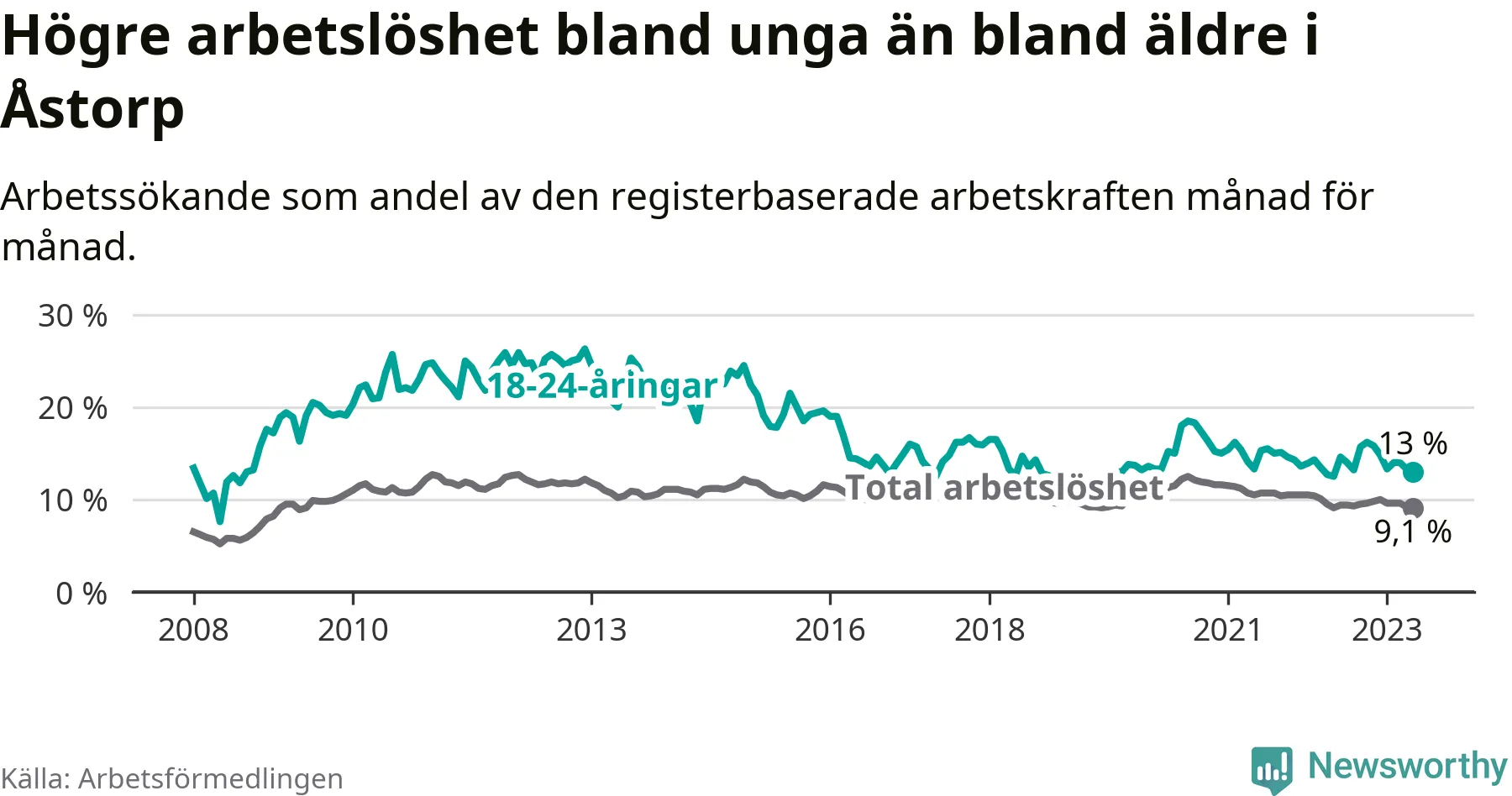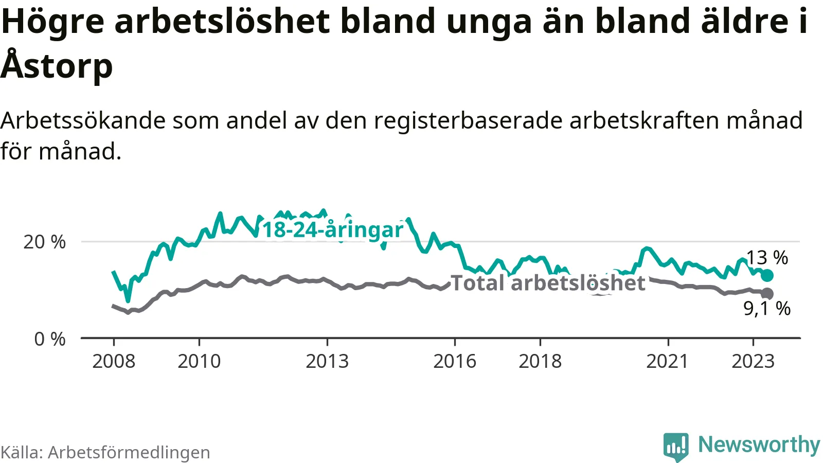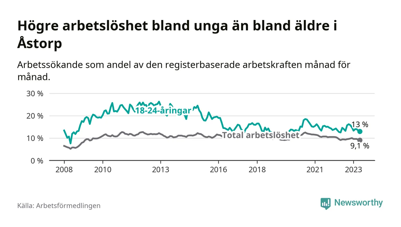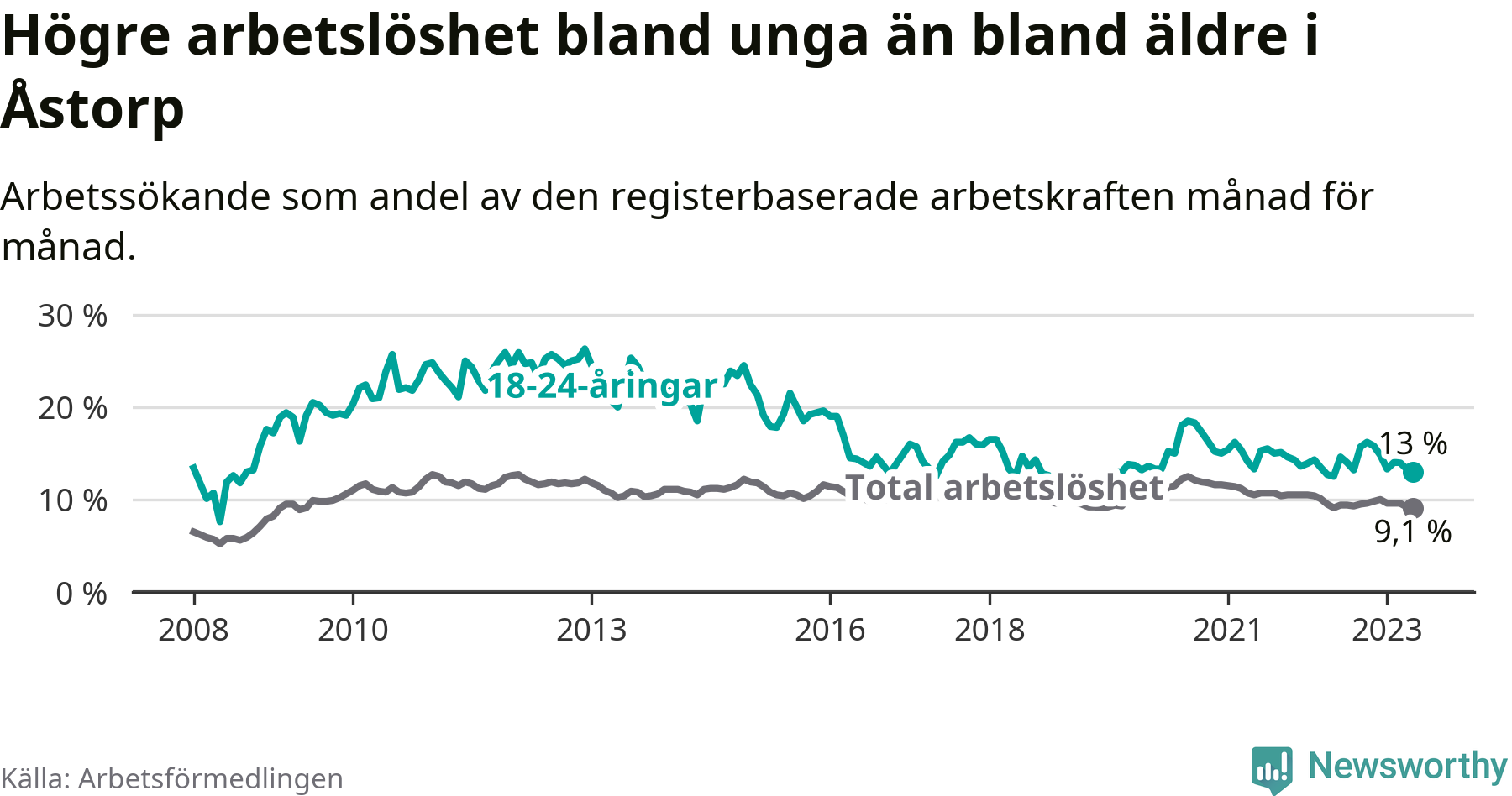 Precis som den totala arbetslösheten ligger ungdomsarbetslösheten i Åstorp högre än i Skåne som helhet. Skillnaden mellan kommunen och länet är 3,9 procentenheter.