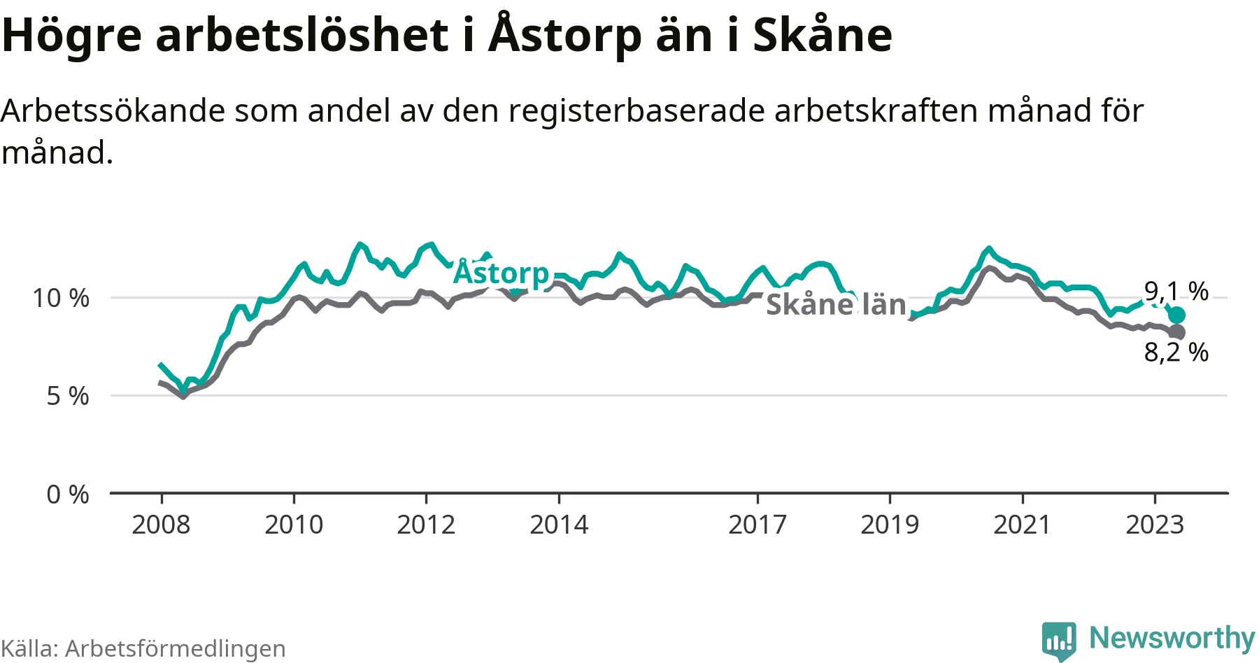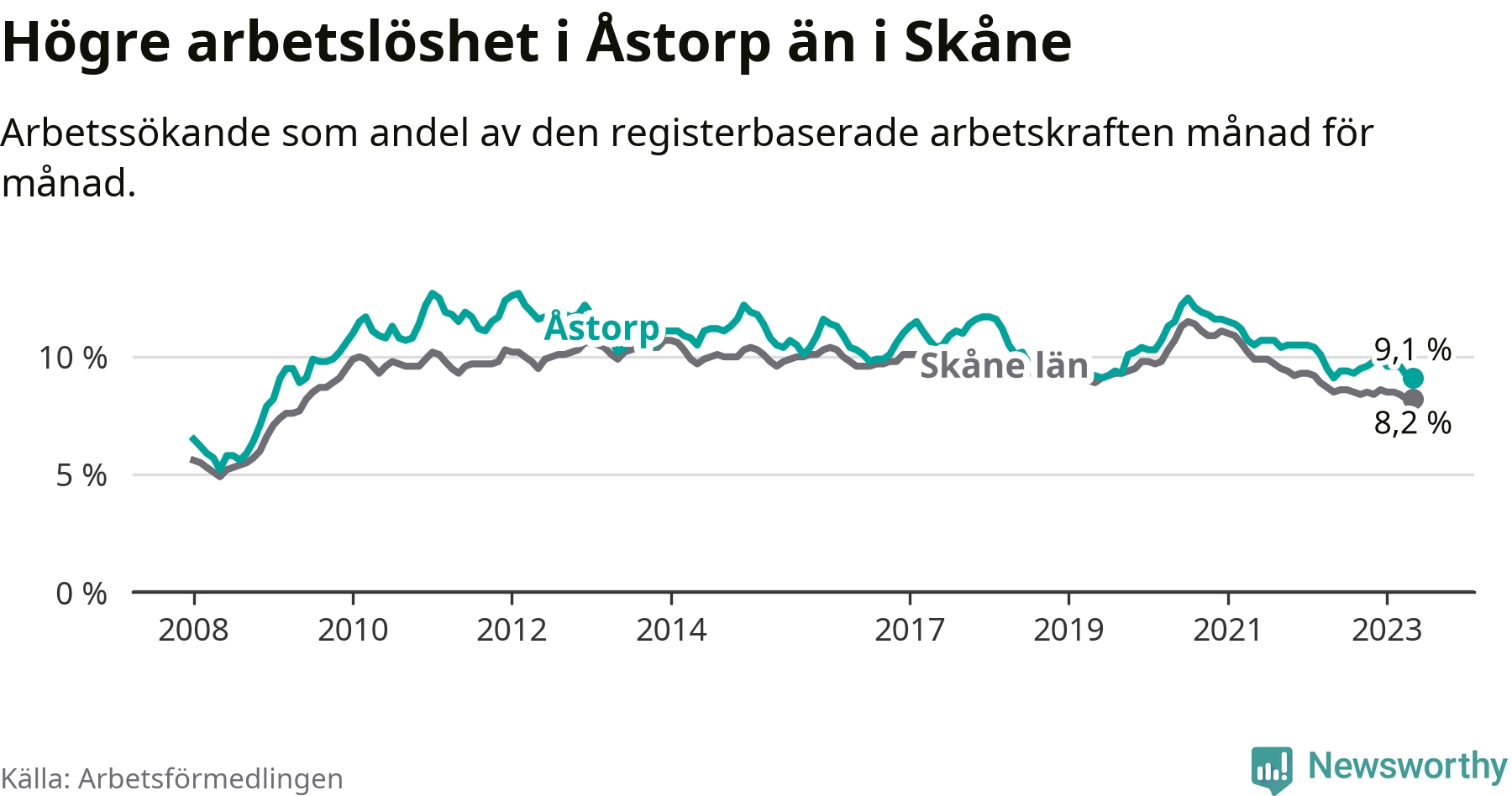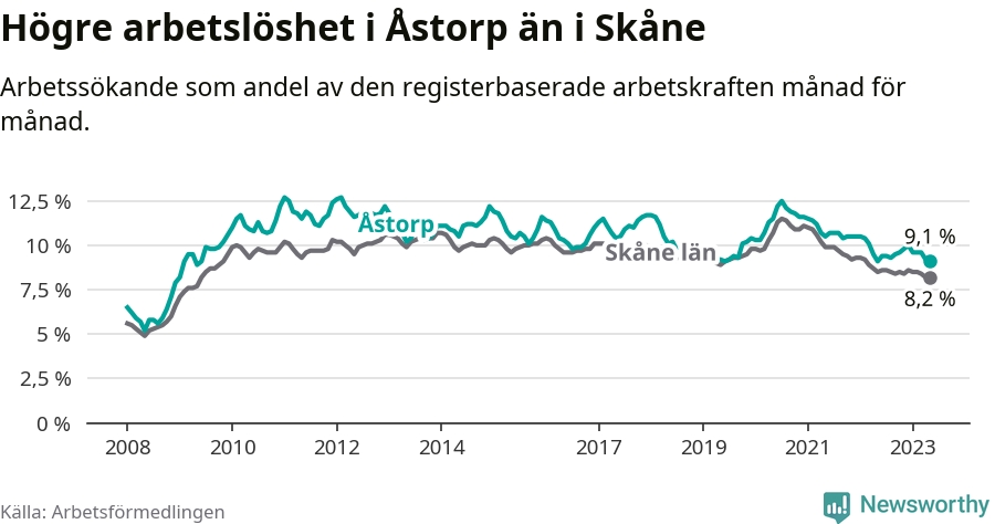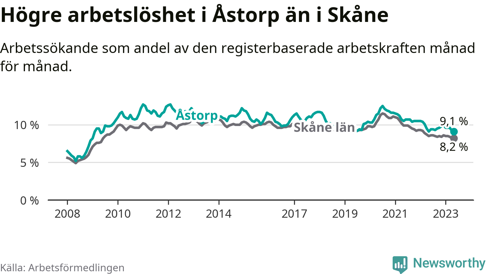 Åstorp går därmed mot strömmen i förhållande till andra kommuner i Skåne län. I de flesta andra kommuner i länet går arbetslösheten nedåt. Störst är minskningen i Eslöv, där arbetslösheten sjunker med 1,0 procentenheter. I tabellen längre ner ser du utvecklingen i samtliga kommuner i länet.