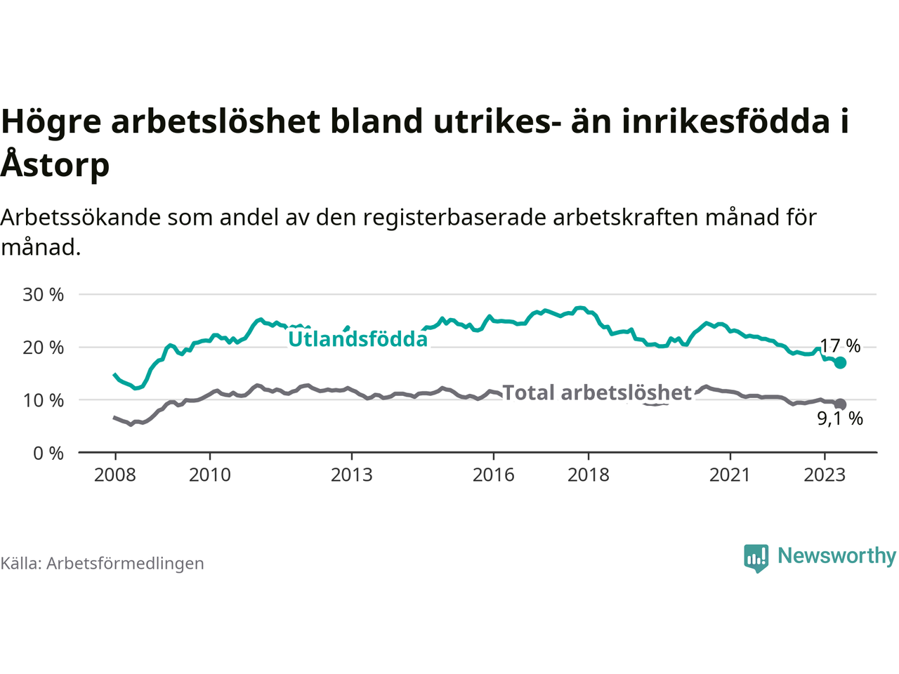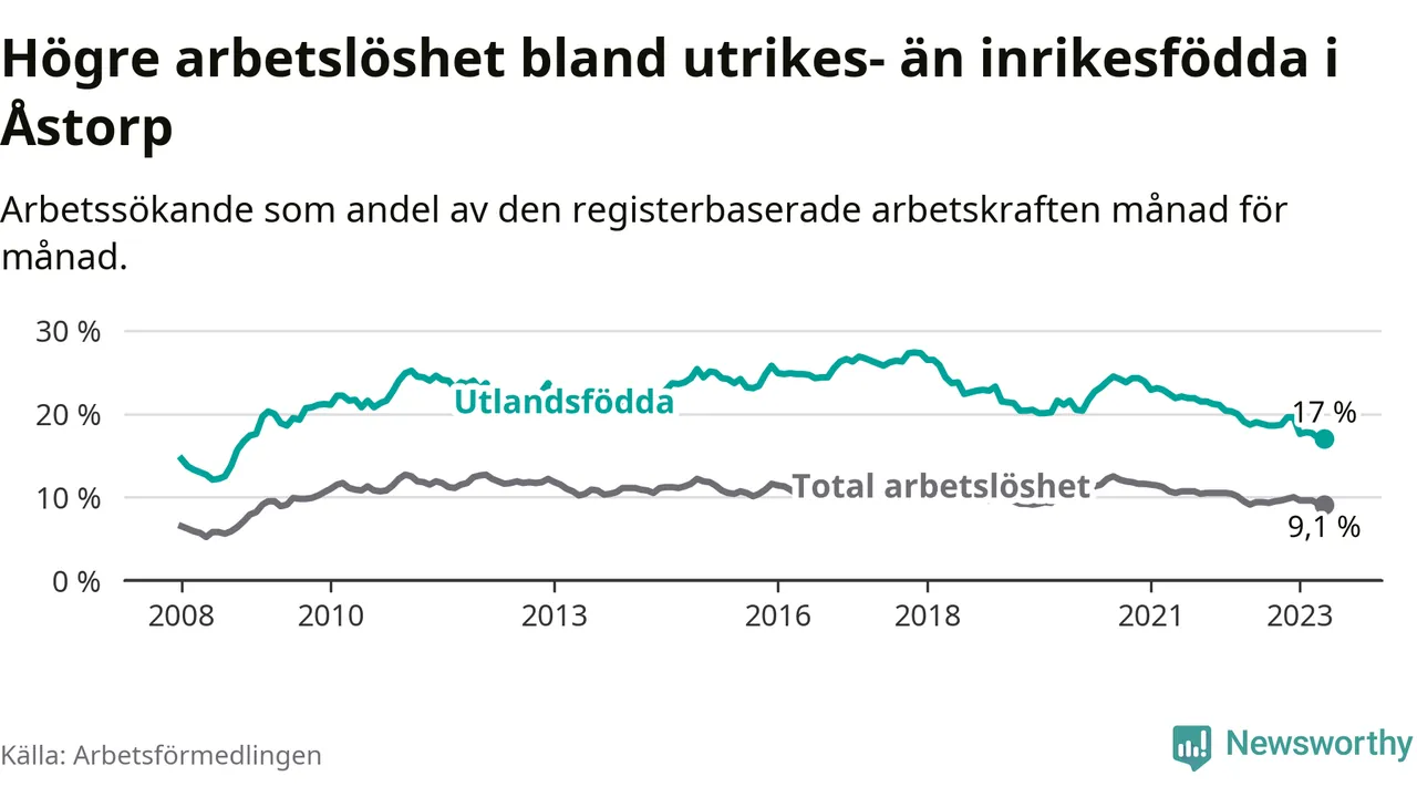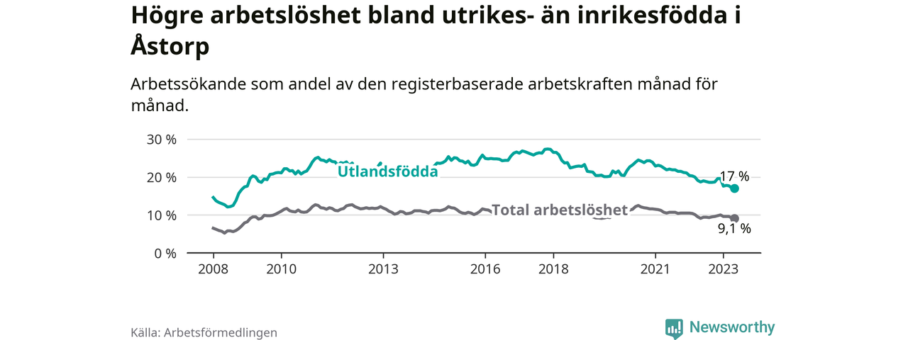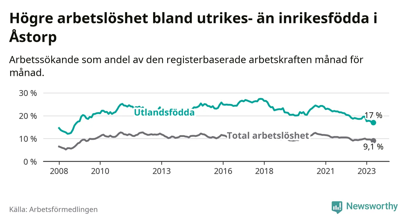 Skillnaden i arbetslöshet mellan utrikesfödda och hela befolkningen är 7,9 procentenheter i Åstorp. Det är en betydligt mindre skillnad än för ett år sedan (−1,7 procentenheter).