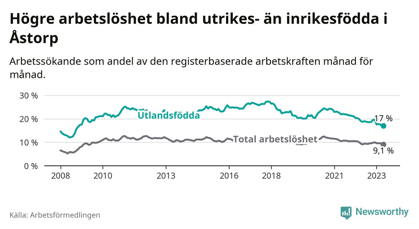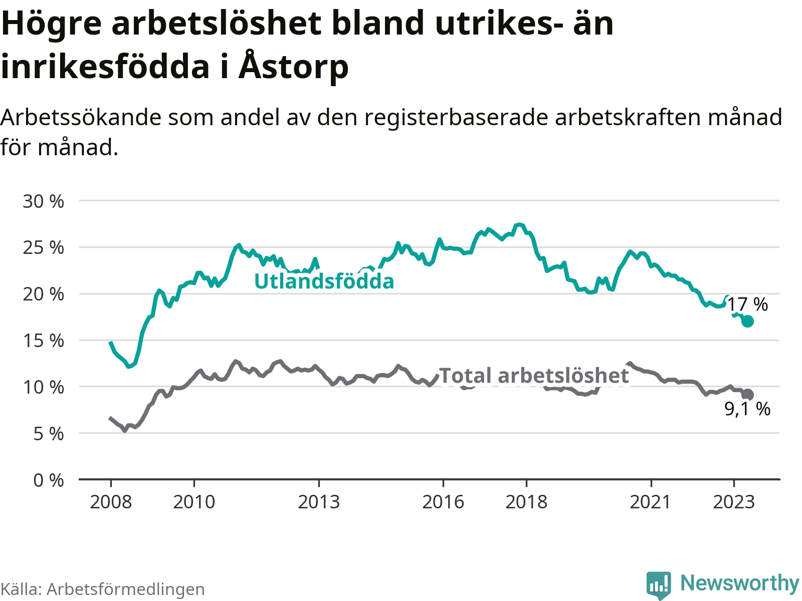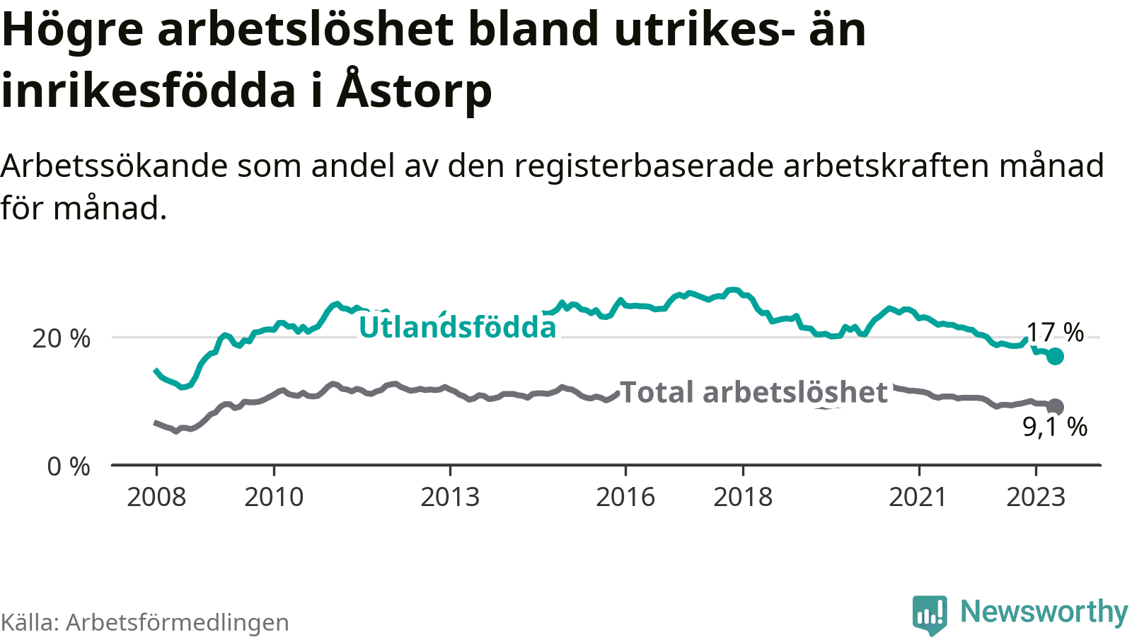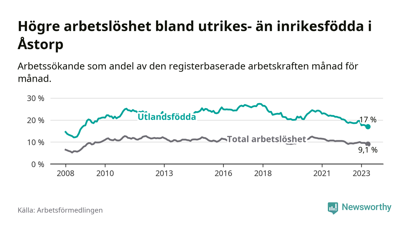 Skillnaden i arbetslöshet mellan utrikesfödda och hela befolkningen är 7,9 procentenheter i Åstorp. Det är en betydligt mindre skillnad än för ett år sedan (−1,7 procentenheter).