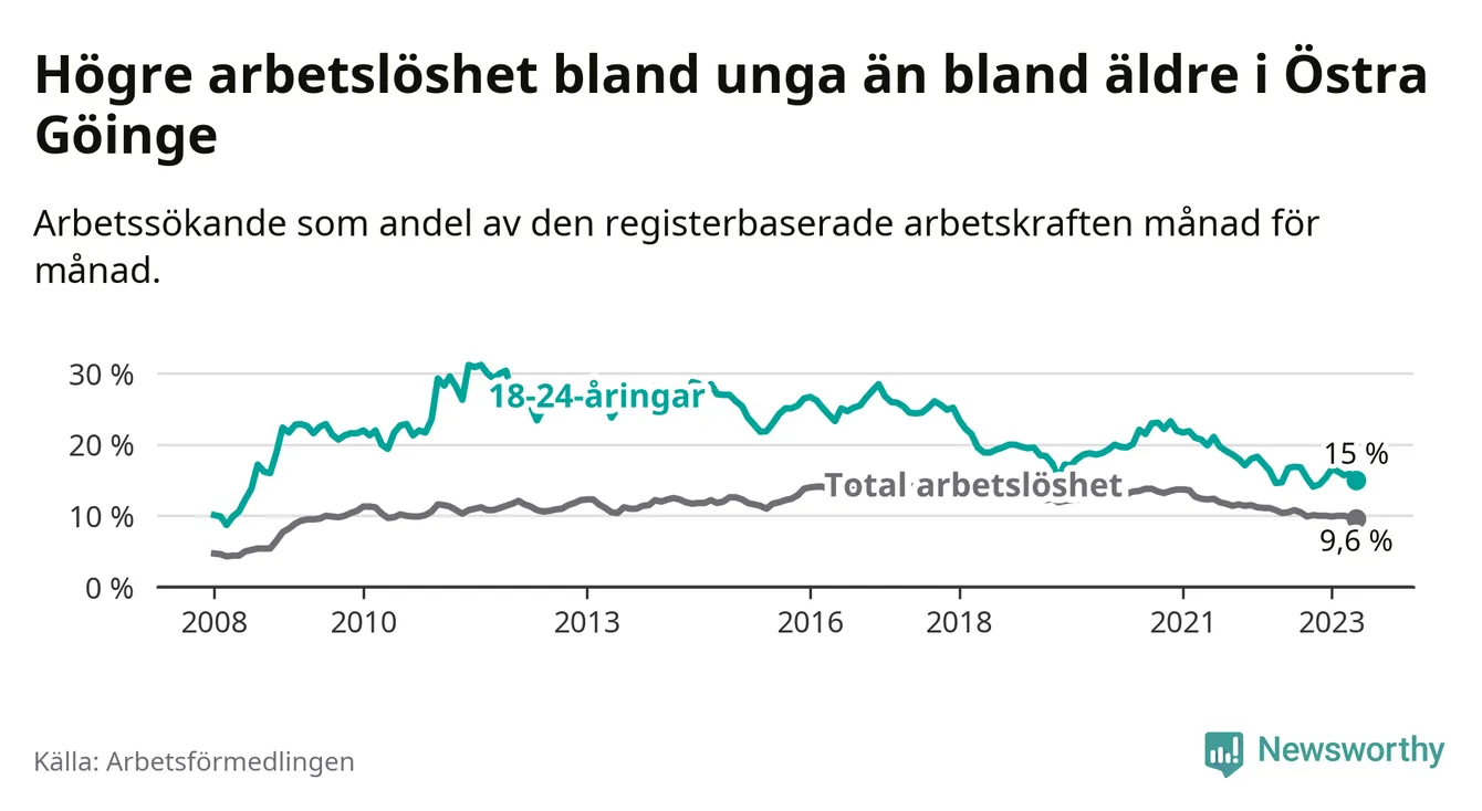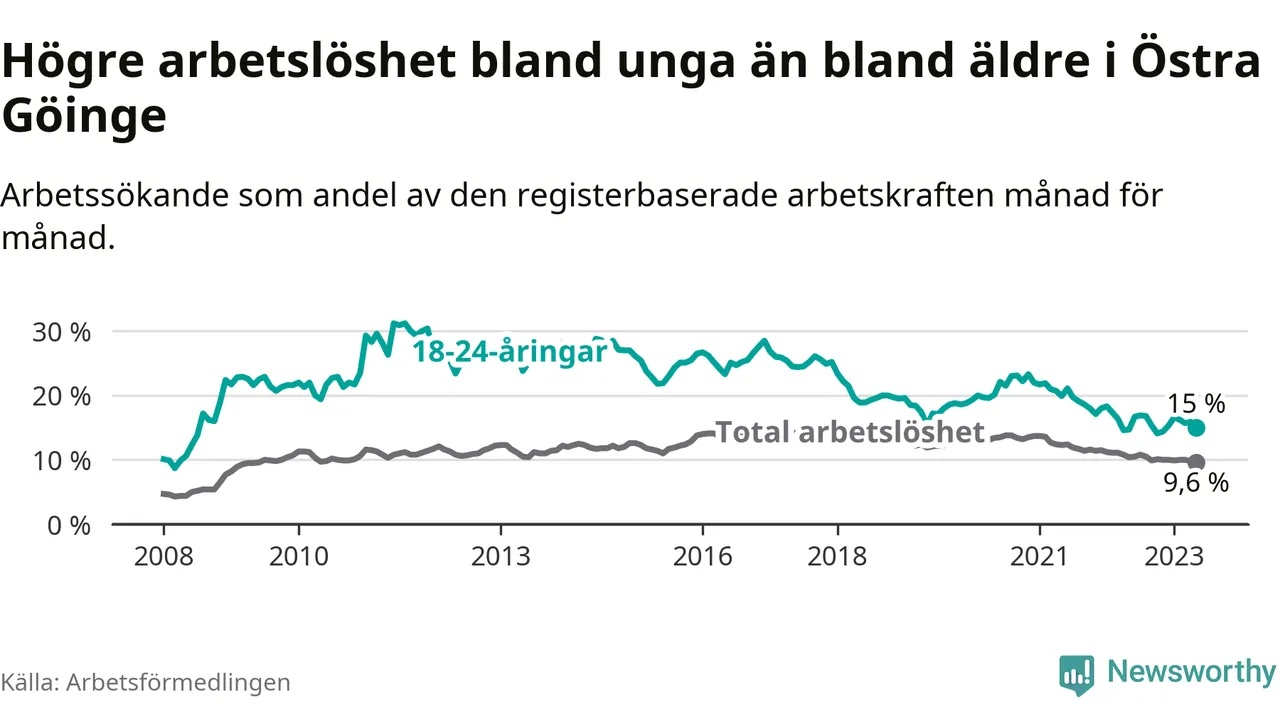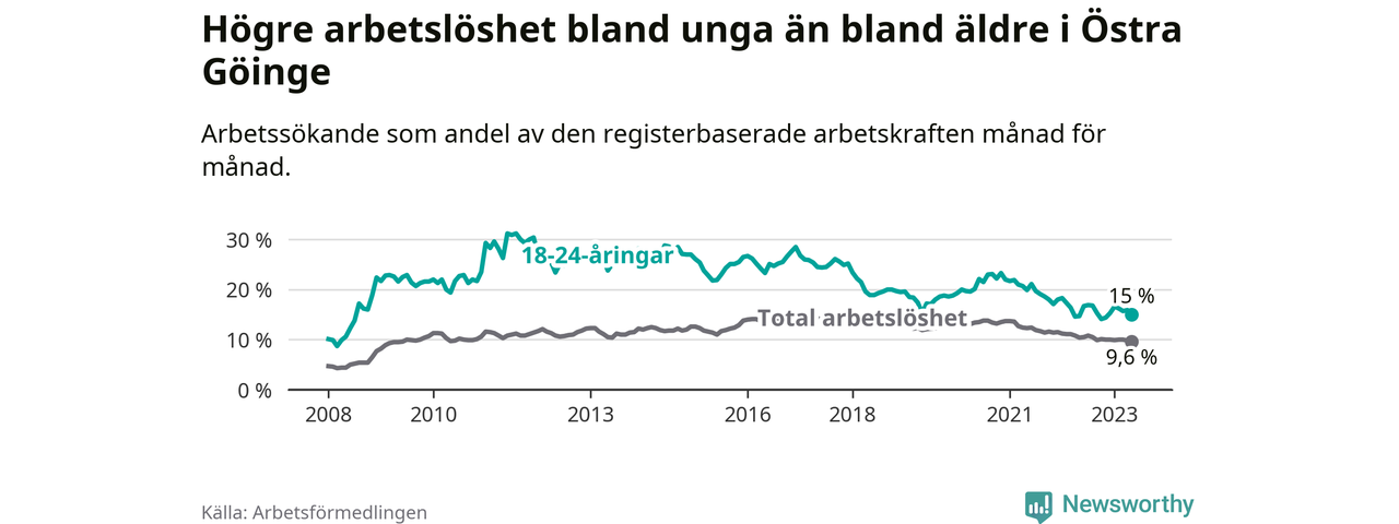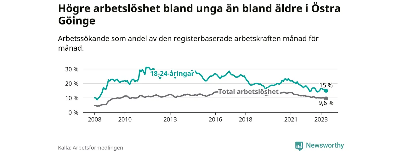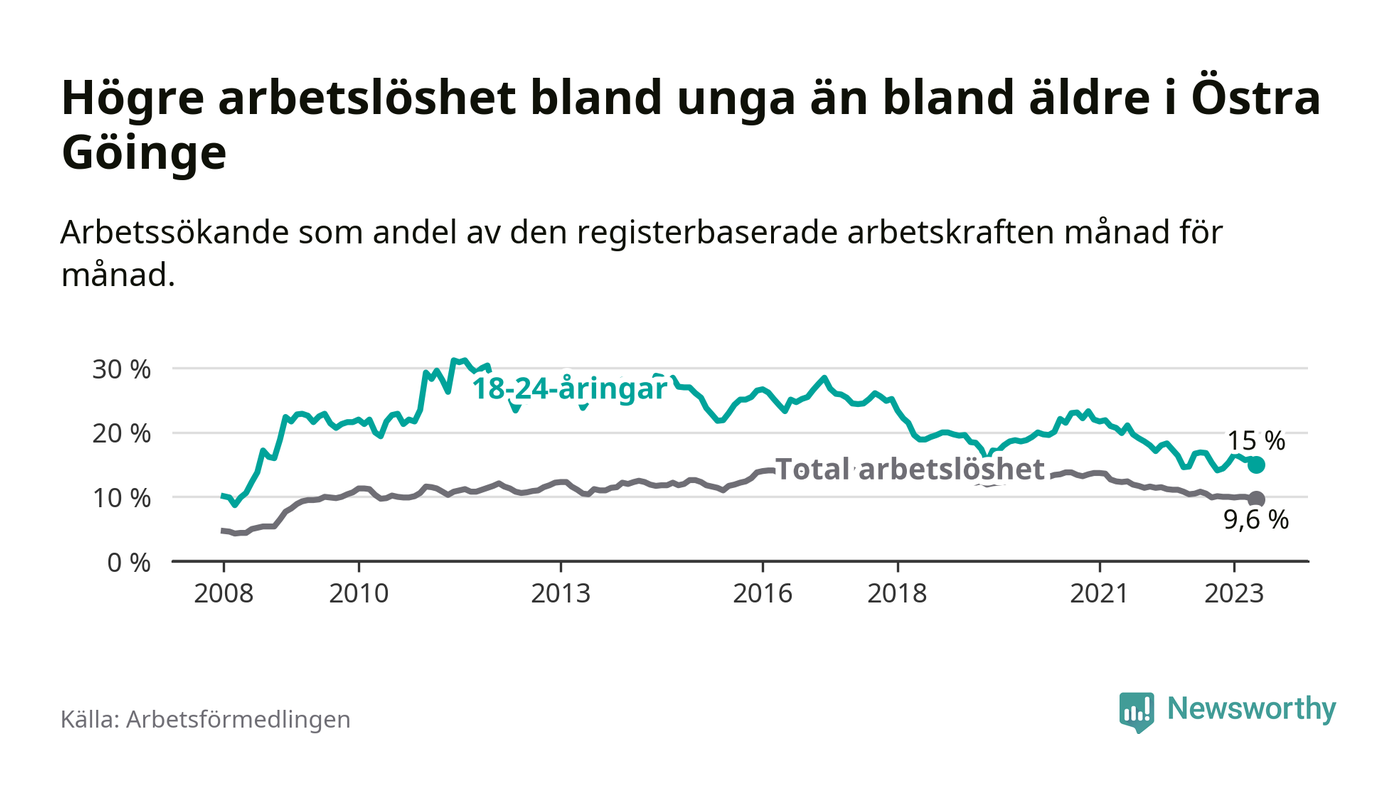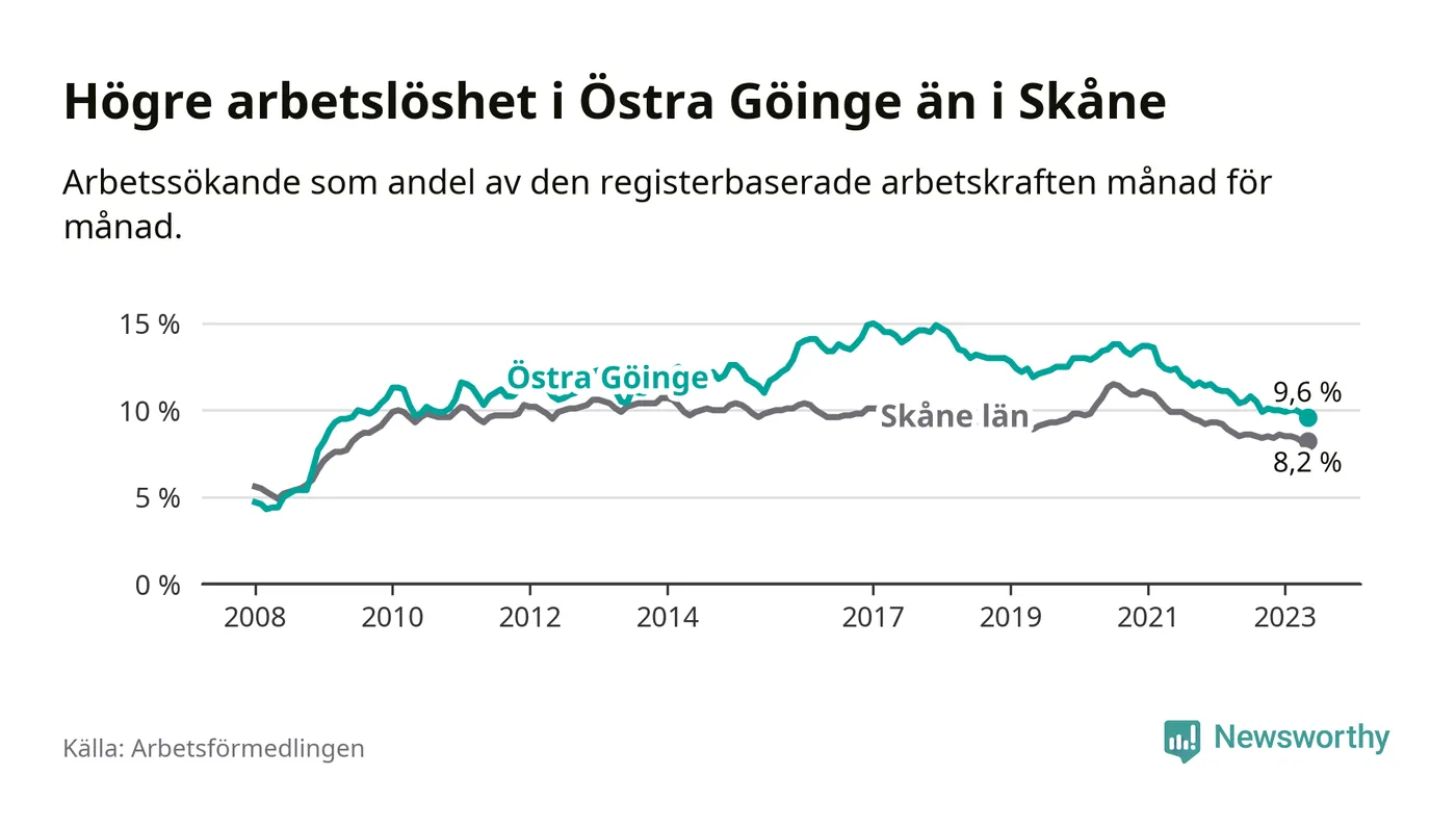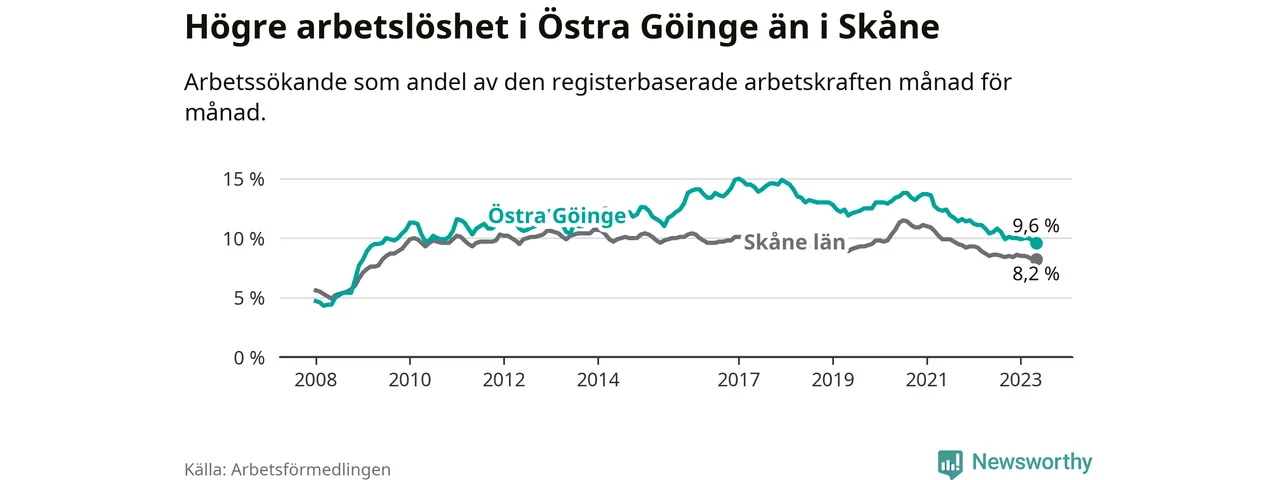 Precis som den totala arbetslösheten ligger ungdomsarbetslösheten i Östra Göinge högre än i Skåne som helhet. Skillnaden mellan kommunen och länet är 5,9 procentenheter.