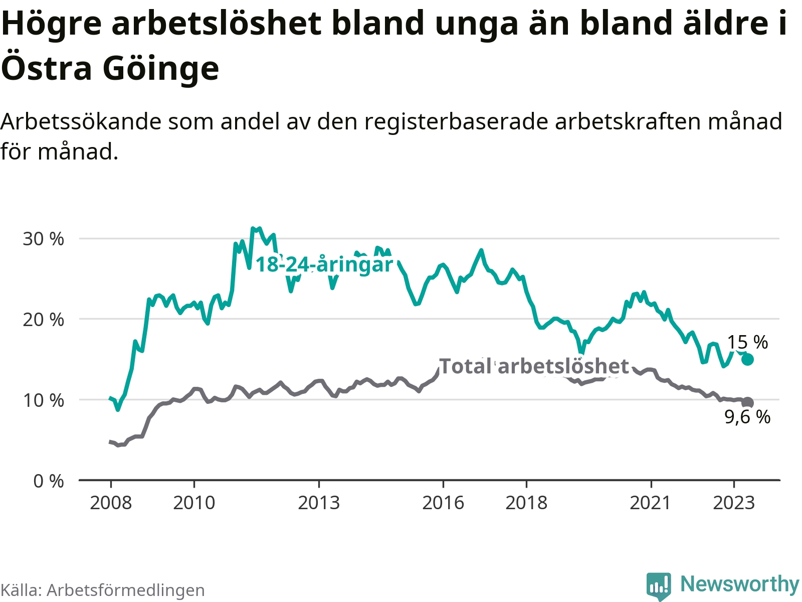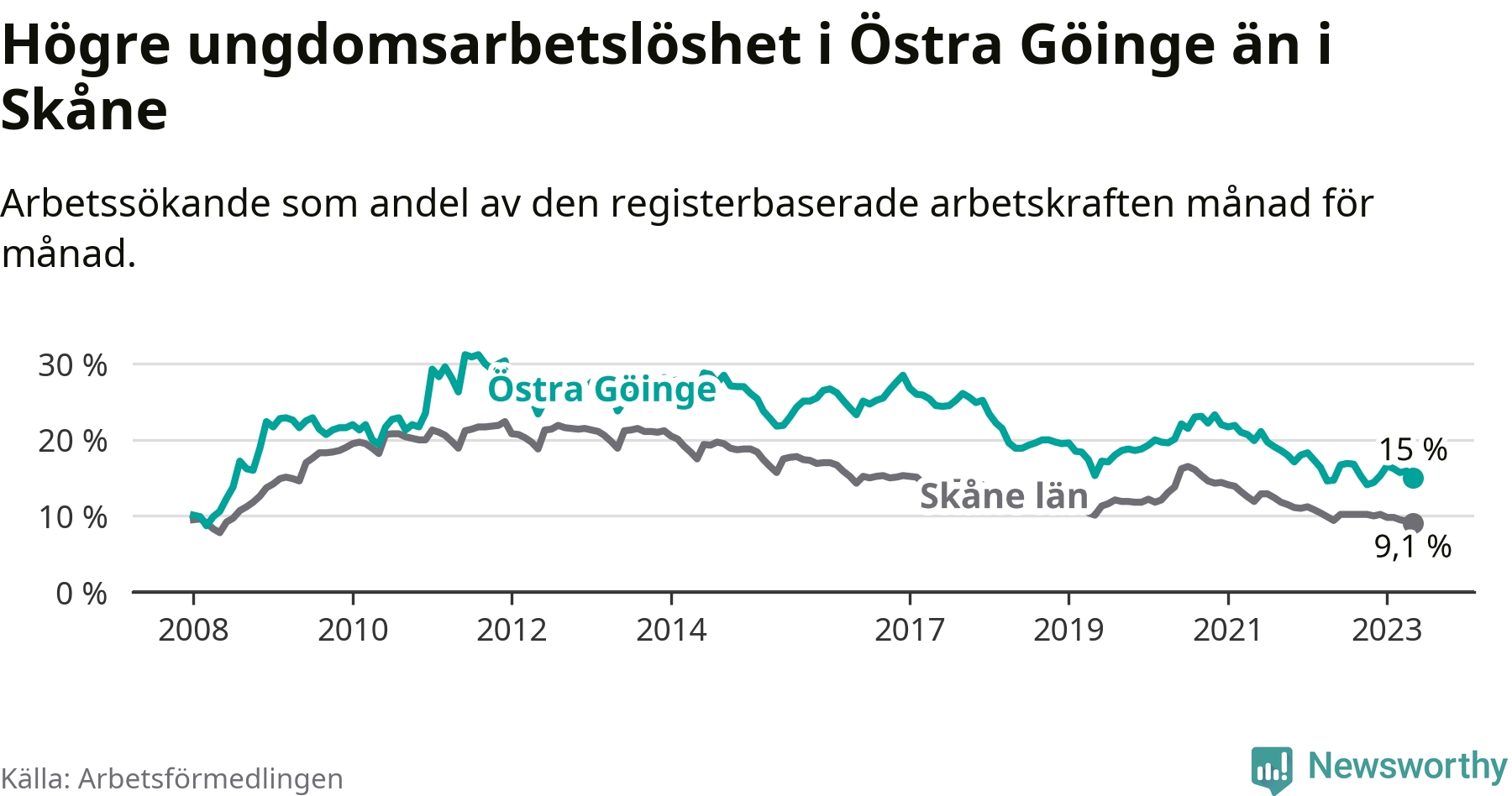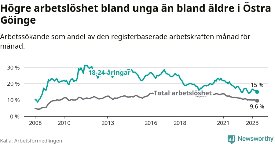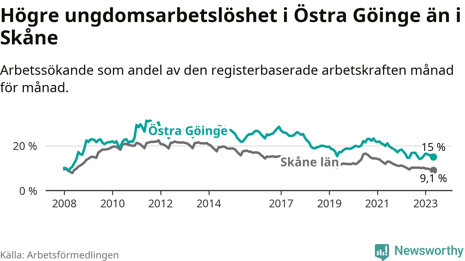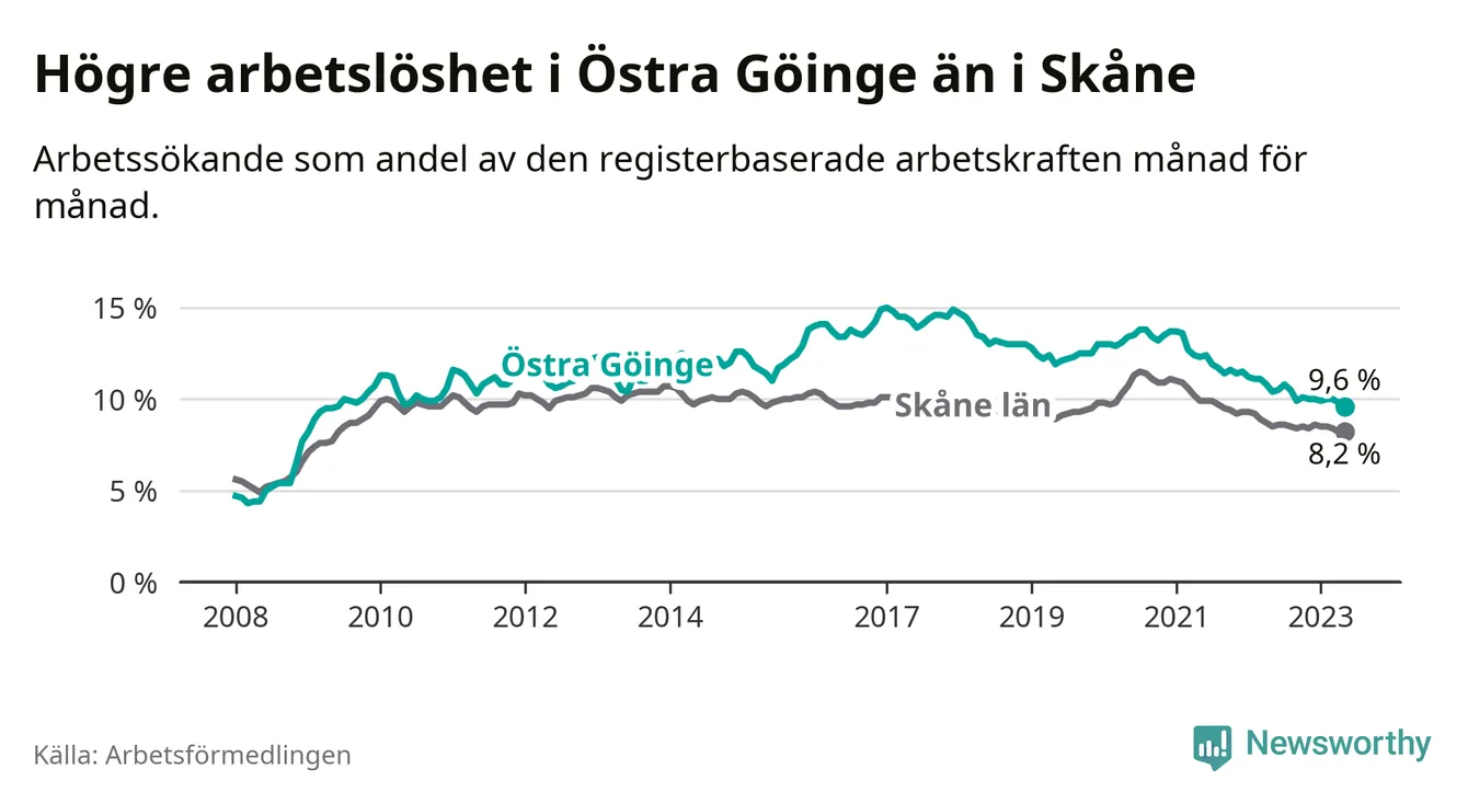 Precis som den totala arbetslösheten ligger ungdomsarbetslösheten i Östra Göinge högre än i Skåne som helhet. Skillnaden mellan kommunen och länet är 5,9 procentenheter.